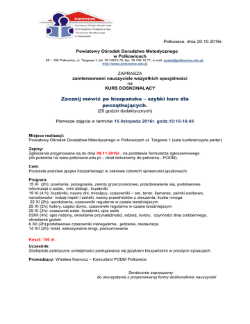 Polkowice, dnia 20.10.2016r. Powiatowy Ośrodek Doradztwa Metodycznego w Polkowicach 59 – 100 Polkowice, ul. Targowa 1, tel. 76 74615 70, fax. 76 746 15 71, e-mail: [email protected], http://www.polkowice.edu.pl ZAPRASZA zainteresowani nauczyciele wszystkich specjalności na KURS DOSKONALĄCY Zacznij mówić po hiszpańsku – szybki kurs dla początkujących. (20 godzin dydaktycznych) Pierwsze zajęcia w terminie 15 listopada 2016r. godz.15:15-16:45 Miejsce realizacji: Powiatowy Ośrodek Doradztwa Metodycznego w Polkowicach ul. Targowa 1 (sala konferencyjna parter) Zapisy: Zgłoszenia przyjmowane są do dnia 09.11.2016r., na podstawie formularza zgłoszeniowego (do pobrania na www.polkowice.edu.pl – dział dokumenty do pobrania - PODM). Cele: Poznanie podstaw języka hiszpańskiego w zakresie czterech sprawności językowych. Program: 15 XI (2h): powitania, pożegnania, zwroty grzecznościowe, przedstawianie się, podstawowe informacje o sobie, mini dialogi , liczebniki 19 XI (4 h): liczebniki, nazwy dni, miesięcy, czasowniki – ser, tener, llamarse, zaimki osobowe, narodowości- rodzaj męski i żeński, nazwy przedmiotów z otoczenia, liczba mnoga 22 XI (2h): upodobania, czasowniki regularne w czasie teraźniejszym 25 XI (2h): kolory, części domu, czasowniki regularne w czasie teraźniejszym 29 XI (2h): czasownik estar, liczebniki, opis osób 03XII (4h): opis rodziny, określanie przynależności, odzież, kolory, czynności dnia codziennego, określanie godzin 6 XII (2h):podstawowe czasowniki nieregularne, jedzenie, restauracja 14 XII (2h): hotel, wskazywanie drogi, podsumowanie Koszt: 150 zł. Uczestnik: Zdobędzie praktyczne umiejętności posługiwania się językiem hiszpańskim w prostych sytuacjach. Prowadzący: Wiesław Ksenycz – Konsultant PODM Polkowice Serdecznie zapraszamy do skorzystania z proponowanej formy doskonalenia nauczycieli ul. Targowa 1, 59-100 Polkowice, telefon 76 746 15 70 faks 76 746 15 71, www.polkowice.edu.pl , e-mail: [email protected]