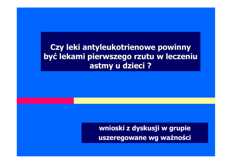 Czy leki antyleukotrienowe powinny być lekami pierwszego rzutu w leczeniu astmy u dzieci ? wnioski z dyskusji w grupie uszeregowane wg waŜności kiedy ICS, kiedy LTRA ? ŁB kiedy ICS, kiedy LTRA ? ŁB budesonid vs montelukast ŁB astma sporadyczna – zaostrzenia - montelukast ŁB Bisgaard H Montelukast reduces asthma exacerbations in 2-5 year old children with intermittent asthma AJRCCM 2005; 171:315-22 1 Astma jest chorobą systemową wartościowe jest dodanie do leków działających miejscowo leków systemowych : immunoterapii alergenowej l. antyleukotrienowych anty IgE 2 Aby zwiększyć skuteczność leczenia astmy Konieczna jest indywidualizacja leczenia uwzględniająca charakterystykę fenotypową i genotypowa dlatego decyzja o włączeniu do leczenia LTRA powinna być zindywidualizowana 3 Przed decyzją terapeutyczną naleŜy uwzględnić wiek dziecka, który ukierunkowuje nasze leczenie np. w związku z: mniejszym zaawansowaniem zmian etiologią wirusową 4 na ustalenie modelu terapeutycznego powinien mieć wpływ takŜe fenotyp astmy np. atopowa nieatopowa indukowana wysiłkiem aspirynowa 5 wiele aspektów przemawia za włączeniem LTRA w leczeniu i prewencji zaostrzeń astmy indukowanej infekcją wirusową w leczeniu astmy indukowanej wysiłkiem jako leczenia alternatywnego np. kiedy nie moŜna lub pacjent nie chce ICS 6 ze względu na stopień zapalenia naleŜy pamiętać, Ŝe ICS są najsilniejszymi lekami p-zapalnymi w przypadku braku kontroli konieczne jest dodanie ICS do LTRA 7 W monitorowaniu skuteczności leczenia, która jest podstawą do zmiany decyzji terapeutycznej… …efekty kliniczne leczenia są waŜniejsze niŜ wartości spirometryczne 8 istotna w monitorowaniu skuteczności jest zwłaszcza ilość nagłych wizyt w ED konieczność podawania dodatkowych leków (np. sCS) 9 okresowe podawanie LTRA teŜ jest uzasadnione sezonowość infekcji wirusowych sezonowość naraŜenia na alergeny jako terapia dodana do ICS 10 w astmie z ANN zdecydowanie naleŜy dodać LTRA do ICS i leków p-histaminowych 11 waŜny, chociaŜ według większości mniej istotny jest teŜ compliance tabletka 1 x dziennie