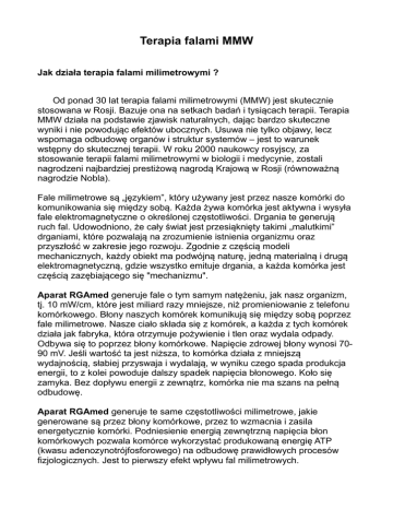 Terapia falami MMW Jak działa terapia falami milimetrowymi ? Od ponad 30 lat terapia falami milimetrowymi (MMW) jest skutecznie stosowana w Rosji. Bazuje ona na setkach badań i tysiącach terapii. Terapia MMW działa na podstawie zjawisk naturalnych, dając bardzo skuteczne wyniki i nie powodując efektów ubocznych. Usuwa nie tylko objawy, lecz wspomaga odbudowę organów i struktur systemów – jest to warunek wstępny do skutecznej terapii. W roku 2000 naukowcy rosyjscy, za stosowanie terapii falami milimetrowymi w biologii i medycynie, zostali nagrodzeni najbardziej prestiżową nagrodą Krajową w Rosji (równoważną nagrodzie Nobla). Fale milimetrowe są „językiem”, który używany jest przez nasze komórki do komunikowania się między sobą. Każda żywa komórka jest aktywna i wysyła fale elektromagnetyczne o określonej częstotliwości. Drgania te generują ruch fal. Udowodniono, że cały świat jest przesiąknięty takimi „malutkimi” drganiami, które pozwalają na zrozumienie istnienia organizmu oraz przyszłość w zakresie jego rozwoju. Zgodnie z częścią modeli mechanicznych, każdy obiekt ma podwójną naturę, jedną materialną i drugą elektromagnetyczną, gdzie wszystko emituje drgania, a każda komórka jest częścią zazębiającego się "mechanizmu". Aparat RGAmed generuje fale o tym samym natężeniu, jak nasz organizm, tj. 10 mW/cm, które jest miliard razy mniejsze, niż promieniowanie z telefonu komórkowego. Błony naszych komórek komunikują się między sobą poprzez fale milimetrowe. Nasze ciało składa się z komórek, a każda z tych komórek działa jak fabryka, która otrzymuje pożywienie i tlen oraz wydala odpady. Odbywa się to poprzez błony komórkowe. Napięcie zdrowej błony wynosi 7090 mV. Jeśli wartość ta jest niższa, to komórka działa z mniejszą wydajnością, słabiej przyswaja i wydalają, w wyniku czego spada produkcja energii, to z kolei powoduje dalszy spadek napięcia błonowego. Koło się zamyka. Bez dopływu energii z zewnątrz, komórka nie ma szans na pełną odbudowę. Aparat RGAmed generuje te same częstotliwości milimetrowe, jakie generowane są przez błony komórkowe, przez to wzmacnia i zasila energetycznie komórki. Podniesienie energią zewnętrzną napięcia błon komórkowych pozwala komórce wykorzystać produkowaną energię ATP (kwasu adenozynotrójfosforowego) na odbudowę prawidłowych procesów fizjologicznych. Jest to pierwszy efekt wpływu fal milimetrowych. Drugi efekt odnosi się do informatyki. Każda komórka posiada receptory informatyczne, które odbierają i nadają informacje z mózgu do innych narządów. Jeżeli receptory te mają zmniejszoną czułość na sygnały hormonalne i bodźce sygnałowe, komórki są mniej wydajne. Receptor może być bardziej lub mniej aktywny. Fale milimetrowe aktywują receptory i tym samym stają się one bardziej czułe i odbierają informacje w sposób bardziej skuteczny. Trzecim efektem działania fal milimetrowych jest poprawa komunikacji komórek. Ciało ludzkie składa się z ok. 70-100 bilionów komórek. Dla utrzymania działania bez zakłóceń tak skomplikowanego systemu, potrzebny jest pewien mechanizm synchronizacji funkcji organizmu. Aparat RGAmed moduluje częstotliwości organizmu w obrębie obszaru, który poddawany jest zabiegowi i działa jak mechanizm synchronizacji. Rekonstruuje on „rytm zdrowia” organizmu, który został utracony w czasie choroby. W ten sposób chroniony jest właściwy i wrodzony system informacyjny kierowania odnową biologiczną organizmu. Jednym z silnych efektów działania fal milimetrowych jest rozrzedzanie krwi. Ma to olbrzymie znaczenie w ochronie przed zawałami i wieloma innymi problemami, zwłaszcza dla ludzi starszych. Fale milimetrowe rozprzestrzeniają się w organizmie poprzez ciecze wewnątrzkomórkowe, receptory skóry oraz linie energetyczne (meridiany), które dzięki rezonansowi rekonstruują i odbudowują drgania błon komórkowych. Poprawia to funkcje komórek i ich komunikację. Testy wykonane w Rosji pokazały, że niezależnie od rodzaju problemu zdrowotnego, fale milimetrowe: • • • • • • • • • • normalizują parametry układu odpornościowego, zwiększają mikro-krążenie, równoważą metabolizm organizmu, opóźniają starzenie i wydłużają długość życia, zapobiegają rozwojowi chorób i przekształceniu ich ze stanu ostrego w stan chroniczny, zmniejszają ryzyko zapadania na choroby onkologiczne, wzmacniają działanie lekarstw oraz redukują ich działania uboczne, skracają okres leczenia, przyspieszają rehabilitację po zawałach i udarach, przyspieszają dwu - trzykrotnie zrastanie kości po złamaniach, posiadają niekwestionowane działanie przynoszenia ulgi w cierpieniu. Ponieważ fale milimetrowe aktywują receptory komórek, które stają się bardziej czułe na hormony i enzymy, mogą być zatem także stosowane przy zabiegach kosmetycznych, w celu stymulacji skóry i redukcji zmarszczek. Skóra staje się z wiekiem mniej wilgotna, ale poprzez wzmocnienie błony komórkowej i poprawę krążenia krwi, może nastąpić "ODBUDOWA ŻYWOTNOŚCI”. Wpływ fal milimetrowych na błony komórek krwi został skrupulatnie przebadany. Zaobserwowano poprawę struktury krwi, generalnie zwiększoną zawartość limfocytów, szczególnie limfocytów T (ważnych czynników dla ochrony odporności) oraz wzrost antyutleniaczy i substancji biologicznie aktywnych. Fale milimetrowe normalizują ważne wskaźniki krzepnięcia krwi oraz są istotne w chorobach sercowo-naczyniowych, w tym zawału serca w wyniku skurczu naczyniowego. Dodatkowo stymulują one wytwarzanie krwi, tak potrzebnej przy leczeniu pacjentów chorych na choroby onkologiczne. Fale milimetrowe wpływają na wypełnienie żył krwią, dynamikę strumienia limfy oraz transportowanie różnych substancji i gazów. Działanie fal milimetrowych odnosi się do wszystkich układów organizmu, uk