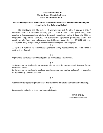 Zarządzenie Nr 33/16 Wójta Gminy Ochotnica Dolna z dnia 26 kwietnia 2016r. w sprawie ogłoszenia konkursu na stanowisko Dyrektora Szkoły Podstawowej im. Jana Pawła II w Ochotnicy Dolnej. Na podstawie art. 36a ust. 1 i 2 w związku z art. 5c pkt. 2 ustawy z dnia 7 września 1991 r. o systemie oświaty (Dz. U. 2015 r. poz. 2156 z późn. zm.), oraz zgodnie z Rozporządzeniem Ministra Edukacji Narodowej z dnia 8 kwietnia 2010 r. w sprawie regulaminu konkursu na stanowisko dyrektora publicznej szkoły lub publicznej placówki oraz trybu pracy komisji konkursowej (Dz. U. z 2010 Nr 60, poz. 373 z późn. zm.); Wójt Gminy Ochotnica Dolna zarządza co następuje: §1 1. Ogłaszam konkurs na stanowisko Dyrektora Szkoły Podstawowej im. Jana Pawła II w Ochotnicy Dolnej. §2 Ogłoszenie konkursu stanowi załącznik do niniejszego zarządzenia. §3 1. Ogłoszenie o konkursie zamieszcza się na stronie internetowej Urzędu Gminy Ochotnica Dolna. 2. Ogłoszenie o konkursie podlega zamieszczeniu na tablicy ogłoszeń w budynku Urzędu Gminy Ochotnica Dolna. §4 Wykonanie zarządzenia powierza się Kierownikowi Referatu Oświaty i Administracji. §5 Zarządzenie wchodzi w życie z dniem podpisania. WÓJT GMINY Stanisław Jurkowski Załącznik do Zarządzenia Nr 33/16 Wójta Gminy Ochotnica Dolna z dnia 26 kwietnia 2016 r. Wójt Gminy Ochotnica Dolna ogłasza konkurs na stanowisko Dyrektora Szkoły Podstawowej im. Jana Pawła II w Ochotnicy Dolnej. §1 1. Do konkursu może przystąpić osoba, która spełnia wymagania określone w Rozporządzeniu Ministra Edukacji Narodowej z dnia 27 października 2009 r. w sprawie wymagań, jakim powinna odpowiadać osoba zajmująca stanowisko dyrektora oraz inne stanowisko kierownicze w poszczególnych typach publicznych szkół i rodzajach publicznych placówek (Dz. U. z 2009 Nr 184, poz. 1436 z późn. zm.). §2 I. Oferty osób przystępujących do konkursu powinny zawierać: 1) uzasadnienie przystąpienia do konkursu oraz koncepcję funkcjonowania i rozwoju szkoły; 2) poświadczoną przez kandydata za zgodność z oryginałem kopię dowodu osobistego lub innego dokumentu potwierdzającego tożsamość oraz poświadczającego obywatelstwo kandydata; 3) życiorys z opisem przebiegu pracy zawodowej, zawierający w szczególności informację o: stażu pracy pedagogicznej – w przypadku nauczyciela stażu pracy dydaktycznej – w przypadku nauczyciela akademickiego stażu pracy, w tym stażu pracy na stanowisku kierowniczym – w przypadku osoby niebędącej nauczycielem; 4) oryginały lub poświadczone przez kandydata za zgodność z oryginałem kopie dokumentów potwierdzających posiadanie wymaganego stażu pracy; 5) oryginały lub poświadczone przez kandydata za zgodność z oryginałem kopie dokumentów potwierdzających posiadanie wymaganego wykształcenia, w tym dyplom ukończenia studiów wyższych lub studiów podyplomowych z zakresu zarządzania albo świadectwa o ukończeniu kursu kwalifikacyjnego z zakresu zarządzania oświatą; 6) zaświadczenie lekarskie o braku przeciwwskazań zdrowotnych do wykonania pracy na stanowisku kierowniczym; 7) oświadczenie, że przeciwko kandydatowi nie toczy się postępowanie o przestępstwo ścigane z oskarżenia publicznego lub postępowanie dyscyplinarne 8) oświadczenie, że kandydat nie był skazany prawomocnym wyrokiem za umyślne przestępstwo lub umyślne przestępstwo skarbowe; 9) oświadczenie, że kandydat nie był karany zakazem pełnienia funkcji związanych z dysponowaniem środkami publicznymi, o których mowa w art. 31 ust.1 pkt. 4 ustawy z dnia 17 grudnia z 2004r. o odpowiedzialności za naruszenie dyscypliny finansów publicznych (Dz. U. z 2005 r. Nr 14, poz. 114 z późn.zm.); 10) oświadczenie o dopełnieniu obowiązku, o którym mowa w art. 7 ust. 1 i ust. 3a ustawy z dnia 18 października 2006 r. o ujawnianiu informacji o dokumentach organów bezpieczeństwa państwa z lat 1944-1990 oraz treści tych dokumentów (Dz. U. z 2007 r. Nr 63, poz. 425 z późn. zm.); 11) oryginału lub poświadczonej przez kandydata za zgodność z oryginałem kopii aktu nadania stopnia nauczyciela mianowanego lub dyplomowanego- w przypadku nauczyciela; 12) oryginału lub poświadczonej przez kandydata za zgodność z oryginałem kopii karty oceny pracy lub oceny dorobku zawodowego – w przypadku nauczyciela i nauczyciela akademickiego; 13) oświadczenie, że kandydat nie był karany karą dyscyplinarną, o której mowa w art. 76 ust.1 ustawy z dnia 26 stycznia 1982 r. – Karta Nauczyciela (Dz. U. z 2006 r. Nr 97, poz.674 z późn. zm.) lub w art.140 ust.1 ustawy z dnia 27 lipca 2005 r. – Prawo o szkolnictwie wyższym (Dz. U. Nr 164 poz. 1365 z późn. zm.) - w przypadku nauczyciela lub nauczyciela akademickiego; 14)oświadczenie, że kandydat ma pełną zdolność do czynności prawnych i korzysta z pełni praw publicznych – w przypadku osoby niebędącej nauczycielem; 15) oświadczenie, że kandydat wyraża zgodę na przetwarzanie swoich danych osobowych zgodnie z ustawą z dnia 29 sierpnia 1997 r. o ochronie danych osobowych (Dz. U. z 2002 r. Nr 101, poz.926 z późn. zm.); w celach przeprowadzenia konkursu na stanowisko dyrektora. §3 1. Kandydaci przystępujący do konkursu składają oferty w zamkniętych kopertach z podanym adresem zwrotnym i dopiskiem „Konkurs na stanowisko Dyrektora Szkoły Podstawowej im. Jana Pawła II w Ochotnicy Dolnej” w terminie do dnia 11 maja 2016r., do godz. 15-tej, w Sekretariacie Urzędu Gminy Ochotnica Dolna, os. Dłubacze 160, pok. 15. 2. W przypadku nadesłania ofert pocztą liczy się data wpływu do Urzędu. §4 1. Konkurs przeprowadzi komisja konkursowa powołana przez Wójta Gminy Ochotnica Dolna odrębnym zarządzeniem. 2. O terminie i miejscu przeprowadzenia postępowania konkursowego kandydaci zostaną powiadomieni indywidualnie. WÓJT GMINY Stanisław Jurkowski