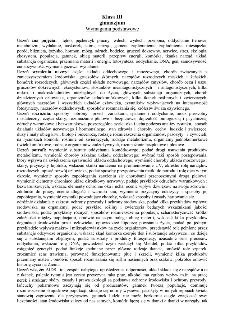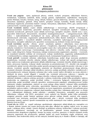 Klasa III gimnazjum Wymagania podstawowe Uczeń zna pojęcia: tętno, pęcherzyk płucny, wdech, wydech, przepona, oddychanie tlenowe, metabolizm, wydalanie, naskórek, skóra, narząd, gameta, zaplemnienie, zapłodnienie, miesiączka, poród, bliźnięta, łożysko, hormon, mózg, odruch, bodziec, gruczoł dokrewny, nerwice, stres, ekologia, ekosystem, populacja, gatunek, obieg materii, przepływ energii, komórka, tkanka narząd, układ, substancja organiczna, przemiana materii i energii, fotosynteza, oddychanie, DNA, gen, samożywność, cudzożywność, wymiana gazowa, wydalanie. Uczeń wymienia nazwy: części układu oddechowego i moczowego, chorób związanych z zanieczyszczeniem środowiska, gruczołów skórnych, narządów rozrodczych męskich i żeńskich, komórek rozrodczych, głównych części układu nerwowego, narządów zmysłów, chorób oczu i uszu, gruczołów dokrewnych. ekosystemów, stosunków nieantagonistycznych i antagonistycznych, kilku mikro- i makroskładników niezbędnych do życia, głównych substancji organicznych, chorób dziedzicznych człowieka, organizmów jednokomórkowych, kilku tkanek roślinnych i zwierzęcych, głównych narządów i wszystkich układów człowieka, czynników wpływających na intensywność fotosyntezy, narządów oddechowych, sposobów rozmnażania się, królestw świata ożywionego. Uczeń rozróżnia: sposoby obrony przed zarazkami, spalanie i oddychanie, mocz pierwotny i ostateczny, części skóry, rozmnażanie płciowe i bezpłciowe, dojrzałość biologiczną i psychiczną, odruchy warunkowe i bezwarunkowe, poszczególne części oka i ucha podczas analizy rysunku, sposób działania układów nerwowego i hormonalnego, stan zdrowia i choroby. cechy ludzkie i zwierzęce, duży i mały obieg krwi, biotop i biocenozę, rodzaje rozmieszczenia organizmów, pasożyty i żywicieli, na rysunkach komórki roślinne od zwierzęcych, rodzaje metabolizmu, organizmy jednokomórkowe i wielokomórkowe, rodzaje organizmów cudzożywnych, rozmnażanie bezpłciowe i płciowe. Uczeń potrafi: wymienić substraty oddychania komórkowego, podać drogi usuwania produktów metabolizmu, wymienić choroby zakaźne układu oddechowego; wybrać taki sposób postępowania, który wpływa na zwiększenie sprawności układu oddechowego, wymienić choroby układu moczowego i skóry, przyczyny łojotoku, wskazać skutki narażenia na promieniowanie UV, określić rolę narządów rozrodczych, opisać rozwój człowieka, podać sposoby przygotowania matki do porodu i rolę ojca w tym okresie, wymienić sposoby zapobiegania zarażeniu się chorobami przenoszonymi drogą płciową, wymienić elementy chroniące układ ośrodkowy nerwowy, podaje przykłady odruchów warunkowych i bezwarunkowych, wskazać elementy ochronne oka i ucha, ocenić wpływ dźwięków na swoje zdrowie i zdolność do pracy, ocenić długość i warunki snu, wymienić przyczyny cukrzycy i sposoby jej zapobiegania, wymienić czynniki powodujące choroby, wskazać sposoby i zasady hartowania się. odróżnić działania z zakresu ochrony przyrody i ochrony środowiska, podać kilka przykładów wpływu środowiska na organizmy, podać przykład rośliny i zwierzęcia będących wskaźnikami jakości środowiska, podać przykłady różnych sposobów rozmieszczenia populacji, scharakteryzować krótko zależności między populacjami, omówić na czym polega obieg materii, wskazać kilka przykładów degradacji środowiska przez człowieka, opowiedzieć hipotezę powstania życia, podać po jednym przykładzie wpływu makro- i mikropierwiastków na życie organizmów, przedstawić role pełnione przez substancje odżywcze organiczne, wskazać skąd komórka czerpie tlen i substancje odżywcze i co dzieje się z substancjami zbędnymi, podać substraty i produkty fotosyntezy, uzasadnić sens procesów oddychania, wskazać rolę DNA, powiedzieć czym zasłużył się Mendel, podać kilka przykładów osiągnięć genetyki, podać funkcje spełniane przez główne rodzaje tkanek, omówić rolę szparek, zrozumieć sens trawienia, porównać funkcjonowanie płuc i skrzeli, wymienić kilka produktów przemiany materii, omówić sposób rozmnażania się roślin nasiennych oraz ssaków, pokrótce omówić historię życia na Ziemi. Uczeń wie, że: AIDS to zespół nabytego upośledzenia odporności, układ składa się z narządów a te z tkanek, palenie tytoniu jest często przyczyną raka płuc, alkohol ma zgubny wpływ m.in. na pracę nerek i strukturę skóry, zasady i prawa ekologii są podstawą ochrony środowiska i ochrony przyrody, łańcuchy pokarmowe zaczynają się od producentów, gatunek tworzą populacje, dominuje rozmieszczenie skupiskowe populacji, stosuje się normy wysiewu, pasożyty w innych rejonach świata stanowią zagrożenie dla przybyszów, gatunek ludzki nie może bezkarnie ciągle zwiększać swej liczebności, stan środowiska zależy od nas samych, komórki łączą się w tkanki a tkanki w narządy, tak nadmiar jak i niedobór pierwiastków szkodzi zdrowiu, właściwa dieta sprzyja zdrowiu, geny to fragmenty DNA odpowiedzialne za wystąpienie jakiejś cechy, katabolizm jest przeciwieństwem anabolizmu, dziedziczenie płci u ludzi związane jest z chromosomami X i Y, można nie chorować a jedynie być nosicielem choroby, tylko niewielka część energii słonecznej jest absorbowana w procesie fotosyntezy, życie na Ziemi zależy od fotosyntezy, organizmy po śmierci rozkładane są przez destruentów, największy wpływ na budowę układu pokarmowego ma rodzaj pokarmu, w drodze ewolucji wykształcały się coraz to bardziej skomplikowane struktury organizmów, nie należy sypać soli w pobliżu roślin, organizmy przy swojej różnorodności mają wiele wspólnych cech. Uczeń wyjaśnia: funkcje krwi, związek między alkoholem i nikotyną a chorobami układu krążenia, jaki tryb życia prowadzi do zawału serca, rolę poszczególnych części układu od