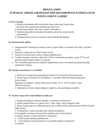 REGULAMIN TURNIEJU MIKOŁAJKOWEGO POD HONOROWYM PATRONATEM WÓJTA GMINY LASZKI I. Cele Turnieju 1. Rozpowszechnienie piłki nożnej jako formy zdrowego wypoczynku i rekreacji oraz promowanie sportowego stylu życia. 2. Promowanie kultury fizycznej i sportu wśród dzieci. 3. Popularyzacja piłki nożnej jako dyscypliny sportowej, jej przepisów i ceremoniału. 4. Propagowanie uczciwej rywalizacji oraz kulturalnego dopingu II. Postanowienia ogólne 1. Organizatorem Turnieju jest Gmina Laszki, Zespół Szkół w Laszkach oraz UKS „Jedynka’’ Laszki 2. Patronem rozgrywek jest Wójt Gminy Laszki 3. Szkoły do rozlosowania zostały wybrane alfabetycznie. 4. Turniej rozegrany zostanie w dniu 06.12.2015 r (niedziela), początek o godz.1200 na sali gimnastycznej Zespołu Szkół w Laszkach. 5. We wszystkich sprawach nie objętych regulaminem oraz w kwestiach spornych decyduje organizator turnieju. III. Zasady uczestnictwa w zawodach 1. Drużyny do rozgrywek mogą zgłaszać Szkoły i Uczniowskie Kluby Sportowe. 2. Zespół stanowi minimum 6 zawodników z rocznika 2006 lub młodsi (mogą grać dziewczynki). Zgłoszeń zawodników należy dokonywać do dnia 30.11. 2015 na adres e-mail [email protected] 3. Opiekunowie drużyn odpowiadają za zespół w czasie przebiegu zawodów. IV. System rozgrywek i najważniejsze zasady gry 1. Rozgrywki będą prowadzone zgodnie z ustalonym terminarzem. 2. Zasady punktowania za wygrany mecz 3 pkt, remis 1 pkt, przegrana 0 pkt. 3. Mecze rozgrywane są według przepisów gry w piłkę nożną wydanych przez Polski Związek Piłki Nożnej. 4. O kolejności w tabeli decyduje ilość zdobytych punktów. W przypadku uzyskania równej liczby punktów przez dwie drużyny o zajętym miejscu w tabeli decyduje w kolejności: a. - wynik bezpośredniego spotkania/ań; b. - korzystniejsza różnica bramek ze wszystkich spotkań rozegranych w turnieju; c. - większa liczba strzelonych bramek 6. Czas gry: 2 x 7 m 7. Dzieci grają 5 +1, 8. Wznowienie gry z autu nogą. Bramkarz wprowadza piłkę do gry dowolnie 9.Sędziów i opiekę medyczną zapewnia organizator. 10.Sportowe zachowanie obowiązuje zawodników uczestniczących w grze, rezerwowych i trenerów. I 1-x 2-5 3-4 II 1-5 x-4 2-3 III 1-4 5-3 x-2 (x-pauzuje) 1. 2. 3. 4. 5. SP KORZENICA SP LASZKI SP MIEKISZ NOWY SP MIĘKISZ STARY SP WIETLIN 1. SP LASZKI – SP WIETLIN 1240-1255 2. SP MIĘKISZ NOWY- SP MIĘKISZ STARY 1300 - 1315 3. SP KORZENICA – SP WIETLIN 1320 - 1335 4. SP LASZKI – SPMIĘKISZ NOWY 1340 - 1355 5. SP KORZENICA – MIĘKISZ STARY 1400 - 1415 6. SP WIETLIN – SP MIĘKISZ NOWY 1420 - 1435 7. SP KORZENICA – SPMIĘKISZ NOWY 1445 - 1500 8. SP MIĘKISZ STARY – SP LASZKI 1505 - 1520 9. SP KORZENICA – SP LASZKI 1530 - 1545 10. SP MIĘKISZ STARY – SP WIETLIN 1550 - 1605 IV 1-3 4-2 5-x V 1-2 3-x 4-5