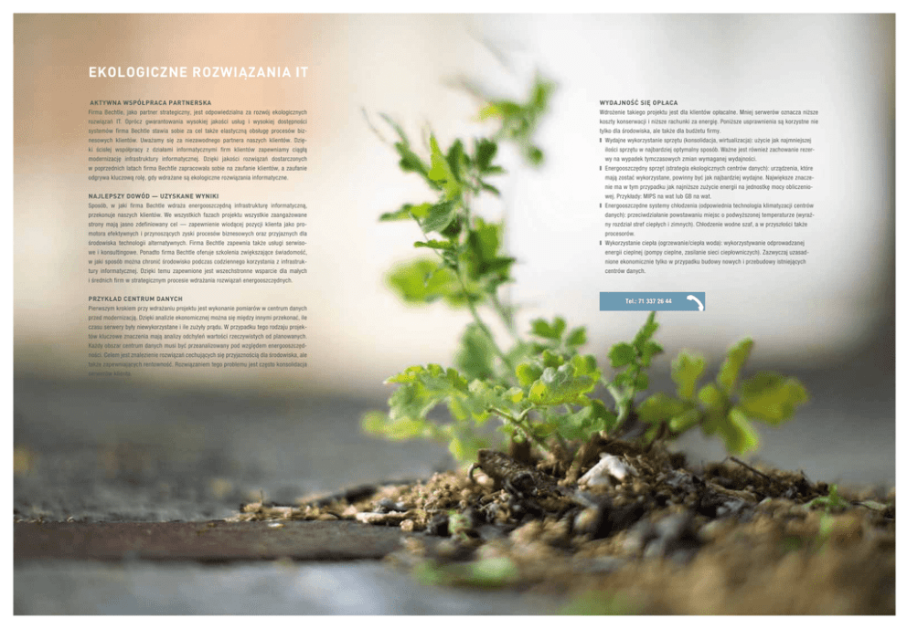 Ekologiczne rozwiązania IT Aktywna współpraca partnerska Firma Bechtle, jako partner strategiczny, jest odpowiedzialna za rozwój ekologicznych rozwiązań IT. Oprócz gwarantowania wysokiej jakości usług i wysokiej dostępności systemów firma Bechtle stawia sobie za cel także elastyczną obsługę procesów biznesowych klientów. Uważamy się za niezawodnego partnera naszych klientów. Dzięki ścisłej współpracy z działami informatycznymi firm klientów zapewniamy ciągłą modernizację infrastruktury informatycznej. Dzięki jakości rozwiązań dostarczonych w poprzednich latach firma Bechtle zapracowała sobie na zaufanie klientów, a zaufanie odgrywa kluczową rolę, gdy wdrażane są ekologiczne rozwiązania informatyczne. Najlepszy dowód — uzyskane wyniki Sposób, w jaki firma Bechtle wdraża energooszczędną infrastrukturę informatyczną, przekonuje naszych klientów. We wszystkich fazach projektu wszystkie zaangażowane strony mają jasno zdefiniowany cel — zapewnienie wiodącej pozycji klienta jako promotora efektywnych i przynoszących zyski procesów biznesowych oraz przyjaznych dla środowiska technologii alternatywnych. Firma Bechtle zapewnia także usługi serwisowe i konsultingowe. Ponadto firma Bechtle oferuje szkolenia zwiększające świadomość, w jaki sposób można chronić środowisko podczas codziennego korzystania z infrastruktury informatycznej. Dzięki temu zapewnione jest wszechstronne wsparcie dla małych i średnich firm w strategicznym procesie wdrażania rozwiązań energooszczędnych. Przykład centrum danych Pierwszym krokiem przy wdrażaniu projektu jest wykonanie pomiarów w centrum danych przed modernizacją. Dzięki analizie ekonomicznej można się między innymi przekonać, ile czasu serwery były niewykorzystane i ile zużyły prądu. W przypadku tego rodzaju projektów kluczowe znaczenia mają analizy odchyleń wartości rzeczywistych od planowanych. Każdy obszar centrum danych musi być przeanalizowany pod względem energooszczędności. Celem jest znalezienie rozwiązań cechujących się przyjaznością dla środowiska, ale także zapewniających rentowność. Rozwiązaniem tego problemu jest często konsolidacja serwerów klienta. Wydajność się opłaca Wdrożenie takiego projektu jest dla klientów opłacalne. Mniej serwerów oznacza niższe koszty konserwacji i niższe rachunki za energię. Poniższe usprawnienia są korzystne nie tylko dla środowiska, ale także dla budżetu firmy. ■■ Wydajne wykorzystanie sprzętu (konsolidacja, wirtualizacja): użycie jak najmniejszej ilości sprzętu w najbardziej optymalny sposób. Ważne jest również zachowanie rezerwy na wypadek tymczasowych zmian wymaganej wydajności. ■■ Energooszczędny sprzęt (strategia ekologicznych centrów danych): urządzenia, które mają zostać wykorzystane, powinny być jak najbardziej wydajne. Największe znaczenie ma w tym przypadku jak najniższe zużycie energii na jednostkę mocy obliczeniowej. Przykłady: MIPS na wat lub GB na wat. ■■ Energooszczędne systemy chłodzenia (odpowiednia technologia klimatyzacji centrów danych): przeciwdziałanie powstawaniu miejsc o podwyższonej temperaturze (wyraźny rozdział stref ciepłych i zimnych). Chłodzenie wodne szaf, a w przyszłości także procesorów. ■■ Wykorzystanie ciepła (ogrzewanie/ciepła woda): wykorzystywanie odprowadzanej energii cieplnej (pompy cieplne, zasilanie sieci ciepłowniczych). Zazwyczaj uzasadnione ekonomicznie tylko w przypadku budowy nowych i przebudowy istniejących centrów danych. Tel.: 71 337 26 44