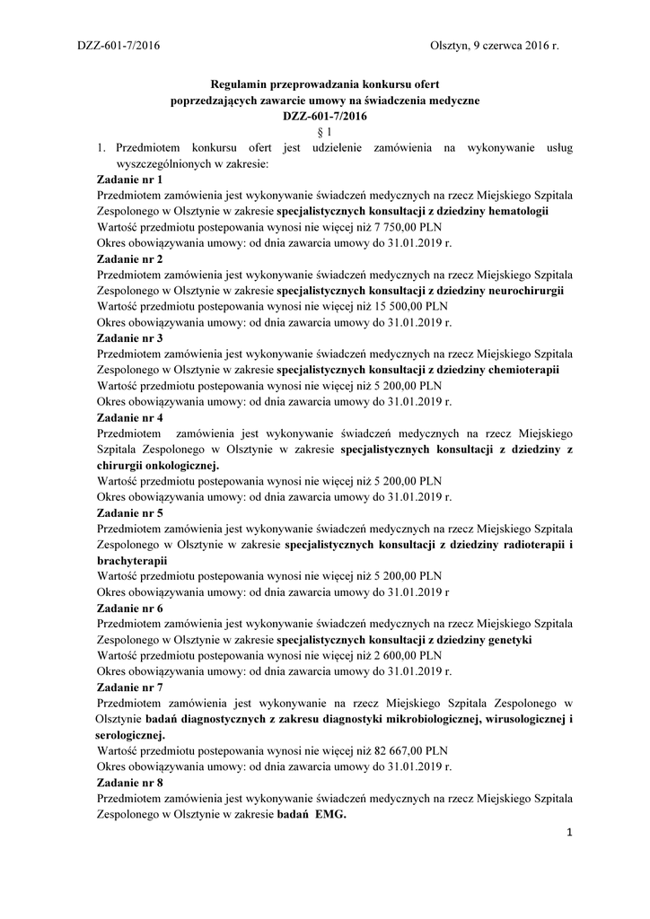 DZZ-601-7/2016 Olsztyn, 9 czerwca 2016 r. Regulamin przeprowadzania konkursu ofert poprzedzających zawarcie umowy na świadczenia medyczne DZZ-601-7/2016 §1 1. Przedmiotem konkursu ofert jest udzielenie zamówienia na wykonywanie usług wyszczególnionych w zakresie: Zadanie nr 1 Przedmiotem zamówienia jest wykonywanie świadczeń medycznych na rzecz Miejskiego Szpitala Zespolonego w Olsztynie w zakresie specjalistycznych konsultacji z dziedziny hematologii Wartość przedmiotu postepowania wynosi nie więcej niż 7 750,00 PLN Okres obowiązywania umowy: od dnia zawarcia umowy do 31.01.2019 r. Zadanie nr 2 Przedmiotem zamówienia jest wykonywanie świadczeń medycznych na rzecz Miejskiego Szpitala Zespolonego w Olsztynie w zakresie specjalistycznych konsultacji z dziedziny neurochirurgii Wartość przedmiotu postepowania wynosi nie więcej niż 15 500,00 PLN Okres obowiązywania umowy: od dnia zawarcia umowy do 31.01.2019 r. Zadanie nr 3 Przedmiotem zamówienia jest wykonywanie świadczeń medycznych na rzecz Miejskiego Szpitala Zespolonego w Olsztynie w zakresie specjalistycznych konsultacji z dziedziny chemioterapii Wartość przedmiotu postepowania wynosi nie więcej niż 5 200,00 PLN Okres obowiązywania umowy: od dnia zawarcia umowy do 31.01.2019 r. Zadanie nr 4 Przedmiotem zamówienia jest wykonywanie świadczeń medycznych na rzecz Miejskiego Szpitala Zespolonego w Olsztynie w zakresie specjalistycznych konsultacji z dziedziny z chirurgii onkologicznej. Wartość przedmiotu postepowania wynosi nie więcej niż 5 200,00 PLN Okres obowiązywania umowy: od dnia zawarcia umowy do 31.01.2019 r. Zadanie nr 5 Przedmiotem zamówienia jest wykonywanie świadczeń medycznych na rzecz Miejskiego Szpitala Zespolonego w Olsztynie w zakresie specjalistycznych konsultacji z dziedziny radioterapii i brachyterapii Wartość przedmiotu postepowania wynosi nie więcej niż 5 200,00 PLN Okres obowiązywania umowy: od dnia zawarcia umowy do 31.01.2019 r Zadanie nr 6 Przedmiotem zamówienia jest wykonywanie świadczeń medycznych na rzecz Miejskiego Szpitala Zespolonego w Olsztynie w zakresie specjalistycznych konsultacji z dziedziny genetyki Wartość przedmiotu postepowania wynosi nie więcej niż 2 600,00 PLN Okres obowiązywania umowy: od dnia zawarcia umowy do 31.01.2019 r. Zadanie nr 7 Przedmiotem zamówienia jest wykonywanie na rzecz Miejskiego Szpitala Zespolonego w Olsztynie badań diagnostycznych z zakresu diagnostyki mikrobiologicznej, wirusologicznej i serologicznej. Wartość przedmiotu postepowania wynosi nie więcej niż 82 667,00 PLN Okres obowiązywania umowy: od dnia zawarcia umowy do 31.01.2019 r. Zadanie nr 8 Przedmiotem zamówienia jest wykonywanie świadczeń medycznych na rzecz Miejskiego Szpitala Zespolonego w Olsztynie w zakresie badań EMG. 1 DZZ-601-7/2016 Olsztyn, 9 czerwca 2016 r. Wartość przedmiotu postepowania wynosi nie więcej niż 67 200,00 PLN Okres obowiązywania umowy: od dnia zawarcia umowy do 31.01.2019 r. Zadanie nr 9 Przedmiotem zamówienia jest wykonywanie świadczeń medycznych na rzecz Miejskiego Szpitala Zespolonego w Olsztynie w zakresie badań pracowni okulistycznej. Wartość przedmiotu postepowania wynosi nie więcej niż 1 300,00 PLN Okres obowiązywania umowy: od dnia zawarcia umowy do 31.01.2019 r. Zadanie nr 10 Przedmiotem zamówienia jest wykonywanie świadczeń medycznych na rzecz Miejskiego Szpitala Zespolonego w Olsztynie w zakresie badań EEG Wartość przedmiotu postepowania wynosi nie więcej niż 19 375,00 PLN Okres obowiązywania umowy: od dnia zawarcia umowy do 31.01.2019 r. Zadanie nr 11 Przedmiotem zamówienia jest wykonywanie świadczeń medycznych na rzecz Miejskiego Szpitala Zespolonego w Olsztynie w zakresie badań diagnostycznych - Biopsja cienkoigłowa pod kontrolą usg, na podstawie pisemnego zlecenia. Wartość przedmiotu postepowania wynosi nie więcej niż 82 677,00 PLN Okres obowiązywania umowy: od dnia zawarcia umowy do 31.01.2019 r. Zadanie nr 12 Przedmiotem zamówienia jest świadczenie usług medycznych na rzecz Miejskiego Szpitala Zespolonego w Olsztynie w zakresie badań diagnostycznych tomografii komputerowej i rezonansu magnetycznego, na podstawie pisemnego zlecenia. Wartość przedmiotu postepowania wynosi nie więcej niż 1 039 120,00 PLN Okres obowiązywania umowy: od dnia zawarcia umowy do 31.01.2019 r. Zadanie nr 13 Przedmiotem zamówienia jest wykonywanie świadczeń medycznych na rzecz Miejskiego Szpitala Zespolonego w Olsztynie w zakresie badań diagnostyki mikrobiologicznej na podstawie pisemnego zlecenia. Wartość przedmiotu postepowania wynosi nie więcej niż 1 196 918, 00 PLN Okres obowiązywania umowy: od dnia zawarcia umowy do 31.01.2019 r. Zadanie nr 14 Przedmiotem zamówienia jest wykonywanie świadczeń medycznych na rzecz Miejskiego Szpitala Zespolonego w Olsztynie w zakresie przeprowadzania sekcji zwłok pacjentów zmarłych w Szpitalu. Wartość przedmiotu postepowania wynosi nie więcej niż 28 275,00 PLN Okres obowiązywania umowy: od dnia 24.09.2016 do 31.01.2019 r. 2. Dopuszcza się składanie ofert częściowych na poszczególne zadania. 3. Szczegółowy zakres przedmiotu zamówienia poszczególnych zadań stanowi załącznik nr 1 do niniejszego Regulaminu. §2 1. Ogłoszenie o konkursie zamieszcza się na tablicy ogłoszeń w siedzibie Miejskiego Szpitala Zespolonego w Olsztynie oraz stronie internetowej:www.szpital.olsztyn.pl/konkursy medyczne §3 1. W zakresie Zadań nr 1 – 14 oferta powinna zawierać, zgodnie z formularzem ofertowym – stanowiącym załącznik nr 2 do niniejszego Regulaminu, w szczególności: a) Oświadczenie oferenta o zapoznaniu się z treścią ogłoszenia 2 DZZ-601-7/2016 Olsztyn, 9 czerwca 2016 r. b) Dane o oferencie – odpis z KRS lub właściwego rejestru nazwę i siedzibę c) imię i nazwisko, adres oraz numer wpisu do właściwego rejestru i oznaczenie organu dokonującego wpisu d) Wskazanie liczby i kwalifikacji zawodowych osób udzielających określo