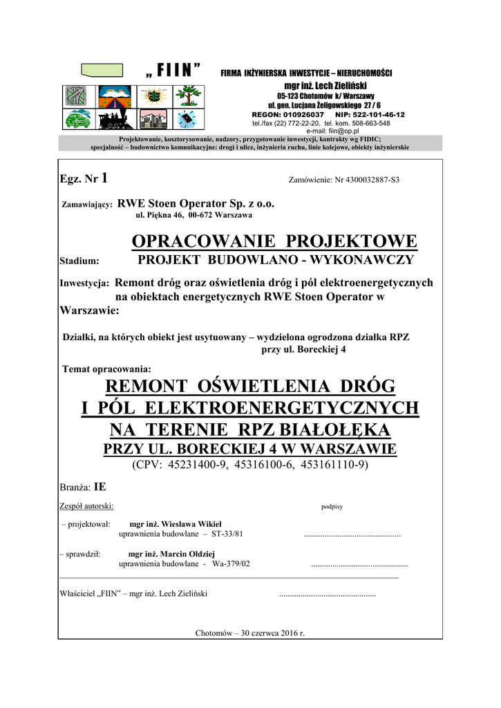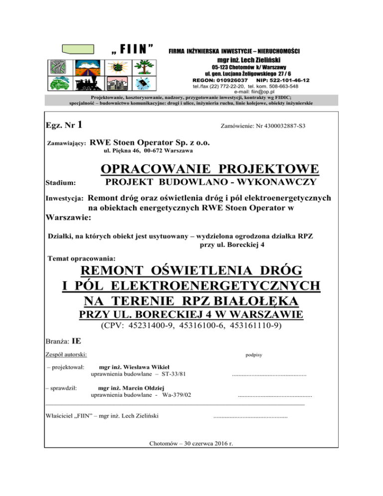 „ FIIN” FIRMA INŻYNIERSKA INWESTYCJE – NIERUCHOMOŚCI mgr inż. Lech Zieliński 05-123 Chotomów k/ Warszawy ul. gen. Lucjana Żeligowskiego 27 / 6 REGON: 010926037 NIP: 522-101-46-12 tel./fax (22) 772-22-20, tel. kom. 508-663-548 e-mail: [email protected] Projektowanie, kosztorysowanie, nadzory, przygotowanie inwestycji, kontrakty wg FIDIC; specjalność – budownictwo komunikacyjne: drogi i ulice, inżynieria ruchu, linie kolejowe, obiekty inżynierskie Egz. Nr 1 Zamawiający: Zamówienie: Nr 4300032887-S3 RWE Stoen Operator Sp. z o.o. ul. Piękna 46, 00-672 Warszawa OPRACOWANIE PROJEKTOWE PROJEKT BUDOWLANO - WYKONAWCZY Stadium: Inwestycja: Remont dróg oraz oświetlenia dróg i pól elektroenergetycznych na obiektach energetycznych RWE Stoen Operator w Warszawie: Działki, na których obiekt jest usytuowany – wydzielona ogrodzona działka RPZ przy ul. Boreckiej 4 Temat opracowania: REMONT OŚWIETLENIA DRÓG I PÓL ELEKTROENERGETYCZNYCH NA TERENIE RPZ BIAŁOŁĘKA PRZY UL. BORECKIEJ 4 W WARSZAWIE (CPV: 45231400-9, 45316100-6, 453161110-9) Branża: IE Zespół autorski: – projektował: podpisy mgr inż. Wiesława Wikieł uprawnienia budowlane – ST-33/81 .............................................. – sprawdził: mgr inż. Marcin Ołdziej uprawnienia budowlane - Wa-379/02 .............................................. ________________________________________________________________________________ Właściciel „FIIN” – mgr inż. Lech Zieliński .............................................. Chotomów – 30 czerwca 2016 r. OŚWIADCZENIE Zgodnie z treścią art. 20, ust. 1, pkt 1 ustawy z dnia 07 lipca 1994 r. Prawo Budowlane (tekst jednolity Dz.U. Nr 207/2003, poz. 2016-z późniejszymi zmianami), niżej podpisany zespół autorski oświadcza, że projekt budowlano-wykonawczy remontu oświetlenia dróg i pól elektroenergetycznych na terenie RPZ Białołęka przy ul. Boreckiej 4 w Warszawie branża elektryczna, opracowany został zgodnie z wymogami w/w ustawy, przepisami prawa oraz zasadami wiedzy technicznej w tym zakresie. Lp. Projektant/branża 1 mgr inż. Wiesława Wikieł /instalacje i sieci elektryczne/ Podpis Sprawdzający/branża mgr inż. Marcin Ołdziej /instalacje i sieci elektryczne/ Podpis SPIS ZAWARTOŚCI - uzgodnienia - wymagania techniczno-eksploatacyjne RWE Stoen dla słupów i opraw oświetleniowych - poświadczenie inwentaryzacji kabli energetycznych przez Stoen Operator Sp. z o.o. - uzgodnienie projektu przez Stoen Operator Sp. z o.o. - opis techniczny z obliczeniami - wydruki obliczeń oświetleniowych zamieszczono w egz. Inwestor; w pozostałych egz. podano jedynie wyniki obliczeń - informacja dotycząca bezpieczeństwa i ochrony zdrowia - inwentaryzacja kabli energetycznych na terenie RPZ Białołęka - rys. nr 1 - Plan sytuacyjny projektowanych i istniejących urządzeń oświetleniowych wraz z schematem zasilania - rys. nr 2 – Schemat rozdzielni oświetleniowej ROPW - rys. nr 3 - Schemat montażowy rozdzielnicy ROPW - rys. nr 4 – Schematyczny widok rozdzielnicy ROPW - karty katalogowe oryginał inwentaryzacji kabli energetycznych znajduje się w egz. Inwestorskim niniejszego projektu OPIS TECHNICZNY 1. Zleceniodawca RWE Stoen Operator Sp. z o.o. ul. Piękna 46, 00-672 Warszawa Zamówienie: Nr 4300032887-S3-S21. 2. Podstawa opracowania - mapy geodezyjne w skali 1:500 - inwentaryzacja istniejących urządzeń oświetleniowych wykonana na podstawie wizji lokalnej w terenie - inwentaryzacja istniejących urządzeń energetycznych wykonana przez RWE Stoen – Wydział Dokumentacji - uzgodnienia robocze z RWE – Stoen Sp. z o.o. - obliczenia oświetleniowe - wizja lokalna w terenie - norma PN-EN 12464-2 ‘Światło i oświetlenie cz.2 - Miejsca pracy na zewnątrz’ oraz ‘Standard oświetlenia elektrycznego stacji elektroenergetycznych’ – opracowanie PSE - Operator 3. Zakres opracowania W niniejszym projekcie ujęto przebudowę oświetlenia na terenie RPZ Białołęka przy ul. Boreckiej 4 w nawiązaniu do projektowanego rozwiązania drogowego. Projekt obejmuje: - montaż latarni - montaż kabli zasilających - montaż rozdzielni oświetleniowej - obliczenia - kosztorys ‘przedmiar robót’ i ‘inwestorski’ 4. Charakter obiektu i wymagania oświetleniowe RPZ Białołęka jest obiektem zamkniętym. Na terenie RPZ-u znajduje się budynek administracyjny oraz będą wykonane nowe jezdnie z kostki betonowej o szerokości 3-8 m. Wymagania oświetleniowe: 1) oświetlenie dróg i terenu: - wymagane natężenie oświetlenia: - wymagana równomierność: 2) oświetlenie stanowisk transf: - wymagane natężenie oświetlenia: - wymagana równomierność: Em > 10 lx (drogi) i Em > 5 lx (teren rozdzielni) Uo > 0,25 Em > 20 lx Uo > 0,30 5. Istniejące urządzenia oświetleniowe Obecnie teren RPZ Białołęka oświetlony jest oprawami rtęciowymi OZPR 125 W zainstalowanymi na słupach betonowych o wysokości 4 m zasilanymi z rozdzielni w budynku administracyjnym kablami aluminiowymi (na mapie geodezyjnej brak większości tras kabli – jest tylko pokazana lokalizacja latarni). Istniejące oświetlenie jest w złym stanie technicznym. Wszystkie latarnie zostaną zdemontowane. 6. Projektowane urządzenia oświetleniowe Projekt przewiduje budowę nowego oświetlenia kablowego na terenie RPZ Białołęka. Nowe latarnie – słupy stalowe z oprawami ledowymi zasilane linią kablową zostaną ustawione jednostronnie przy istniejących jezdniach oraz przy ogrodzeniu RPZ. Latarnie będą oświetlały zarówno jezdnie jak i urządzenia elektryczne RPZ-u. Lokalizacja latarni i tras kabli uwzględnia istniejące uzbrojenie. 6.1. Asortyment projektowanych urządzeń - latarnie uliczne /wysokość słupa wraz z wysięgnikiem/ H = 6 m /H – oznacza wysokość mocowania oprawy nad jezdnią/ - słupy stalowe typu OSL-60/4 PR (składane); o grubości ścianki 4 mm, przekrój okrągły, podwójnie ocynkowane, grubość warstwy cynkowanej min. 20 mikronów, zab
