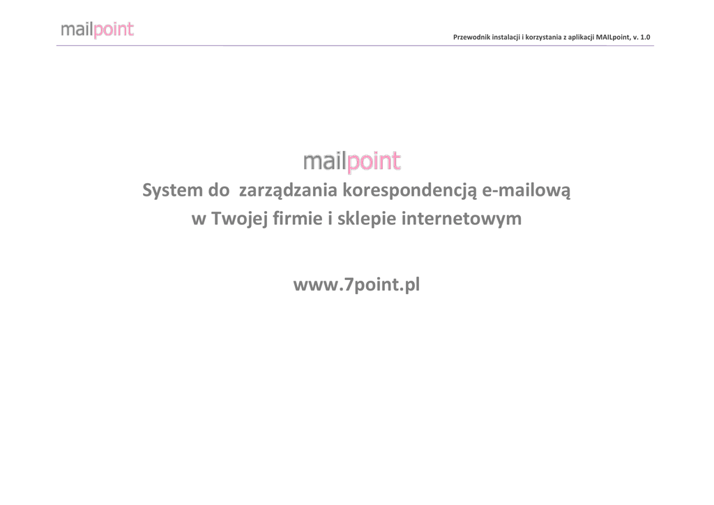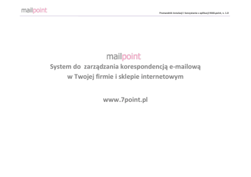 Przewodnik instalacji i korzystania z aplikacji MAILpoint, v. 1.0 System do zarządzania korespondencją e-mailową w Twojej firmie i sklepie internetowym www.7point.pl SPIS TREŚCI I. REJESTRACJA KONTA I USŁUGI MAILPOINT ................................................ II. PANEL KONSULTANTA OKNO LOGOWANIA ...................................................................................... MOJE KONTO – OTRZYMANE ............................................................................. MENU KONSULTANTA ........................................................................................ OKNO EDYCJI WIADOMOŚCI ............................................................................... OPCJA WSTRZYMANIA WIADOMOŚCI ................................................................ HISTORIA WIADOMOŚCI ..................................................................................... GRUPY ................................................................................................................. USTAWIENIA - Definiowanie stopek ....................................................................................... - Definiowanie szablonów odpowiedzi ............................................................. ZESTAWIENIA ..................................................................................................... NOTATKI WEWNĘTRZNE ..................................................................................... III. PANEL KIEROWNIKA ..................................................................................... 3 4 5 6 7 9 10 11 12 13 14 15 17 IV. PANEL ADMINISTRATORA – KONFIGURACJA SYSTEMU MAILPOINT INFORMACJE O SYSTEMIE ................................................................................... 18 GRUPY WIADOMOŚCI ......................................................................................... 19 KONTA POCZTOWE POP3 .................................................................................... 20 KONTA SMTP ...................................................................................................... 21 UŻYTKOWNICY .................................................................................................... 22 USTAWIENIA ....................................................................................................... 24 2 REJESTRACJA KONTA I USŁUGI MAILPOINT KROK 1 >> KROK 2 Rejestracja konta 7point Aktywacja konta 7point Aby móc korzystad z usługi MAILpoint należy zarejestrowad konto 7point. Aby aktywowad konto należy kliknąd link. Po kliku minutach konto zostanie aktywowane. W tym celu wystarczy wypełnid krótki formularz dostępny na stronie http://www.7point.pl oraz zaakceptowad warunki regulaminu korzystania z usługi MAILpoint. Po założeniu konta użytkownik uzyskuje dostęp do bezpłatnej dwumiesięcznej wersji testowej usługi MAILpoint. Po okresie testowym może zdecydowad się na któryś z czterech pakietów MAILpoint lub zrezygnowad z korzystania z usługi. W odpowiedzi na wypełniony formularz na adres podany w trakcie rejestracji przesłany zostanie email zawierający link aktywujący konto. Jeśli korzystasz już z naszych usług, nie musisz wypełniad poniższego formularza i rejestrowad nowego konta. Wystarczy, że zalogujesz się na swoje konto i zamówisz usługę MAILpoint. Jeśli w ciągu godziny nie otrzymałeś emaila z linkiem aktywacyjnym skontaktuj się z działem technicznym 7point: [email protected] lub skorzystaj z formularza kontaktowego dostępnego na stronie www.7point.pl/Kontakt.html >> KROK 3 Konfiguracja usługi Aby dokonad konfiguracji zalogowad się do konta. usługi należy Logowanie odbywa się z poziomu strony www.7point.pl , przy użyciu loginu i hasła podanych w formularzu rejestracyjnym. Po zalogowaniu do konta użytkownik (administrator) uzyskuje dostęp do panelu administracyjnego, w którym należy skonfigurowad usługę, w tym między innymi utworzyd konta dla użytkowników aplikacji (konsultantów i kierowników). Logowanie konsultantów i kierowników odbywa się z poziomu strony www.mailpoint.pl. 3 LOGOWANIE DO APLIKACJI OKNO LOGOWANIA Aplikacja MAILpoint udostępniana jest on-line. Aby korzystad z usługi należy zalogowad się do swojego konta. Logowanie do aplikacji MAILpoint odbywa się przy pomocy loginu i hasła. Każdy użytkownik posiada własne, unikalne dane dostępowe do aplikacji, nadawane przez administratora podczas konfiguracji usługi. Zobacz: Jak konfigurowane są konta dla użytkowników aplikacji W ramach aplikacji MAILpoint wyróżniono trzy typy użytkowników: administrator – kierownik – konsultant. Zarówno panel kierownika jak i konsultanta dostępne są po zalogowaniu do aplikacji – logowanie odbywa się z poziomu strony www.mailpoint.pl. Logowanie do panelu administracyjnego odbywa się z poziomu strony www.7point.pl. 4 PANEL KONSULTANTA MOJE KONTO – OTRZYMANE Poniżej zaprezentowano okno widoczne bezpośrednio po zalogowaniu do aplikacji MAILpoint. Zobacz: Jak odbywa się przypisanie wiadomości do konsultanta Na jakiej zasadzie korespondencja rozdzielana jest między grupy Jak przemieszczad się między grupami Jak wygląda okno edycji wiadomości W systemie MAILpoint cała napływająca korespondencja rozdzielana jest między poszczególne grupy, tutaj: Pomoc, Technicy, Marketing, a następnie w obrębie grupy następuje przypisanie wiadomości do konsultantów. Po zalogowaniu do aplikacji konsultantowi domyślnie zostaje wyświetlony widok „Moje konto” - wiadomości Otrzymane. Na widoku prezentowane są wszystkie wiadomości przypisane do zalogowanego konsultanta. Aby odczytad wiadomośd, konsultant klika w e-mail z listy. 5 PANEL KONSULTANTA MENU KONSULTANTA Do folderu „Wysłane” automatycznie przenoszone są wszystkie wiadomości, na które konsultant udzielił odpowiedzi. Przenoszenie wiadomości między folderami w obrębie konta konsultanta odbywa się przy pomocy rozwijanej listy: Do fo