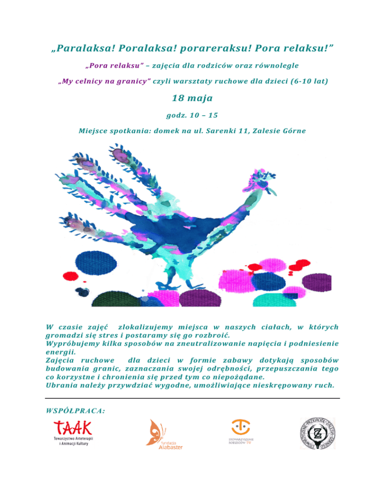 „Paralaksa! Poralaksa! porareraksu! Pora relaksu!” „Pora relaksu” – zajęcia dla rodziców oraz równolegle „My celnicy na granicy” czyli warsztaty ruchowe dla dzieci (6-10 lat) 18 maja godz. 10 – 15 Miejsce spotkania: domek na ul. Sarenki 11, Zalesie Górne W czasie zajęć zlokalizujemy miejsca w naszych ciałach, w których gromadzi się stres i postaramy się go rozbroić. Wypróbujemy kilka sposobów na zneutralizowanie napięcia i podniesienie energii. Zajęcia ruchowe dla dzieci w formie zabawy dotykają sposobów budowania granic, zaznaczania swojej odrębności, przepuszczania tego co korzystne i chronienia się przed tym co niepożądane. Ubrania należy przywdziać wygodne, umożliwiające nieskrępowany ruch. WSPÓŁPRACA: Prowadzące: Katarzyna Przyborska-Atkonis - Antropolożka kultury, animatorka, prawie arteterapeutka - praca dyplomowa, której warsztaty te są częścią, skupia się na ruchu. Prywatnie mama Szymka i Kalinki oraz wielbicielka opowieści. Ludmiła Laskowska-Pańków - ukończyła polonistkę na Uniwersytecie Warszawskim. Pracowała jako nauczycielka języka polskiego w gimnazjum i liceum, lektorka języka rosyjskiego, copywriterka, korektorka, redaktorka. Obecnie pracuje w poświęconym dramaturgii i teatrowi miesięczniku„Dialog” oraz w magazynie „Podróże”. Słuchaczka studium arteterapii przy Centrum Kultury Łowicka. Członkini Stowarzyszenia Arteterapeutów i Animatorów Kultury TAAK. W czasie warsztatów przewidziane są woda, kawa i herbata. Opłata za warsztaty – „co łaska” czyli według uznania . Liczba miejsc ograniczona. Decyduje kolejność zgłoszeń. Zgłoszenia zawierające imię i nazwisko rodzica/rodziców chętnych do udziału w warsztatach prosimy przesyłać na adres fundacja@fundacja- alabaster.org wraz z telefonem kontaktowym i informacją o dziecku (imię, wiek). Dojazd pociągiem podmiejskim ze stacji Warszawa Śródmieście do stacji Zalesie Górne (2 strefa). Odjazd – godz. 9.12, dojazd 9.55, pociąg w kierunku Warki.
