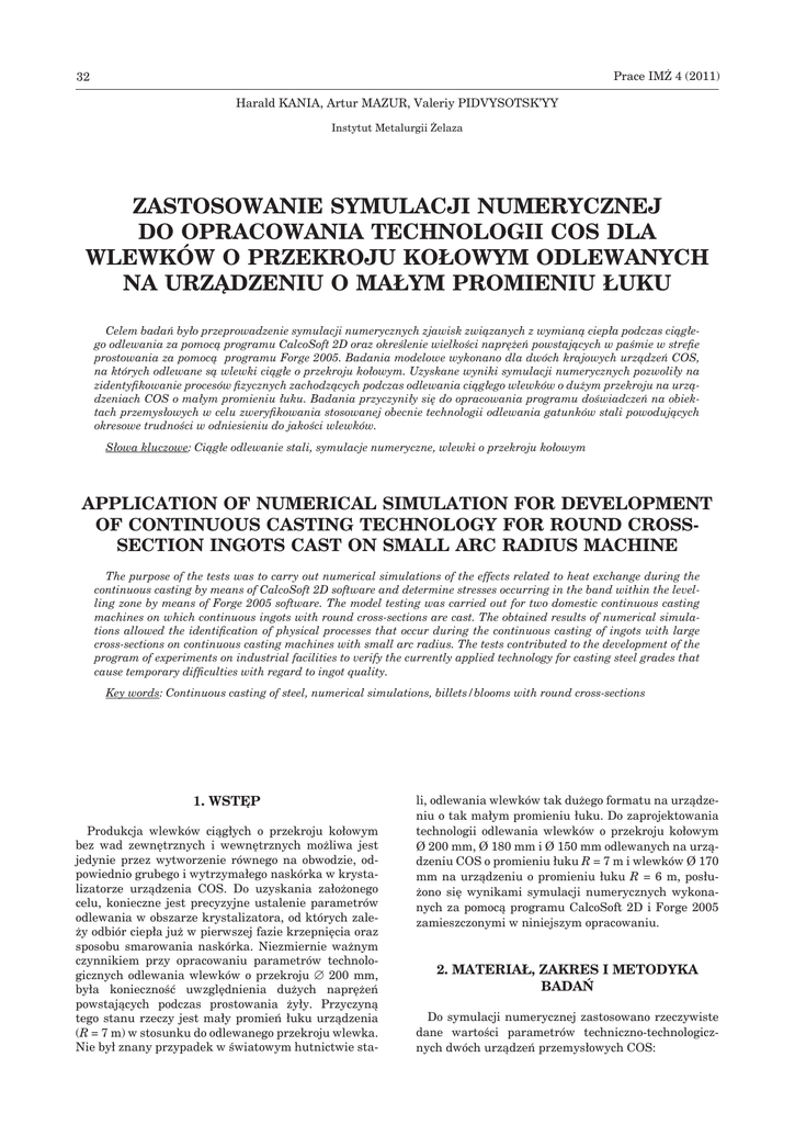 Prace IMŻ 4 (2011) 32 Harald KANIA, Artur MAZUR, Valeriy PIDVYSOTSK’YY Instytut Metalurgii Żelaza ZASTOSOWANIE SYMULACJI NUMERYCZNEJ DO OPRACOWANIA TECHNOLOGII COS DLA WLEWKÓW O PRZEKROJU KOŁOWYM ODLEWANYCH NA URZĄDZENIU O MAŁYM PROMIENIU ŁUKU Celem badań było przeprowadzenie symulacji numerycznych zjawisk związanych z wymianą ciepła podczas ciągłego odlewania za pomocą programu CalcoSoft 2D oraz określenie wielkości naprężeń powstających w paśmie w strefie prostowania za pomocą programu Forge 2005. Badania modelowe wykonano dla dwóch krajowych urządzeń COS, na których odlewane są wlewki ciągłe o przekroju kołowym. Uzyskane wyniki symulacji numerycznych pozwoliły na zidentyfikowanie procesów fizycznych zachodzących podczas odlewania ciągłego wlewków o dużym przekroju na urządzeniach COS o małym promieniu łuku. Badania przyczyniły się do opracowania programu doświadczeń na obiektach przemysłowych w celu zweryfikowania stosowanej obecnie technologii odlewania gatunków stali powodujących okresowe trudności w odniesieniu do jakości wlewków. Słowa kluczowe: Ciągłe odlewanie stali, symulacje numeryczne, wlewki o przekroju kołowym APPLICATION OF NUMERICAL SIMULATION FOR DEVELOPMENT OF CONTINUOUS CASTING TECHNOLOGY FOR ROUND CROSSSECTION INGOTS CAST ON SMALL ARC RADIUS MACHINE The purpose of the tests was to carry out numerical simulations of the effects related to heat exchange during the continuous casting by means of CalcoSoft 2D software and determine stresses occurring in the band within the levelling zone by means of Forge 2005 software. The model testing was carried out for two domestic continuous casting machines on which continuous ingots with round cross-sections are cast. The obtained results of numerical simulations allowed the identification of physical processes that occur during the continuous casting of ingots with large cross-sections on continuous casting machines with small arc radius. The tests contributed to the development of the program of experiments on industrial facilities to verify the currently applied technology for casting steel grades that cause temporary difficulties with regard to ingot quality. Key words: Continuous casting of steel, numerical simulations, billets/blooms with round cross-sections 1. WSTĘP Produkcja wlewków ciągłych o przekroju kołowym bez wad zewnętrznych i wewnętrznych możliwa jest jedynie przez wytworzenie równego na obwodzie, odpowiednio grubego i wytrzymałego naskórka w krystalizatorze urządzenia COS. Do uzyskania założonego celu, konieczne jest precyzyjne ustalenie parametrów odlewania w obszarze krystalizatora, od których zależy odbiór ciepła już w pierwszej fazie krzepnięcia oraz sposobu smarowania naskórka. Niezmiernie ważnym czynnikiem przy opracowaniu parametrów technologicznych odlewania wlewków o przekroju ∅ 200 mm, była konieczność uwzględnienia dużych naprężeń powstających podczas prostowania żyły. Przyczyną tego stanu rzeczy jest mały promień łuku urządzenia (R = 7 m) w stosunku do odlewanego przekroju wlewka. Nie był znany przypadek w światowym hutnictwie sta- li, odlewania wlewków tak dużego formatu na urządzeniu o tak małym promieniu łuku. Do zaprojektowania technologii odlewania wlewków o przekroju kołowym Ø 200 mm, Ø 180 mm i Ø 150 mm odlewanych na urządzeniu COS o promieniu łuku R = 7 m i wlewków Ø 170 mm na urządzeniu o promieniu łuku R = 6 m, posłużono się wynikami symulacji numerycznych wykonanych za pomocą programu CalcoSoft 2D i Forge 2005 zamieszczonymi w niniejszym opracowaniu. 2. MATERIAŁ, ZAKRES I METODYKA BADAŃ Do symulacji numerycznej zastosowano rzeczywiste dane wartości parametrów techniczno-technologicznych dwóch urządzeń przemysłowych COS: Prace IMŻ 4 (2011) Zastosowanie symulacji numerycznej do opracowania technologii COS... 33 oraz wielkości naprężeń powstających w paśmie w strefie prostowania, z zastosowaniem programu Forge 2005 w którym określono: – naprężenia rozciągające w strefie rolek ciągnąco-prostujących, – wpływ siły nacisku rolkami na szerokość powstającego śladu odcisku, – wartości odkształcenia powstającego w trakcie prostowania wlewka, Parametry do symulacji za pomocą programu CalcoSoft 2D przedstawiono w tabl. 2. W tabl. 3 przedstawiono parametry do symulacji za pomocą programu Forge 2005. – dwużyłowego urządzenia o promieniu łuku R = 7 m firmy VOEST-ALPINE eksploatowanego w firmie GONAR Stalownia Baildon i produkującego wlewki okrągłe Ø 200 mm, Ø 180 mm i Ø 150 mm, – trzyżyłowego urządzenia COS (R = 6 m) firmy Ferrostal Łabędy produkującego wlewki Ø 170 mm. Celem było opracowanie dla 4 gatunków stali przeznaczonych do produkcji rur założeń technologicznych do odlewania wlewków o przekroju kołowym na podstawie wielowariantowych symulacji numerycznych. Ze względu na największą ilość zamówień od klientów oraz występujące okresowo problemy jakościowe do symulacji numerycznej wybrano następujące stale: R35, C45, 30G2 i 42CrMo4 – tabl. 1. Wykonano numeryczne modelowanie zjawisk związanych z wymianą ciepła za pomocą programu CalcoSoft 2D, w wyniku którego wyznaczono: – rozkłady temperatury i udziału fazy stałej na przekroju wlewka po wyjściu z krystalizatora, komory chłodzenia wtórnego i w trakcie prostowania, – przebieg zmian temperatury dla 3 punktów przekroju poprzecznym pasma, – prognozowaną długość fazy ciekłej, – prognozowaną grubość naskórka wlewka po wyjściu z krystalizatora, 3. WYNIKI BADAŃ 3.1 SYMULACJA Z ZASTOSOWANIEM PROGRAMU CALCOSOFT 2D Badania modelowe za pomocą programu CalcoSoft 2D w postaci rozkładu temperatury i zmiany udziału fazy stałej na przekroju poprzecznym pasma, wykonano dla trzech charakterystycznych miejsc: – po wyjściu z krystalizatora (rys. 1A) – po wyjściu z komory chłodzenia wtórnego (rys. 1B) Tablica 1. Składy chemiczne s