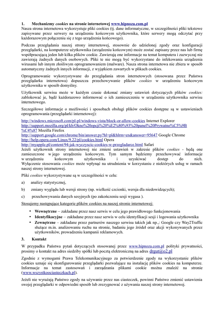 1. Mechanizmy cookies na stronie internetowej www.hipnoza.com.pl Nasza strona internetowa wykorzystuje pliki cookies (tj. dane informatyczne, w szczególności pliki tekstowe zapisywane przez serwery na urządzeniu końcowym użytkownika, które serwery mogą odczytać przy każdorazowym połączeniu się z tego urządzenia końcowego). Podczas przeglądania naszej strony internetowej, stosownie do udzielonej zgody oraz konfiguracji przeglądarki, na komputerze użytkownika (urządzeniu końcowym) może zostać zapisany przez nas lub firmę współpracującą jeden lub kilka plików cookie. Zawierają one informacje na temat komputera i zazwyczaj nie zawierają żadnych danych osobowych. Pliki te nie mogą być wykorzystane do infekowania urządzenia wirusami lub innym złośliwym oprogramowaniem (malware). Nasza strona internetowa nie zbiera w sposób automatyczny żadnych innych informacji, z wyjątkiem zawartych w plikach cookies. Oprogramowanie wykorzystywane do przeglądania stron internetowych (stosowana przez Państwa przeglądarka internetowa) dopuszcza przechowywanie plików cookies w urządzeniu końcowym użytkownika w sposób domyślny. Użytkownik serwisu może w każdym czasie dokonać zmiany ustawień dotyczących plików cookies: zablokować je, bądź każdorazowo informować o ich zamieszczeniu w urządzeniu użytkownika serwisu internetowego. Szczegółowe informacje o możliwości i sposobach obsługi plików cookies dostępne są w ustawieniach oprogramowania (przeglądarki internetowej): http://windows.microsoft.com/pl-pl/windows-vista/block-or-allow-cookies Internet Explorer http://support.mozilla.org/pl/kb/Okno%20opcji%20%E2%80%93%20panel%20Prywatno%C5%9B %C4%87 Mozilla Firefox http://support.google.com/chrome/bin/answer.py?hl=pl&hlrm=en&answer=95647 Google Chrome http://help.opera.com/Linux/9.22/pl/cookies.html Opera http://myapple.pl/content/94-jak-wyczyscic-cookies-w-przegladarce.html Safari Jeżeli użytkownik strony internetowej nie zmieni ustawień w zakresie plików cookies - będą one zamieszczone w jego urządzeniu końcowym. Tym samym będziemy przechowywać informacje w urządzeniu końcowym użytkownika i uzyskiwać dostęp do nich. Wyłączenie stosowania cookies może wpłynąć na utrudnienia w korzystaniu z niektórych usług w ramach naszej strony internetowej. Pliki cookies wykorzystywane są w szczególności w celu: a) analizy statystycznej, b) zmiany wyglądu lub wersji strony (np. wielkość czcionki, wersja dla niedowidzących); c) przechowywania danych sesyjnych (po zakończeniu sesji wygasa ). Stosujemy następujące kategorie plików cookies na naszej stronie internetowej: • Wewnętrzne – zakładane przez nasz serwis w celu jego prawidłowego funkcjonowania • Identyfikacyjne – zakładane przez nasz serwis w celu identyfikacji sesji i logowania użytkownika • Zewnętrzne – zakładane przez partnerów naszego serwisu takich jak np.,: Google czy Way2Traffic służące m.in. analizowaniu ruchu na stronie, badaniu jego źródeł oraz akcji wykonywanych przez użytkowników, prowadzeniu kampanii reklamowych. 3. Kontakt W przypadku Państwa pytań dotyczących stosowanej przez www.hipnoza.com.pl polityki prywatności, prosimy o kontakt na adres siedziby spółki lub pocztą elektroniczną na adres [email protected] Zgodnie z wymogami Prawa Telekomunikacyjnego za potwierdzenie zgody na wykorzystanie plików cookies uznaje się skonfigurowanie przeglądarki pozwalające na instalację plików cookies na komputerze. Informacje na temat zastosowań i zarządzania plikami cookie można znaleźć na stronie (www.wszystkoociasteczkach.pl). Jeżeli nie wyrażają Państwo zgody na używanie przez nas ciasteczek, powinni Państwo zmienić ustawienia swojej przeglądarki w odpowiedni sposób lub zrezygnować z używania naszej strony internetowej.