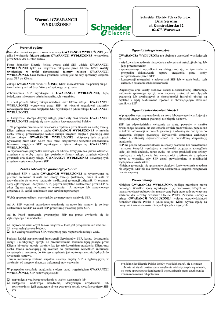 Schneider Electric Polska Sp. z o.o. Warunki GWARANCJI WYDŁUŻONEJ Dział Serwisu ul. Konstruktorska 12 02-673 Warszawa Warunki ogólne Dowodem świadczącym o zawarciu umowy GWARANCJI WYDŁUŻONEJ jest tylko i wyłącznie faktura zakupu GWARANCJI WYDŁUŻONEJ wystawiona przez Schneider Electric Polska. Firma Schneider Electric Polska zwana dalej SEP udziela GWARANCJI WYDŁUŻONEJ tylko na urządzenia zakupione przez Klienta, które zostały wymienione w treści dostarczonej faktury zakupu GWARANCJI WYDŁUŻONEJ. Czas trwania gwarancji liczony jest od daty sprzedaży urządzeń przez SEP do Klienta. Zakupu GWARANCJI WYDŁUŻONEJ, Klient może dokonać nie później niż po trzech miesiącach od daty faktury zakupionego urządzenia. Zobowiązania SEP wynikające z GWARANCJI WYDŁUŻONEJ, świadczone tylko przy spełnieniu poniższych warunków: będą 1. Klient posiada fakturę zakupu urządzeń oraz fakturę zakupu GWARANCJI WYDŁUŻONEJ wystawioną przez SEP, jak również uregulował wszystkie zobowiązania finansowe względem SEP wynikające z tytułu zakupu GWARANCJI WYDŁUŻONEJ. 2. Urządzenie, którego dotyczy usługa, przez cały czas trwania GWARANCJI WYDŁUŻONEJ znajduje się na terytorium Rzeczypospolitej Polskiej. 3. W przypadku przeniesienia własności urządzenia przez Klienta na osobę trzecią, Klient zgłasza roszczenia z tytułu GWARANCJI WYDŁUŻONEJ w imieniu osoby trzeciej przedstawiając fakturę zakupu urządzeń objętych gwarancją oraz fakturę zakupu GWARANCJI WYDŁUŻONEJ dotyczącą tych urządzeń wystawioną przez SEP. Klient musi mieć uregulowane wszystkie zobowiązania finansowe względem SEP wynikające z tytułu zakupu tej GWARANCJI WYDŁUŻONEJ. W wymienionym przypadku obowiązkiem Klienta, który przenosi prawo własności urządzenia na osobę trzecią, jest posiadanie faktury zakupu urządzeń objętych gwarancją oraz faktury zakupu GWARANCJI WYDŁUŻONEJ dotyczącej tych urządzeń wystawionych przez SEP. Zakres zobowiązań gwarancyjnych SEP Obowiązki SEP z tytułu GWARANCJI WYDŁUŻONEJ są wykonywane na pisemne wezwanie Klienta lub osoby trzeciej (wskazanej przez Klienta w upoważnieniu do umowy sprzedaży wydłużonej gwarancji załącznik 4) zwanymi dalej Zgłaszającym doręczone SEP, poprzez bezpłatne dostarczenie przez SEP na adres Zgłaszającego wskazany w wezwaniu: A. nowego lub naprawionego urządzenia B. części zamiennych oraz serwisu naprawczego Wybór sposobu realizacji obowiązków gwarancyjnych należy do SEP. Ad A. SEP wymieni uszkodzone urządzenie na nowe lub naprawi je po jego dostarczeniu do SEP, na koszt SEP, przez firmę wskazaną przez SEP. Ograniczenia gwarancyjne GWARANCJA WYDŁUŻONA nie obejmuje uszkodzeń wynikających z: - użytkowania urządzenia niezgodnie z zaleceniami instrukcji obsługi lub jego przeznaczeniem - spowodowanych wypadkami wszelkiego rodzaju, w tym także w przypadku dokonywania napraw urządzenia przez osoby nieupoważnione przez SEP - konserwacji niezgodnej z zaleceniami SEP lub w razie braku tych zaleceń, z zasadami sztuki konserwacji Diagnostyka oraz koszty osobowe każdej nieuzasadnionej interwencji, testowanie sprawnego sprzętu oraz naprawy uszkodzeń nie objętych gwarancją lub wynikających z nieznajomości instrukcji obsługi są odpłatne i będą fakturowane zgodnie z obowiązującym aktualnie cennikiem SEP Ograniczenie odpowiedzialności W przypadku wymiany urządzenia na nowe lub jego części wynikającej z niniejszej umowy, termin gwarancji nie biegnie na nowo. SEP jest odpowiedzialny wyłącznie za straty, powstałe w wyniku zawinionego działania lub zaniechania swoich pracowników, popełnione w trakcie interwencji w ramach gwarancji i odnoszą się one tylko do urządzenia objętego gwarancją. Użytkownik urządzenia zachowuje nadzór i całkowitą odpowiedzialność za prawidłową eksploatację urządzenia. SEP nie ponosi odpowiedzialności za szkody pośrednie lub niematerialne i utracone korzyści wynikające z wadliwości urządzenia, szczególnie takie jak: brak dochodu, utrata zysku lub strata produkcji oraz szkody wynikające z użytkowania lub niemożności użytkowania urządzenia nawet w wypadku, gdy SEP został powiadomiony o możliwości wystąpienia takich szkód. Niniejsza gwarancja nie gwarantuje ciągłości funkcjonowania urządzeń nią objętych. SEP nie ma obowiązku dostarczania urządzeń zastępczych na czas naprawy. Prawo umowy Niniejsza GWARANCJA WYDŁUŻONA podlega przepisom prawa polskiego. Wszelkie spory wynikające z jej warunków, których nie można rozwiązać polubownie, rozstrzygane będą przez sądy powszechne właściwe dla siedziby Schneider Electric Polska. Zawarcie umowy o usługę GWARANCJI WYDŁUŻONEJ, wyłącza odpowiedzialność Schneider Electric Polska z tytułu rękojmi. Klient wyraża zgodę na powyższe i zrzeka się roszczeń wynikających z tego tytułu. Ad B. Przed interwencją gwarancyjną SEP ma prawo zwrócenia się do Zgłaszającego o samodzielne: wykonanie określonych testów urządzenia, które jest przypuszczalnie wadliwe, ewentualną korektę błędów, lub według wskazówek SEP, współpracę przy rozpoznaniu rodzaju wady. Podczas każdej zaplanowanej interwencji Serwisantów SEP, koszty dostarczenia energii i niezbędnego sprzętu do przemieszczania Produktu będą pokryte przez Klienta lub osobę trzecią zależnie, kto jest użytkownikiem urządzenia. Klient oraz osoba trzecia zobowiązują się również do przekazania wszystkich informacji związanych z procesem, do którego urządzenie jest wykorzystane, niezbędnych do wykonania naprawy. Termin interwencji zostanie wspólnie ustalony między SEP a Zgłaszającym, w zależności od wstępnej diagnozy wykonanej przy wezwaniu. W przypadku wycofania urządzenia z oferty przed wygaśnięciem GWARANCJI WYDŁUŻONEJ, SEP zobowiązuje się do: naprawienia wadliwego urządzenia w swoich warsztatach lub zastąpienia wadliwego urządzenia, identycznym urząd