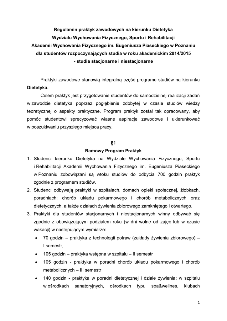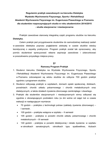Regulamin praktyk zawodowych na kierunku Dietetyka Wydziału Wychowania Fizycznego, Sportu i Rehabilitacji Akademii Wychowania Fizycznego im. Eugeniusza Piaseckiego w Poznaniu dla studentów rozpoczynających studia w roku akademickim 2014/2015 - studia stacjonarne i niestacjonarne Praktyki zawodowe stanowią integralną część programu studiów na kierunku Dietetyka. Celem praktyk jest przygotowanie studentów do samodzielnej realizacji zadań w zawodzie dietetyka poprzez pogłębienie zdobytej w czasie studiów wiedzy teoretycznej o aspekty praktyczne. Program praktyk został tak opracowany, aby pomóc studentowi sprecyzować własne aspiracje zawodowe i ukierunkować w poszukiwaniu przyszłego miejsca pracy. §1 Ramowy Program Praktyk 1. Studenci kierunku Dietetyka na Wydziale Wychowania Fizycznego, Sportu i Rehabilitacji Akademii Wychowania Fizycznego im. Eugeniusza Piaseckiego w Poznaniu zobowiązani są wtoku studiów do odbycia 700 godzin praktyk zgodnie z programem studiów. 2. Studenci odbywają praktyki w szpitalach, domach opieki społecznej, żłobkach, poradniach: chorób układu pokarmowego i chorób metabolicznych oraz dietetycznych, a także działach żywienia zbiorowego zamkniętego i otwartego. 3. Praktyki dla studentów stacjonarnych i niestacjonarnych winny odbywać się zgodnie z obowiązującym podziałem roku (w dni wolne od zajęć lub w czasie wakacji) w następującym wymiarze: 70 godzin – praktyka z technologii potraw (zakłady żywienia zbiorowego) – I semestr, 105 godzin – praktyka wstępna w szpitalu – II semestr 105 godzin - praktyka w poradni chorób układu pokarmowego i chorób metabolicznych – III semestr 140 godzin - praktyka w poradni dietetycznej i dziale żywienia: w szpitalu w ośrodkach sanatoryjnych, ośrodkach typu spa&wellnes, klubach 1 sportowych, zakładzie opieki zdrowotnej, hospicjum lub domach wczasowych prowadzących dietoterapię – IV semestr 105 godzin – praktyka w szpitalu dziecięcym (na oddziale szpitalnym, kuchni ogólnej i niemowlęcej, żłobku, poradni dietetycznej, magazynie żywności) – V semestr 70 godzin – praktyka w domu opieki społecznej (dom pomocy społecznej, hospicjum, dom spokojnej starości, zakład opieki zdrowotnej) – V semestr 105 godzin – w szpitalu dla dorosłych (na oddziale szpitalnym, kuchni ogólnej i dział żywienia) – VI semestr 4. Nadzór organizacyjny oraz dydaktyczno-wychowawczy nad praktykami pełni pełnomocnik Dziekana ds. praktyk studenckich. 5. Podstawą do rozpoczęcia praktyki jest zawarcie umowy o organizację studenckiej praktyki zawodowej. 6. Miejsce praktyk może zaproponować Student lub może być wyznaczone przez Pełnomocnika Dziekana do spraw praktyk. 7. Pełnomocnik Dziekana może zaliczyć, jako praktykę pracę zawodową/wolontariat wykonywany przez Studenta, o ile jest ona zgodna z programem praktyk. W tym przypadku zaliczenie praktyki nastąpi po przedstawieniu przez Studenta zaświadczenia o zatrudnieniu oraz wykazu czasu zatrudnienia i wykonywanych obowiązków. §2 Obowiązki studenta 1. Z uwagi na charakter i miejsca praktyk zawodowych Student zobowiązany jest do posiadania aktualnej książeczki zdrowia (szczepienie przeciwko żółtaczce), książeczki z aktualnymi badaniami sanitarno – epidemiologicznymi oraz do posiadania ubezpieczenia od następstw nieszczęśliwych wypadków. 2. Student zobowiązany jest do prowadzenia dzienniczka praktyk. 3. W okresie odbywania praktyk student zobowiązany jest do wykonywania zaleceń kierownika w zakładzie lub placówce będącej miejscem praktyk. 4. Student ponosi odpowiedzialność za szkody majątkowe i osobowe powstałe z jego winy na terenie zakładu lub placówki, w której odbywa praktykę. 5. Student bierze udział w realizacji zadań o charakterze zawodowym, powierzonych przez kompetentnych pracowników danej placówki lub zakładu. 2 6. W okresie odbywania praktyk studenci zobowiązani są stosować się do regulaminów obowiązujących w danej placówce. W razie naruszania przez studenta obowiązującego porządku i regulaminu, zakład pracy w porozumieniu z Uczelnią wyciąga stosowne konsekwencje. §3 Zaliczenie praktyk 1. Podstawą zaliczenia praktyk jest przedstawienie właściwie prowadzonego dzienniczka praktyk wraz ze sprawozdaniem na formularzu pobranym ze strony internetowej Uczelni: http://www.awf.poznan.pl/pl/wfsir-praktyki-dietetyka 2. W dzienniczku student zamieszcza pisemną relację z każdego dnia praktyki, którą potwierdza opiekun praktyk z ramienia placówki lub zakładu, w którym się ona odbyła. Dzienniczek wraz z oceną końcową powinien być poświadczony przez kierownika/dyrektora/ordynatora placówki. 3. Nieobecność studenta na praktyce może być poświadczona jedynie zwolnieniem lekarskim. W takim przypadku zostaje ona automatycznie przedłużona o czas trwania usprawiedliwionej nieobecności. 4. W wyjątkowych sytuacjach, kiedy termin zaliczenia praktyki uległ przesunięciu, Pełnomocnik Dziekana ds. praktyk, za zgodą Dziekana Wydziału może wyznaczyć inny termin ich zaliczenia. 5. Wypełniony dzienniczek praktyk powinien być dostarczony do pełnomocnika dziekana ds. praktyk w terminie zgodnym z organizacją roku akademickiego tj. do końca sesji poprawkowej. 6. Zaliczenie praktyk jest niezbędne do zaliczenia danego roku studiów. 7. Zapoznanie się z regulaminem praktyk Student potwierdza własnoręcznie złożonym podpisem. 3