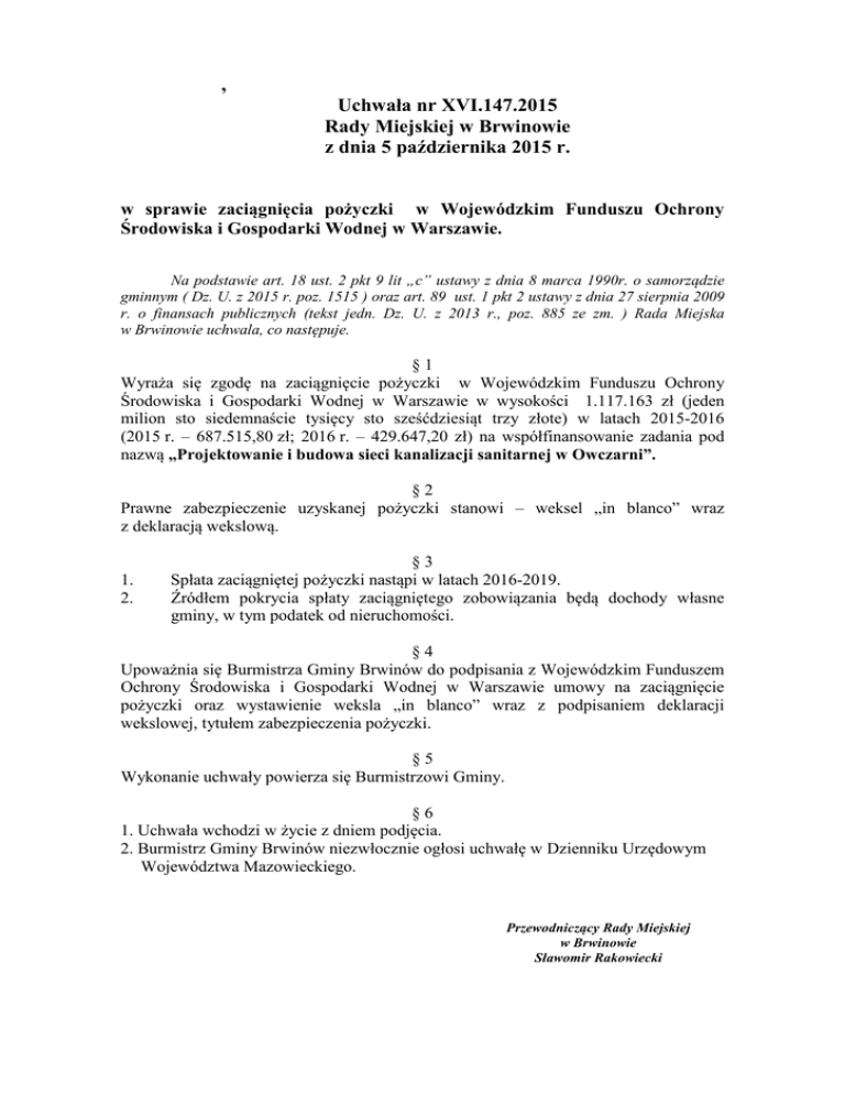 , Uchwała nr XVI.147.2015 Rady Miejskiej w Brwinowie z dnia 5 października 2015 r. w sprawie zaciągnięcia pożyczki w Wojewódzkim Funduszu Ochrony Środowiska i Gospodarki Wodnej w Warszawie. Na podstawie art. 18 ust. 2 pkt 9 lit „c” ustawy z dnia 8 marca 1990r. o samorządzie gminnym ( Dz. U. z 2015 r. poz. 1515 ) oraz art. 89 ust. 1 pkt 2 ustawy z dnia 27 sierpnia 2009 r. o finansach publicznych (tekst jedn. Dz. U. z 2013 r., poz. 885 ze zm. ) Rada Miejska w Brwinowie uchwala, co następuje. §1 Wyraża się zgodę na zaciągnięcie pożyczki w Wojewódzkim Funduszu Ochrony Środowiska i Gospodarki Wodnej w Warszawie w wysokości 1.117.163 zł (jeden milion sto siedemnaście tysięcy sto sześćdziesiąt trzy złote) w latach 2015-2016 (2015 r. – 687.515,80 zł; 2016 r. – 429.647,20 zł) na współfinansowanie zadania pod nazwą „Projektowanie i budowa sieci kanalizacji sanitarnej w Owczarni”. §2 Prawne zabezpieczenie uzyskanej pożyczki stanowi – weksel „in blanco” wraz z deklaracją wekslową. 1. 2. §3 Spłata zaciągniętej pożyczki nastąpi w latach 2016-2019. Źródłem pokrycia spłaty zaciągniętego zobowiązania będą dochody własne gminy, w tym podatek od nieruchomości. §4 Upoważnia się Burmistrza Gminy Brwinów do podpisania z Wojewódzkim Funduszem Ochrony Środowiska i Gospodarki Wodnej w Warszawie umowy na zaciągnięcie pożyczki oraz wystawienie weksla „in blanco” wraz z podpisaniem deklaracji wekslowej, tytułem zabezpieczenia pożyczki. §5 Wykonanie uchwały powierza się Burmistrzowi Gminy. §6 1. Uchwała wchodzi w życie z dniem podjęcia. 2. Burmistrz Gminy Brwinów niezwłocznie ogłosi uchwałę w Dzienniku Urzędowym Województwa Mazowieckiego. Przewodniczący Rady Miejskiej w Brwinowie Sławomir Rakowiecki