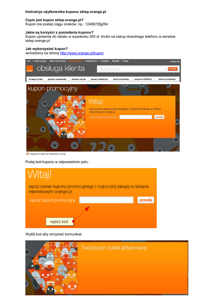 Instrukcja użytkownika kuponu sklep.orange.pl Czym jest kupon sklep.orange.pl? Kupon ma postać ciągu znaków, np.: 1245672fg254 Jakie są korzyści z posiadania kuponu? Kupon uprawnia do rabatu w wysokości 200 zł. brutto na zakup dowolnego telefonu w serwisie sklep.orange.pl. Jak wykorzystać kupon? wchodzimy na stronę http://www.orange.pl/kupon Podaj kod kuponu w odpowiednim polu: Wyślij kod aby otrzymać komunikat: Aktywacja kuponu oznacza, że możesz przejść do zakupów i kupić telefon z rabatem 200 zł: Wybierz telefon: Cena telefonu z rabatem z kuponu widoczna jest w pierwszym kroku zakupowym: Wypełnij formularz zamówienia do końca.