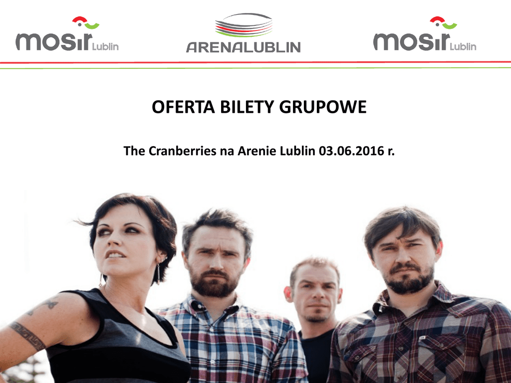OFERTA BILETY GRUPOWE The Cranberries na Arenie Lublin 03.06.2016 r. 3 czerwca 2016 r. Koncert The Cranberries na Arenie Lublin The Cranberries zasłynęli m.in. przebojami: „ Linger” , „Zombie”, „Animal Instinct” czy „Salvation”. Grają od ponad 20 lat, sprzedali 40 mln płyt, koncertowali na sześciu kontynentach, w Polsce – ostatni koncert odbył się na warszawskim Torwarze (sprzedały się wszystkie bilety). Ich hity wielokrotnie gościły na szczytach list przebojów w wielu krajach, teraz będą mogli ich na żywo posłuchać mieszkańcy Lublina i wszyscy fani The Cranberries, którzy tego dnia zawitają na Arenę Lublin. Dla muzyków The Cranberries z Dolores O`Riordan koncert 3 czerwca na Arenie Lublin będzie pierwszym po trzyletniej przerwie i jak na razie jedynym, potwierdzonym występem w Europie ŚrodkowoWschodniej. Wizualizacja rozmieszczenia miejsc Oferta zakupu biletów grupowych* Zniżka Ilość biletów 5% Przy zakupie minimum 10 biletów 10% Przy zakupie minimum 20 biletów 10 zł Od ceny biletu jednoosobowego dla posiadaczy SportKarty MOSiR „Bystrzyca” z nadanym numerem PIN, w następujących okresach 26.0204.03.2016 r., 01.04. –7.04.2016, 28.05. – 2.06.2016 r. Posiadaczowi SportKarty przysługuje prawo zakupu wyłącznie 2 biletów jednoosobowych. [email protected], tel. 508 055 307. W przypadku chęci zakupu powyżej 100 biletów należy pisać na podany adres mailowy lub dzwonić na podany numer. *Sprzedaż biletów jest możliwa wyłącznie przez eventim.pl oraz w stacjonarnych punktach sprzedaży, tj. sieciach Empik, Media Markt, Saturn. Także w punktach stacjonarnych będzie możliwość otrzymania faktury za zakupione bilety. http://www.eventim.pl/the-cranberries-bilety.html?affiliate=PLE&doc=artistPages %2Ftickets&fun=artist&action=tickets&erid=874969&kuid=467210 Zapraszamy na koncert Kontakt dla klientów: *Callcenter Eventim +48 22 591 83 83 Poniedziałek - Piątek: 10:00 - 18:00 *Punkt Eventim ZASP Al. Jerozolimskie 25,Warszawa Poniedziałek - Piątek: 10:00 - 19:00 Zapraszamy do śledzenia informacji na www.mosir.Lublin.pl oraz na facebooku Areny Lublin Eventim: www.eventim.pl