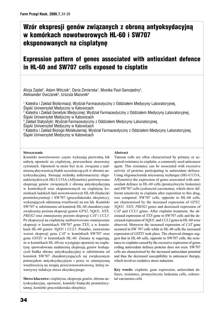 &ARM0RZEGL.AUK 7ZÌREKSPRESJIGENÌWZWIZANYCHZOBRONANTYOKSYDACYJN WKOMÌRKACHNOWOTWOROWYCH(,I37 EKSPONOWANYCHNACISPLATYNÃ %XPRESSIONPATTERNOFGENESASSOCIATEDWITHANTIOXIDANTDEFENCE IN(,AND37CELLSEXPOSEDTOCISPLATIN !LICJA:AJDEL!DAM7ILCZOK$ARIA:IMIERSKA-ONIKA0AUL3AMOJEDNY !LEKSANDER/WCZAREK5RSZULA-AZUREK +ATEDRAI:AKAD"IOFARMACJI7YDZIA&ARMACEUTYCZNYZ/DDZIAEM-EDYCYNY,ABORATORYJNEJ gLSKI5NIWERSYTET-EDYCZNYW+ATOWICACH +ATEDRAI:AKAD'ENETYKI-EDYCZNEJ7YDZIA&ARMACEUTYCZNYZ/DDZIAEM-EDYCYNY,ABORATORYJNEJ gLSKI5NIWERSYTET-EDYCZNYW+ATOWICACH :AKAD3TATYSTYKI7YDZIA&ARMACEUTYCZNYZ/DDZIAEM-EDYCYNY,ABORATORYJNEJ gLSKI5NIWERSYTET-EDYCZNYW+ATOWICACH +ATEDRAI:AKAD"IOLOGII-OLEKULARNEJ7YDZIA&ARMACEUTYCZNYZ/DDZIAEM-EDYCYNY,ABORATORYJNEJ gLSKI5NIWERSYTET-EDYCZNYW+ATOWICACH Streszczenie Komórki nowotworowe często wykazują pierwotną lub nabytą oporność na cisplatynę, powszechnie stosowany cytostatyk. Oporność ta może być m.in. związana z nadmierną aktywnością białek uczestniczących w obronie antyoksydacyjnej. Stosując technikę mikromacierzy oligonukleotydowych HG-U133A (Affymetrix) porównywano ekspresję genów związanych z obroną antyoksydacyjną w kontrolnych oraz eksponowanych na cisplatynę komórkach ludzkich linii nowotworowych HL-60 (białaczki promielocytarnej) i SW707 (gruczolakoraka okrężnicy), wykazujących odmienną wrażliwość na ten lek. Komórki SW707 w odróżnieniu od komórek HL-60 charakteryzuje zwiększony poziom ekspresji genów GPX2, NQO1, NXN, PRDX2 oraz zmniejszony poziom ekspresji CAT i CCL5. Po ekspozycji na cisplatynę zaobserwowano zmniejszenie ekspresji w komórkach SW707 genu TXN, a w komórkach HL-60 genów NQO1 i CCL5. Ponadto, zauważono wzrost ekspresji genu CAT w komórkach SW707 oraz genu GSTZ1 w komórkach HL-60. Zmiany te sugerują, że w komórkach HL-60 nie występuje oporność na cisplatynę spowodowana nadmierną ekspresją genów kodujących białka obrony antyoksydacyjnej w odróżnieniu od komórek SW707 charakteryzujących się zwiększonym potencjałem antyoksydacyjnym i przez to zmniejszoną wrażliwością na terapię przeciwnowotworową, której towarzyszy indukcja stresu oksydacyjnego. Słowa kluczowe: cisplatyna, ekspresja genów, obrona antyoksydacyjna, oporność, komórki białaczki promielocytarnej, komórki gruczolakoraka okrężnicy Abstract Tumour cells are often characterised by primary or acquired resistance to cisplatin, a commonly used anticancer agent. This resistance can be associated with excessive activity of proteins participating in antioxidant defence. Using oligonucleotide microarray technique (HG-U133A, Affymetrix) the expression of genes associated with antioxidant defence in HL-60 cells (promyelocytic leukemia) and SW707 cells (colorectal carcinoma), which show different sensitivity to cisplatin after exposition to this drug, was compared. SW707 cells, opposite to HL-60 cells, are characterised by the increased expression of GPX2, NQO1, NXN, PRDX2 genes and decreased expression of CAT and CCL5 genes. After cisplatin treatment, the decreased expression of TXN gene in SW707 cells and the decreased expression of NQO1, and CCL5 genes in HL-60 were observed. Moreover the increased expression of CAT gene occurred in SW 707 cells while in HL-60 cells the increased expression of GSTZ1 took place. The observed changes suggest that in HL-60 cells, opposite to SW707 cells, the resistance to cisplatin caused by the excessive expression of genes coding antioxidant defence proteins does not exist. SW707 cells are characterised by the increased antioxidant potential and thus the decreased susceptibility to anticancer therapy, which involves oxidative stress induction. Key words: cisplatin, gene expression, antioxidant defence, resistance, promyelocytic leukemia cells, colorectal carcinoma cells COPYRIGHT'RUPADR!2+WIECIÊSKIEGO)33. ' Ö Cisplatyna (cis-diaminodichloroplatyna II) jest powszechnie stosowanym lekiem charakteryzującym się dużą skutecznością w terapii nowotworów złośliwych jąder, jajników, pęcherza moczowego, płuc, głowy i szyi. Po wniknięciu do wnętrza komórki drogą dyfuzji prostej lub transportu aktywnego, w wyniku hydrolizy, podczas której jon chlorkowy w pozycji cis jest zastępowany przez cząsteczkę wody, cisplatyna ulega przekształceniu w postać aktywną, która reaguje z nukleofilowymi molekułami takimi jak DNA, RNA, białka i fosfolipidy błonowe. Cytotoksyczna aktywność cisplatyny związana jest z tworzeniem interi intramolekularnych wiązań z DNA, co zaburza procesy replikacji, transkrypcji, translacji prowadząc do zatrzymania cyklu komórkowego i aktywacji ścieżek sygnałowych kierujących komórki nowotworowe na drogę apoptozy [1]. Jednym z postulowanych mechanizmów apoptozy jest udział nietrwałych, bardzo reaktywnych produktów posiadających niesparowany elektron, zwanych reaktywnymi formami tlenu (RFT). W celu uzyskania bardziej stabilnej struktury, RFT reagują z różnymi składnikami komórek, inicjując wolnorodnikowe procesy peroksydacji lipidów, białek, węglowodanów, kwasów nukleinowych, co w rezultacie prowadzi do licznych zaburzeń procesów metabolicznych komórki [2]. Dowiedziono, że indukowanej przez cisplatynę apoptozie towarzyszy wzrost poziomu RFT oraz produktów peroksydacji białek i lipidów, a zastosowanie antyoksydantów takich jak N-acetylocysteina czy glutation znosi cytotoksyczne działanie tego leku i przeciwdziała śmierci komórek [3]. Ponieważ zarówno nadmiar RFT, jak ich brak jest niekorzystny, komórki wykształciły liczne mechanizmy obronne mające zapewnić optymalny poziom RFT. System obronny tworzą enzymy antyoksydacyjne m.in. dysmutaza ponadtlenkowa (SOD), katalaza (CAT), peroksydazy glutationowe (GPx), peroksyredoksyny, transferazy glutationowe (GSTs) oraz nieenzymatyczne zmiatacze wolnych rodników, np. glutation, tioredoksyna, tokoferol, metalotioneiny, kwas askorbinowy, czy kwas moczowy [2]. Prawidłowe funkcjonowanie sytemu