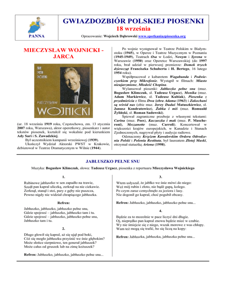GWIAZDOZBIÓR POLSKIEJ PIOSENKI 18 września PANNA Opracowanie: Wojciech Dąbrowski www.spotkaniazpiosenka.org MIECZYSŁAW WOJNICKI JARCA (ur. 18 września 1919 roku, Częstochowa, zm. 13 stycznia 2007 roku, Warszawa), aktor operetkowy, piosenkarz i autor tekstów piosenek, kształcił się wokalnie pod kierunkiem Ady Sari i S. Zawadzkiej. Był uczestnikiem kampanii wrześniowej (1939). Ukończył Wydział Aktorski PWST w Krakowie, debiutował w Teatrze Dramatycznym w Wilnie (1944). Po wojnie występował w Teatrze Polskim w Białymstoku (1945), w Operze i Teatrze Muzycznym w Poznaniu (1945-1949), Teatrach Osa w Łodzi, Nowym i Syrena w Warszawie (1950) oraz Operetce Warszawskiej (do 1997 roku, brał udział w pierwszej premierze: Domek trzech dziewcząt Franciszka Schuberta i H. Bertego, 16 lutego 1954 roku). Współpracował z kabaretem Wagabunda i Podwieczorkiem przy Mikrofonie. Wystąpił w filmach: Miasto nieujarzmione, Młodość Chopina. Wylansował piosenki: Jabłuszko pełne snu (muz. Bogusław Klimczuk, sł. Tadeusz Urgacz), Monika (muz. Adam Markiewicz, sł. Tadeusz Kubiak), Piosenka z przedmieścia z filmu Dwa żebra Adama (1963) i Zakochani są wśród nas (obie muz. Jerzy Duduś Matuszkiewicz, sł. Janusz Kondratowicz), Żabka i miś (muz. Romuald Żyliński, sł. Roman Sadowski). Śpiewał zagraniczne przeboje z własnymi tekstami: Carina (muz. Poes), Kaczuszka i mak (muz. P. Mascheroni), Mezzanotte (muz. Carroli). Koncertował w większości krajów europejskich, w Kanadzie i Stanach Zjednoczonych, nagrywał płyty i audycje radiowe. Odznaczony Krzyżem Kawalerskim Orderu Odrodzenia Polski i Polonia Restituta, był laureatem Złotej Maski, otrzymał statuetkę Ariona (1998). JABŁUSZKO PEŁNE SNU Muzyka: Bogusław Klimczuk, słowa: Tadeusz Urgacz, piosenka z repertuaru Mieczysława Wojnickiego 1. Rubinowe jabłuszko w sen zapadło na trawie, Szedł pan kapral uliczką, zerknął na nie ciekawie. Zerknął, stanął i stoi, pary z gęby nie puszcza, Pewno nigdy nie widział chrapiącego jabłuszka. Refren: Jabłuszko, jabłuszko, jabłuszko pełne snu, Gdzie spojrzeć – jabłuszko, jabłuszko tam i tu. Gdzie spojrzeć – jabłuszko, jabłuszko pełne snu, Jabłuszko tam i tu. 2. Długo głowił się kapral, aż się ujął pod boki, Cóż się mogło jabłuszku przyśnić we śnie głębokim? Może słońce sierpniowe, ten generał jabłuszek? Może całus od gruszek lub na zimę kożuszek? Refren: Jabłuszko, jabłuszko, jabłuszko pełne snu... 3. Wtem usłyszał, że jabłko we śnie mówi do niego: Weź mój rubin i złoto, nie bądź gapą, kolego. Po czym zaraz czmychnęło za jeziora i lasy. Nie dogonił go kapral, choć pogubił obcasy. Refren: Jabłuszko, jabłuszko, jabłuszko pełne snu... 4. Będzie za to mozolnie w pace liczyć dni długie. Oj, nieprędko pan kapral znowu będzie mieć w czubie. Wy nie śmiejcie się z niego, wszak morowe z was chłopy. Wam też mogą się trafić, bo się liczą na kopy: Refren: Jabłuszka, jabłuszka, jabłuszka pełne snu...