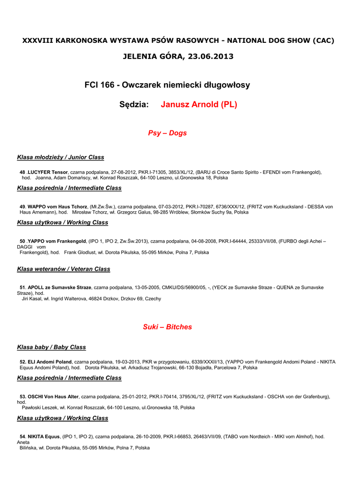 XXXVIII KARKONOSKA WYSTAWA PSÓW RASOWYCH - NATIONAL DOG SHOW (CAC) JELENIA GÓRA, 23.06.2013 FCI 166 - Owczarek niemiecki długowłosy Sędzia: Janusz Arnold (PL) Psy – Dogs Klasa młodzieży / Junior Class 48 .LUCYFER Tensor, czarna podpalana, 27-08-2012, PKR.I-71305, 3853/XL/12, (BARU di Croce Santo Spirito - EFENDI vom Frankengold), hod. Joanna, Adam Domańscy, wł. Konrad Roszczak, 64-100 Leszno, ul.Gronowska 18, Polska Klasa pośrednia / Intermediate Class 49. WAPPO vom Haus Tchorz, (Mł.Zw.Św.), czarna podpalana, 07-03-2012, PKR.I-70287, 6736/XXX/12, (FRITZ vom Kuckucksland - DESSA von Haus Arnemann), hod. Mirosław Tchorz, wł. Grzegorz Galus, 98-285 Wróblew, Słomków Suchy 9a, Polska Klasa użytkowa / Working Class 50 .YAPPO vom Frankengold, (IPO 1, IPO 2, Zw.Św.2013), czarna podpalana, 04-08-2008, PKR.I-64444, 25333/VII/08, (FURBO degli Achei – DAGGI vom Frankengold), hod. Frank Glodlust, wł. Dorota Pikulska, 55-095 Mirków, Polna 7, Polska Klasa weteranów / Veteran Class 51. APOLL ze Sumavske Straze, czarna podpalana, 13-05-2005, CMKU/DS/56900/05, -, (YECK ze Sumavske Straze - QUENA ze Sumavske Straze), hod. Jiri Kasal, wł. Ingrid Walterova, 46824 Drzkov, Drzkov 69, Czechy Suki – Bitches Klasa baby / Baby Class 52. ELI Andomi Poland, czarna podpalana, 19-03-2013, PKR w przygotowaniu, 6339/XXXII/13, (YAPPO vom Frankengold Andomi Poland - NIKITA Equus Andomi Poland), hod. Dorota Pikulska, wł. Arkadiusz Trojanowski, 66-130 Bojadła, Parcelowa 7, Polska Klasa pośrednia / Intermediate Class 53. OSCHI Von Haus Alter, czarna podpalana, 25-01-2012, PKR.I-70414, 3795/XL/12, (FRITZ vom Kuckucksland - OSCHA von der Grafenburg), hod. Pawłoski Leszek, wł. Konrad Roszczak, 64-100 Leszno, ul.Gronowska 18, Polska Klasa użytkowa / Working Class 54. NIKITA Equus, (IPO 1, IPO 2), czarna podpalana, 26-10-2009, PKR.I-66853, 26463/VII/09, (TABO vom Nordteich - MIKI vom Almhof), hod. Aneta Bilińska, wł. Dorota Pikulska, 55-095 Mirków, Polna 7, Polska FCI 166 - Owczarek niemiecki krótkowłosy Sędzia: Janusz Arnold (PL) Psy – Dogs Klasa szczeniąt / Puppy Class 55. GEK Amol z Kojca Luny, czarna podpalana, 12-12-2012, PKR w przygotowaniu, 27560/VII/12, (Falkoen's BAX - BISCHA Astokatto), hod. Czesław Tkaczyk, wł. Czesław Tkaczyk, 55-080 Mokronos Górny, ul.Gwarna 1/8, Polska 56. ZIBI Spes Henkor, czarna podpalana, 10-12-2012, PKR w przygotowaniu, 7513/XVII/12, (FRITZ vom Kuckucksland - GRETA Spes Henkor), hod. Henryk Korolewicz, wł. Henryk Korolewicz, 58-508 Łomnica, Poprzeczna 14, Polska Klasa pośrednia / Intermediate Class 57. UWE vom Haus Tchorz, czarna, 03-12-2011, PKR.I-70944, 6592/XXX/11, (FALKOS von der Schwarzen Seeperlen - JOLEEN vom Baphomet), hod. Mirosław Tchorz, wł. Mateusz Kokoszka, 98-200 Sieradz, Dzierlin 74, Polska Klasa otwarta / Open Class 58. GREY Spans Henkor, czarna podpalana, 10-01-2011, PKR.I-68645, 7334/XVII/11, (XAMBO vom Farbenspiel - HELGA Spes Henkor), hod. Henryk Korolewicz, wł. Jacek Falkenberg, 58-500 Jelenia Góra, Tuwima 5/5, Polska 59. SAVER Equus, czarna podpalana, 31-12-2010, PKR.I-67813, 26353/VII/10, (CASSIUS CLAY Equus - KSANDINA Equus), hod. Aneta Bilińska, wł. Iwona Hołownia, 54-235 Wrocław, Białowieska 46/25, Polska 60. WENTO Matador, czarna podpalana, 01-02-2011, PKR.I-70907, 27178/VII/11, (BOSS Texa - DORA Matador), hod. M.R. Szmyd, wł. Małgorzata Zawadzka, 55-095 Domaszczyn, Wrocławska 4, Polska Suki – Bitches Klasa młodzieży / Junior Class 61. KIJA Kamireł (FCI), czarna podpalana, 04-03-2012, PKR.I-70518, 8240/XX/12, (VISUM vom Farbenspiel - UTOPIA vom Godinghofer Weg), hod. Marek Napieracz, wł. Anna Denkiewicz, 58-160 Świebodzice, Długa 7/5, Polska Klasa pośrednia / Intermediate Class 62. Oscha von Haus Alter, czarna podpalana, 25-01-2012, PKR.I-71070, 3833/XL/12, (Fritz vom Kuckucksland - Oscha von der Grafenburg), hod. Leszek Pawłowski, wł. Leszek Pawłowski, 63-900 Rawicz, Zielona Wieś 24, Polska 63. QEXI vom Haus Tchorz, czarna podpalana, 24-01-2012, PKR.I-71086, 6555/XXX/12, (WITO vom Brauneck - HASTA Acer Aureum), hod. Mirosław Tchorz, wł. Cezary Parczyński, 62-860 Opatówek, Szulec 19a, Polska Klasa otwarta / Open Class 64. ARISA Wil-Marko (FCI), czarna podpalana, 29-10-2010, PKR.I-70037, 8206/XX/10, (VISUM vom Farbenspiel - VENA Kamireł (FCI)), hod. Jan Przybyła, wł. Jan Przybyła, 55-120 Wilczyn, Obornicka 1a, Polska 65. EWI z Dzierlina, czarna podpalana, 20-04-2011, PKR.I-71106, 6596/XXX/11, (ALEX von Herrenhaus Werder - KELLY von Neandertal), hod. Mateusz Kokoszka, wł. Mateusz Kokoszka, 98-200 Sieradz, Dzierlin 74, Polska 66. SCHICCA Artrox, czarna podpalana, 04-07-2011, PKR.I-71563, 8346/XX/11, (DRAGOS von der Ostfriesischen Thingstätte - BAXI Artrox), hod. Artur Dąbrowski, wł. Rafał Kubów, 67-100 Kiełcz, Sosnowa 6, Polska Klasa użytkowa / Working Class 67. SAYURI Equus, (IPO-I), czarna podpalana, 31-12-2010, PKR.I-67851, 26377/VII/10, (CASSIUS CLAY Equus - KSANDINA Equus), hod. Aneta Bilińska, wł. Magda Walas, 55-002 Kamieniec Wrocławski, A. Mickiewicza 13, Polska