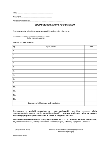 Imię: ………………………………………………………………… Nazwisko:………………………………………………………… Adres zamieszkania: ……………………………………………………………… OŚWIADCZENIE O ZAKUPIE PODRĘCZNIKÓW Oświadczam, że zakupiłem wykazane poniżej podręczniki, dla ucznia: ……………………………………………………………………. (imię i nazwisko ucznia) WYKAZ PODRĘCZNIKÓW: Lp. Tytuł, autor Cena 1. 2. 3. 4. 5. 6. 7. 8. 9. 10. 11. 12. 13. Łączna wartość zakupu podręczników: Oświadczam, że wydatki poniesione na w/w podręczniki do klasy ……………… szkoły podstawowej/gimnazjum/ szkoły ponadgimnazjalnej* zostaną rozliczone tylko w ramach Rządowego programu pomocy uczniom w 2013 r. – „Wyprawka szkolna”. Świadomy/a odpowiedzialności karnej wynikającej z art. 233 § 1 Kodeksu karnego, oświadczam, że przedstawione dane, które potwierdzam własnoręcznym podpisem, są zgodne z prawdą. …………………………………. (miejscowość, data) *niewłaściwe skreślić …………………………………………………….. (czytelny podpis rodzica/prawnego opiekuna/ rodzica zastępczego)