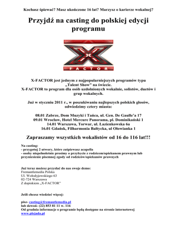 Kochasz śpiewać? Masz ukończone 16 lat? Marzysz o karierze wokalnej? Przyjdź na casting do polskiej edycji programu X-FACTOR jest jednym z najpopularniejszych programów typu „Talent Show” na świecie. X-FACTOR to program dla osób uzdolnionych wokalnie, solistów, duetów i grup wokalnych. Już w styczniu 2011 r., w poszukiwaniu najlepszych polskich głosów, odwiedzimy cztery miasta: 08.01 Zabrze, Dom Muzyki i Tańca, ul. Gen. De Gaulle’a 17 09.01 Wrocław, Hotel Mercure Panorama, pl. Dominikański 1 14.01 Warszawa, Torwar, ul. Łazienkowska 6a 16.01 Gdańsk, Filharmonia Bałtycka, ul Ołowianka 1 Zapraszamy wszystkich wokalistów od 16 do 116 lat!!! Na casting: - przygotuj 2 utwory, które zaśpiewasz acapella - osoby niepełnoletnie prosimy o przybycie z rodzicem/opiekunem prawnym lub przyniesienie pisemnej zgody od rodziców/opiekunów prawnych Już teraz możesz przysłać do nas swoje demo: Fremantlemedia Polska Ul. Wołodyjowskiego 63 02-724 Warszawa Z dopiskiem „X-FACTOR” Jeśli chcesz wiedzieć więcej: pisz- [email protected] lub dzwoń- (22) 853 81 11 w. 116 Od grudnia informacje o programie będą dostępne na stronie internetowej www.plejada.pl