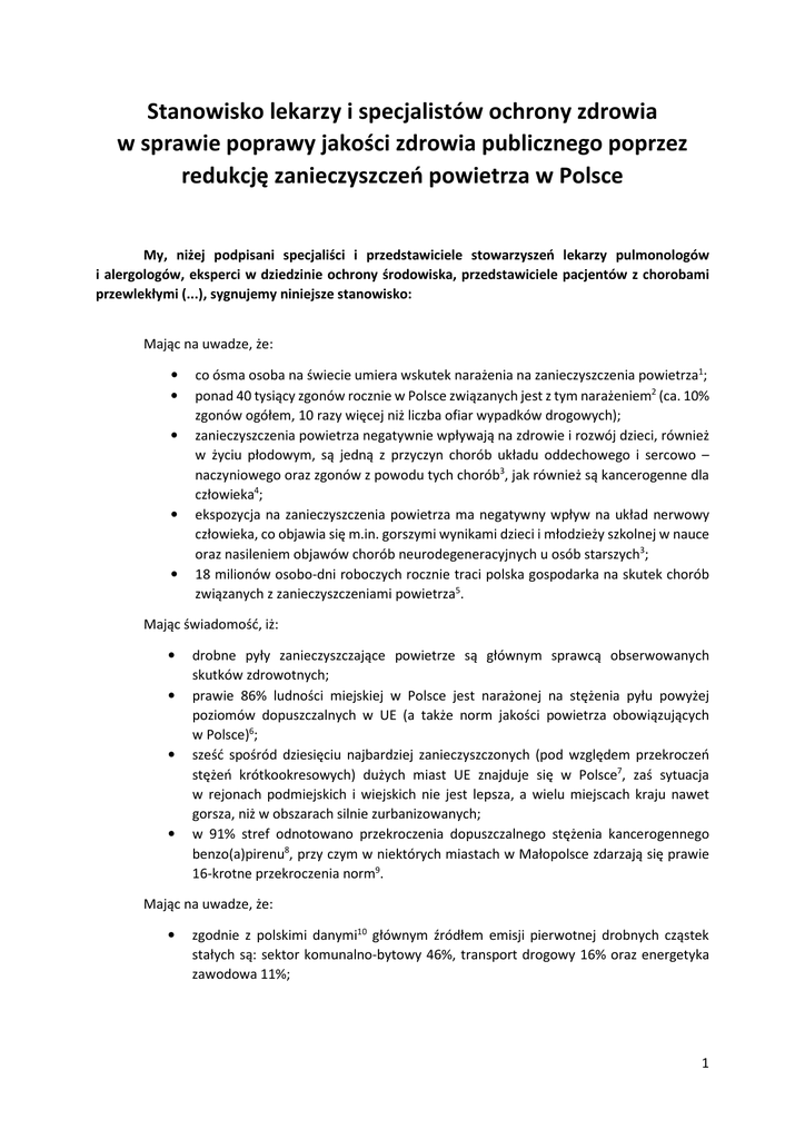 Stanowisko lekarzy i specjalistów ochrony zdrowia w sprawie poprawy jakości zdrowia publicznego poprzez redukcję zanieczyszczeń powietrza w Polsce My, niżej podpisani specjaliści i przedstawiciele stowarzyszeń lekarzy pulmonologów i alergologów, eksperci w dziedzinie ochrony środowiska, przedstawiciele pacjentów z chorobami przewlekłymi (...), sygnujemy niniejsze stanowisko: Mając na uwadze, że: • • • • • co ósma osoba na świecie umiera wskutek narażenia na zanieczyszczenia powietrza1; ponad 40 tysiący zgonów rocznie w Polsce związanych jest z tym narażeniem2 (ca. 10% zgonów ogółem, 10 razy więcej niż liczba ofiar wypadków drogowych); zanieczyszczenia powietrza negatywnie wpływają na zdrowie i rozwój dzieci, również w życiu płodowym, są jedną z przyczyn chorób układu oddechowego i sercowo – naczyniowego oraz zgonów z powodu tych chorób3, jak również są kancerogenne dla człowieka4; ekspozycja na zanieczyszczenia powietrza ma negatywny wpływ na układ nerwowy człowieka, co objawia się m.in. gorszymi wynikami dzieci i młodzieży szkolnej w nauce oraz nasileniem objawów chorób neurodegeneracyjnych u osób starszych3; 18 milionów osobo-dni roboczych rocznie traci polska gospodarka na skutek chorób związanych z zanieczyszczeniami powietrza5. Mając świadomość, iż: • • • • drobne pyły zanieczyszczające powietrze są głównym sprawcą obserwowanych skutków zdrowotnych; prawie 86% ludności miejskiej w Polsce jest narażonej na stężenia pyłu powyżej poziomów dopuszczalnych w UE (a także norm jakości powietrza obowiązujących w Polsce)6; sześć spośród dziesięciu najbardziej zanieczyszczonych (pod względem przekroczeń stężeń krótkookresowych) dużych miast UE znajduje się w Polsce7, zaś sytuacja w rejonach podmiejskich i wiejskich nie jest lepsza, a wielu miejscach kraju nawet gorsza, niż w obszarach silnie zurbanizowanych; w 91% stref odnotowano przekroczenia dopuszczalnego stężenia kancerogennego benzo(a)pirenu8, przy czym w niektórych miastach w Małopolsce zdarzają się prawie 16-krotne przekroczenia norm9. Mając na uwadze, że: • zgodnie z polskimi danymi10 głównym źródłem emisji pierwotnej drobnych cząstek stałych są: sektor komunalno-bytowy 46%, transport drogowy 16% oraz energetyka zawodowa 11%; 1 • emisje gazów z tych sektorów mają dodatkowy, negatywny wpływ na zdrowie i przyczyniają się do tworzenia wtórnych zanieczyszczeń (drobnych pyłów, ozonu) w atmosferze. Mając na uwadze wyniki badań z wielu krajów świata3 wskazujące, że redukcja stężeń zanieczyszczeń powietrza: • • spowoduje, w krótkim czasie, spadek: występowania chorób układu oddechowego i układu sercowo - naczyniowego, przypadków hospitalizacji i liczby przedwczesnych zgonów osób cierpiących na powyższe schorzenia, oraz liczby dni ograniczonej aktywności zawodowej; przyniesie znaczące korzyści ekonomiczne wynikające z poprawy zdrowia społeczeństwa, niższych kosztów opieki zdrowotnej i wzrostu wydajności pracy, zmniejszając zewnętrzne koszty zdrowotne, przy redukcji emisji zanieczyszczeń powietrza, która pozwoli na redukcję zewnętrznych kosztów zdrowotnych w Polsce na poziomie kilku miliardów złotych każdego roku. Jesteśmy przekonani, że wspólne działania następujących podmiotów: rządu, jednostek samorządowych, przedsiębiorstw i obywateli są konieczne do poprawy jakości powietrza w naszym kraju i zmniejszenia negatywnego wpływu zanieczyszczeń powietrza na zdrowie. Widzimy dużą potrzebę kompleksowych działań w dziedzinie produkcji energii, zarówno zawodowej jak i w gospodarstwach domowych, w których wybór źródeł energii oraz stosowanych technologii musi uwzględniać zarówno potrzeby społeczno-gospodarcze i ekonomiczne, jak i kwestie jakości powietrza (zdrowotne). Zwracamy uwagę decydentów na konieczność uwzględnienia kwestii jakości powietrza i jej wpływu na zdrowie ludzi podczas dyskusji nad potencjalnymi strategiami energetycznymi i ich planowania. Wzywamy do następujących działań: Prezydenta RP, Sejm oraz Rząd do: - Stworzenia i uchwalenia nowych przepisów dążących do radykalnej poprawy jakości powietrza w Polsce, w tym do ustalenia minimalnych parametrów jakości węgla i kotłów na paliwa stałe dla redukcji emisji zanieczyszczeń z sektora komunalno-bytowego, oraz umożliwienie tworzenia stref ograniczonej emisji wymuszających redukcję zanieczyszczeń pochodzących z transportu; - Opracowania i wdrożenia natychmiastowych działań poprawiających jakość powietrza w celu ochrony zdrowia publicznego w Polsce poprzez poparcie ambitnych celów dla naszego kraju w dyrektywie UE ws. krajowych pułapów emisji, co przyczyni się do osiągnięcia jednolitych standardów jakości powietrza dla naszego kraju; - Opracowanie strategii osiągnięcia w Polsce jakości powietrza zalecanej przez wytyczne Światowej Organizacji Zdrowia i przystąpienie do jej wdrażania; - Przyspieszenia prac nad Ustawą o Zdrowiu Publicznym wraz z uwzględnieniem w niej aspektów środowiskowych, co pozwoli na stworzenie krajowych i wojewódzkich planów ochrony zdrowia publicznego oraz opracowanie strategii zmierzającej do poprawy jakości życia; 2 - Intensyfikacji działań na rzecz informowania oraz edukowania społeczeństwa i decydentów w kwestiach jakości powietrza i jego wpływu na zdrowie; - Stworzenia lepszych warunków udziału społeczeństwa w podejmowaniu decyzji w sprawie jakości powietrza. Samorządy do: - Opracowywania oraz szybkiego wdrażania skutecznych planów poprawy jakości powietrza w najbardziej zanieczyszczonych obszarach Polski. Ze swojej strony deklarujemy pełną gotowość do czynnego zaangażowania się w powyższe działania, informowania społeczeństwa o wpływie zanieczyszczeń powietrza na zdrowie oraz monitorowania postępu poprawy jakości powietrza w Polsce. 1 WHO 2014 - World Health Organizat