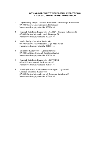 WYKAZ OŚRODKÓW SZKOLENIA KIEROWCÓW Z TERENU POWIATU OSTROWSKIEGO 1. Liga Obrony Kraju – Ośrodek Szkolenia Zawodowego Kierowców 07-300 Ostrów Mazowiecka ul. Różańska 5 Numer ewidencyjny ośrodka 00011416 2. Ośrodek Szkolenia Kierowców „ALEX” – Tomasz Gołaszewski 07-300 Ostrów Mazowiecka ul. Batorego 24 Numer ewidencyjny ośrodka 00031416 3. Nauka Jazdy – Jarosław Konieczko 07-300 Ostrów Mazowiecka ul. 3-go Maja 40/23 Numer ewidencyjny ośrodka 00131416 4. Szkolenie Kierowców – Leszek Barszcz 07-320 Małkinia Górna ul. Przedszkolna 6A Numer ewidencyjny ośrodka 00151416 5. Ośrodek Szkolenia Kierowców - KRYSIAK 07-310 Komorowo ul. Poziomkowa 17 Numer ewidencyjny ośrodka 00171416 6. Przedsiębiorstwo Wielobranżowe Grzegorz Czyżewski Ośrodek Szkolenia Kierowców 07-300 Ostrów Mazowiecka, ul. Tadeusza Kościuszki 9 Numer ewidencyjny ośrodka 00211416