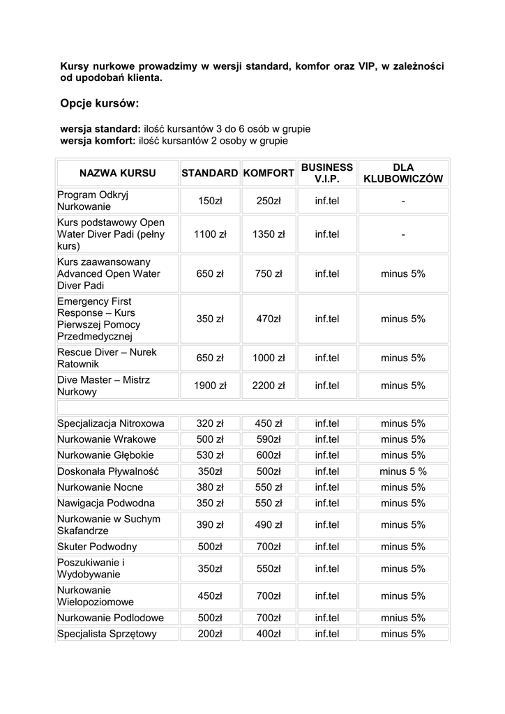Kursy nurkowe prowadzimy w wersji standard, komfor oraz VIP, w zależności od upodobań klienta. Opcje kursów: wersja standard: ilość kursantów 3 do 6 osób w grupie wersja komfort: ilość kursantów 2 osoby w grupie NAZWA KURSU Program Odkryj Nurkowanie STANDARD KOMFORT BUSINESS V.I.P. DLA KLUBOWICZÓW 150zł 250zł inf.tel - Kurs podstawowy Open Water Diver Padi (pełny kurs) 1100 zł 1350 zł inf.tel - Kurs zaawansowany Advanced Open Water Diver Padi 650 zł 750 zł inf.tel minus 5% Emergency First Response – Kurs Pierwszej Pomocy Przedmedycznej 350 zł 470zł inf.tel minus 5% Rescue Diver – Nurek Ratownik 650 zł 1000 zł inf.tel minus 5% Dive Master – Mistrz Nurkowy 1900 zł 2200 zł inf.tel minus 5% SPECJALIZACJE NURKOWE Specjalizacja Nitroxowa 320 zł 450 zł inf.tel minus 5% Nurkowanie Wrakowe 500 zł 590zł inf.tel minus 5% Nurkowanie Głębokie 530 zł 600zł inf.tel minus 5% Doskonała Pływalność 350zł 500zł inf.tel minus 5 % Nurkowanie Nocne 380 zł 550 zł inf.tel minus 5% Nawigacja Podwodna 350 zł 550 zł inf.tel minus 5% Nurkowanie w Suchym Skafandrze 390 zł 490 zł inf.tel minus 5% Skuter Podwodny 500zł 700zł inf.tel minus 5% Poszukiwanie i Wydobywanie 350zł 550zł inf.tel minus 5% Nurkowanie Wielopoziomowe 450zł 700zł inf.tel minus 5% Nurkowanie Podlodowe 500zł 700zł inf.tel mnius 5% Specjalista Sprzętowy 200zł 400zł inf.tel minus 5% KURS RATOWNIKÓW PIERWSZEJ POMOCY DAN Pierwsza Pomoc Tlenowa w Wypadkach Nurkowych 370 zł 470 zł inf.tel minus 5% PROGRAMY NURKOWE DLA DZIECI Bubbelmaker – Bąbelkowiec 300 zł 400zł inf. tel minus 5% Seal Team 500 zł 600 zł inf.tel minus 5% KARTA KLUBOWICZA roczna opłata 150 zł Możesz otrzymasz imienną kartę klubowicza kończąc z nami szkolenie nurkowe Cena Kursu Open Water Diver zawiera: zawiera: koszt wynajmu całego potrzebnego sprzętu podczas szkolenia,wejścia na basen oraz wejściówki na miejsce nurkowania (Zakrzówek, Jaworzno), obowiazkowe materiały szkoleniowe na własność kursanta takie jak: podręcznik PADI , tabele, logbook (rejestr nurkowań) za wyjątkiem sprzętu ABC. Sprzęt ABC (maska, fajka, płetwy) kursant powinien posiadać własny. Dodatkowe opłaty: cena nie obejmuje certyfikatu w kwocie 120 zł (opłata do Padi). Cena Kursu Advanced Open Water Diver, Emergency First Response, Rescue Diver zawiera: butle oraz ich napełnianie, książka na własność kursanta, wejściówkę na miejsce nurkowania(Zakrzówek,Jaworzno). Przy kursie EFR certyfikat w cenie kursu. dodatkowe opłaty: cena nie obejmuje pozostałego sprzętu i certyfikatu w kwocie 120 zł (opłata do Padi). Cena Kursu Dive Master zawiera: butle oraz ich napełnianie, książka i workbook na własność kursanta, wejściówki na miejsce nurkowania (Zakrzówek, Jaworzno) oraz basen. dodatkowe opłaty: cena nie obejmuje pozostałego sprzętu. Przy kursie Dive Master zamiast certyfikatu jest pobierana roczna opłata do Padi około 300zł. Cena specjalizacji nurkowych zawiera: zajęcia teoretyczne, szkolenie, materiały, napełnianie butli oraz ich wypożyczenie, wejściówkę na miejsce nurkowania (Zakrzówek, Jaworzno). Przy specjalizacji nitrox nurkowania nie są obowiązkowe. dodatkowe opłaty: cena nie obejmuje pozostałego sprzętu i certyfikatu w kwocie 120 zł (opłata do Padi). Cena Kursu Pierwsza Pomoc Tlenowa w Wypadkach Nurkowych zawiera: zajęcia teoretyczne, szkolenie, materiały oraz certyfikat. Cena Programów dla Dzieci zawiera: wypożyczenie kompletnego sprzętu nurkowego w rozmiarach dziecięcych, dyplom Bubblemaker, logbook, nalepki, naszywki, zmywalny tatuaż, zabawka oraz duży ręcznik. Szkolenia prowadzimy w Krakowie na Zakrzówku lub w Jaworznie na „Koparkach”. Istnieje mozliwość dokończenia szkolenia na wodach otwartych np: w Tajlandii, Egipcie, Chorwacji, na Zanzibarze, w Indonezji, na Seszelach czy Karaibach. Wykłady odbywają sie w naszym Centrum Nurkowym w Kryspinowie ul. Mazurowa 409. Zajęcia basenowe prowadzimy na basenie Wisły w Krakowie lub w Piekarach.