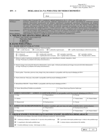Załącznik Nr 1 do Uchwały Nr XIV/103/2015 Rady Gminy Głogów z dnia 30 grudnia 2015 r. DN – 1 DEKLARACJA NA PODATEK OD NIERUCHOMOŚCI 1.Rok…………………….. Podstawa prawna: Składający: Termin składania: Miejsce składania : Ustawa z dnia 12 stycznia 1991 r. o podatkach i opłatach lokalnych (t.j. Dz. U. z 2014 r. poz. 849 z póŜn. zm.). Formularz przeznaczony dla osób prawnych, jednostek organizacyjnych oraz spółek nieposiadających osobowości prawnej będących właścicielami nieruchomości lub obiektów budowlanych, posiadaczami samoistnymi nieruchomości lub obiektów budowlanych, uŜytkownikami wieczystymi gruntów, posiadaczami nieruchomości lub ich części albo obiektów budowlanych lub ich części, stanowiących własność Skarbu Państwa lub jednostki samorządu terytorialnego oraz dla osób fizycznych będących współwłaścicielami lub współposiadaczami z osobami prawnymi, bądź z innymi jednostkami organizacyjnymi nieposiadającymi osobowości prawnej lub z spółkami nieposiadającymi osobowości prawnej, z wyjątkiem osób tworzących wspólnotę mieszkaniową. Do 31 stycznia kaŜdego roku podatkowego; w terminie 14 dni od zaistnienia okoliczności mających wpływ na powstanie, bądź wygaśnięcie obowiązku podatkowego lub zaistnienia zdarzeń mających wpływ na wysokość podatku. Organ podatkowy właściwy ze względu na miejsce połoŜenia przedmiotów opodatkowania. A. MIEJSCE SKŁADANIA DEKLARACJI 2. Nazwa i adres siedziby organu podatkowego Wójt Gminy Głogów ul. Słodowa 2b 67-200 Głogów B. DANE PODATNIKA B.1. DANE IDENTYFIKACYJNE 3. Rodzaj składającego deklarację (zaznaczyć właściwą kratkę) 1. osoba fizyczna 2. osoba prawna 3. jednostka organizacyjna 4. spółka nieposiadająca osobowości prawnej 4. Rodzaj własności, posiadania (zaznaczyć właściwą kratkę) 1. właściciel 2. współwłaściciel 3. uŜytkownik wieczysty 4. współuŜytkownik wieczysty 5. posiadacz samoistny 6. współposiadacz samoistny 7. posiadacz zaleŜny 8. Współposiadacz zaleŜny 5. Miejsce/a (adres/y) połoŜenia przedmiotów opodatkowania oraz identyfikator/y działek, budynków, lokali (Uwaga! Wykazuje się odrębnie dla kaŜdej nieruchomości.) 6. Numer/y księgi wieczystej lub zbioru/ów dokumentów, nazwa sądu, w którym prowadzona jest księga wieczysta lub zbiór dokumentów (Uwaga! Wykazuje się odrębnie dla kaŜdej nieruchomości) 7. Nazwa pełna / Nazwisko, pierwsze imię, drugie imię, data urodzenia w przypadku osób fizycznych składających DN-1 8. Nazwa skrócona / Imię ojca, imię matki w przypadku osób fizycznych składających DN-1 9. Identyfikator REGON / Numer PESEL w przypadku osób fizycznych składających DN-1 10. Numer Identyfikacji Podatkowej podatnika 11. Numer Krajowego Rejestru Sądowego B.2. ADRES SIEDZIBY / ADRES ZAMIESZKANIA (w przypadku osób fizycznych składających DN-1) 12. Kraj 13. Województwo 14. Powiat 15. Gmina 16. Ulica 17. Numer domu 19. Miejscowość 20. Kod pocztowy 21. Poczta 18. Numer lokalu B.3. ADRES DO KORESPONDENCJI (naleŜy wypełnić, gdy jest inny niŜ adres siedziby/adres zamieszkania) 22. Kraj 23. Województwo 24. Kod pocztowy/Poczta 25. Miejscowość 26. Ulica 27. Numer domu 28. Numer lokalu C. OKOLICZNOŚCI POWODUJĄCE KONIECZNOŚĆ ZŁOśENIA DEKLARACJI 29. Okoliczności powodujące obowiązek złoŜenia deklaracji (zaznaczyć właściwą kratkę) 1. deklaracja składana w terminie do 31 stycznia roku podatkowego 2. powstanie obowiązku podatkowego w trakcie roku podatkowego 3. wygaśnięcie obowiązku podatkowego 4. zmiana miejsca zamieszkania lub siedziby 5. korekta deklaracji rocznej - obowiązuje za okres............................................. DN-1 1/3 D. DANE DOTYCZĄCE PRZEDMIOTÓW OPODATKOWANIA (z wyjątkiem zwolnionych) Wyszczególnienie Podstawa opodatkowania a b Stawka podatku wynikająca z Uchwały Rady Gminy Głogów obowiązująca w roku podatkowym którego dotyczy deklaracja c Kwota podatku w zł,gr d D.1. POWIERZCHNIA GRUNTÓW 1. związanych z prowadzeniem działalności gospodarczej, bez względu na sposób zakwalifikowania w ewidencji gruntów i budynków 2. pod wodami powierzchniowymi stojącymi lub wodami powierzchniowymi płynącymi jezior i zbiorników sztucznych 3. pozostałych, w tym zajętych na prowadzenie odpłatnej statutowej działalności poŜytku publicznego przez organizacje poŜytku publicznego 4. niezabudowanych objętych obszarem rewitalizacji, o którym mowa w ustawie z dnia 9 października 2015 r. o rewitalizacji 30. 31. .................................. …………………..m2 33. 34. .............................ha 36. 35. .................................. 37. .............................m2 39. 32. 38. .................................. 40. ............................m2 41. .................................. D.2. POWIERZCHNIA UśYTKOWA BUDYNKÓW LUB ICH CZĘŚCI Do powierzchni uŜytkowej budynku lub jego części naleŜy zaliczyć powierzchnię mierzoną, po wewnętrznej długości ścian na wszystkich kondygnacjach, z wyjątkiem powierzchni klatek schodowych oraz szybów dźwigowych. Za kondygnację uwaŜa się równieŜ garaŜe podziemne, piwnice, sutereny i poddasza uŜytkowe. 42. 43. 44. 1. mieszkalnych – ogółem w tym: − kondygnacji o wysokości od 1,40 do 2,20 m (zaliczyć 50% powierzchni) − kondygnacji o wysokości powyŜej 2,20 m 2. związanych z prowadzeniem działalności gospodarczej oraz od budynków mieszkalnych lub ich części zajętych na prowadzenie działalności gospodarczej ogółem w tym: − kondygnacji o wysokości od 1,40 do 2,20 m (zaliczyć 50% powierzchni) − kondygnacji o wysokości powyŜej 2,20 m 3. zajętych na prowadzenie działalności gospodarczej w zakresie obrotu kwalifikowanym materiałem siewnym ogółem w tym: − kondygnacji o wysokości od 1,40 do 2,20 m (zaliczyć 50% powierzchni) − kondygnacji o wysokości powyŜej 2,20 m 4. związanych z udzielaniem świadczeń zdrowotnych