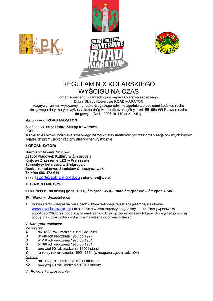 PK ESPÓŁ LACÓWEK ULTURY REGULAMIN X KOLARSKIEGO WYŚCIGU NA CZAS organizowanego w ramach cyklu imprez kolarstwa szosowego Dobre Sklepy Rowerowe ROAD MARATON rozgrywanym na wyłączonym z ruchu drogowego odcinku zgodnie z przepisami kodeksu ruchu drogowego dotyczącymi wykorzystania dróg w sposób szczególny – art. 65, 65a-65i Prawa o ruchu drogowym (Dz.U. 2003 Nr 149 poz. 1451). Nazwa cyklu: ROAD MARATON Sponsor tytularny: Dobre Sklepy Rowerowe I CEL: Wspieranie i rozwój kolarstwa szosowego wśród kolarzy amatorów poprzez organizację otwartych imprez kolarskich promujących regiony atrakcyjne turystycznie. II ORGANIZATOR: Burmistrz Gminy Żmigród Zespół Placówek Kultury w Żmigrodzie Krajowe Zrzeszenie LZS w Warszawie Sympatycy kolarstwa w Żmigrodzie Osoba kontaktowa: Stanisław Chorążyczewski Telefon 696-472-639 e-mail [email protected] ; [email protected] III TERMIN I MIEJSCE: 01.05.2011 r. (niedziela) godz. 12.00, Żmigród OSiR– Ruda Żmigrodzka – Żmigród OSiR. IV. Warunki Uczestnictwa 1. Prawo startu w imprezie mają osoby, które dokonają rejestracji pisemnej na stronie www.roadmaraton.pl lub osobiście w dniu imprezy do godziny 11.00. Płacą wpisowe w wysokości 30zł oraz podpiszą oświadczenie o braku przeciwwskazań lekarskich i wyrażą pisemną zgodę na uczestnictwo wyłącznie na własną odpowiedzialność. V. Kategorie wiekowe Mężczyźni: A do lat 30 rok urodzenia 1993 do 1981 B 31-40 rok urodzenia 1980 do 1971 C 41-50 rok urodzenia 1970 do 1961 D 51-60 rok urodzenia 1960 do 1951 E powyżej 60 rok urodzenia 1950 i starsi M juniorzy rok urodzenia 1995 i 1994 (wymagana zgoda rodziców) Kobiety K1 do lat 40 rok urodzenia 1971 i młodsze K2 powyżej 40 rok urodzenia 1970 i starsze VI. Rowery i wyposażenie 1. Rower zgodnie z przepisami kodeksu drogowego i spełniający następujące warunki: dwa koła jednakowej średnicy minimum 26 cali. Kierownica i siodełko powyżej linii poziomej poprowadzonej przez najwyższy punkt opony przedniego i tylnego koła. 2. Uczestnik imprezy obowiązany jest do jazdy w atestowanym kasku sztywnym na całej trasie. 3. Naruszenie tych zasad powoduje dyskwalifikację uczestnika. VII. Dystans 1. Dystans czasówki – 19,3 km. VIII. Organizacja startu 1. Podczas jazdy na czas - wszyscy z danej kategorii wiekowej jadą kolejno wg listy startowej. Odstępy czasowe co 2 minuty. Kolejność startu kategorii: K1, K2, M, E, D, C, B, A. IX. Klasyfikacja na imprezie 1. Klasyfikacja prowadzona jest dla kategorii określonych w pkt V regulaminu. 2. O miejscu decyduje czas przejazdu trasy przez uczestnika czasówki. X. Nagrody i wyróżnienia na imprezie 1. Puchary za minimum trzy pierwsze miejsca (od 1 do 3) w każdej kategorii wiekowej. 2. Nagrody w formie konkursu wśród wszystkich, którzy ukończyli zawody. 3. Organizator imprezy może zwiększyć ilość i rodzaje wyróżnień w miarę własnych możliwości. XI. Obowiązki uczestnika imprezy Każdy z uczestników imprezy zobowiązany jest do: - przestrzegania regulaminu imprezy - zachowania zasad bezpieczeństwa w ruchu drogowym - realizowania w trakcie imprezy poleceń policji i organizatorów imprezy - jazdy w kasku na całym dystansie - kulturalnego zachowywania się - samodzielnego pokonania wyznaczonej trasy XII. Obowiązki i prawa organizatora imprezy 1. Organizator akceptacje zapisy regulaminu cyklu Road Maraton. 2. Organizator imprezy zobowiązuje się do: a. Promowania imprezy zgodnie z oczekiwaniami zaangażowanych samorządów i pozyskanych sponsorów. b. Opublikowania regulaminu imprezy spójnego z zasadami cyklu ROAD MARATON c. Umieszczania we wszystkich materiałach związanych z imprezą pełnej informacji o nazwie cyklu w odpowiednim brzmieniu wraz z logo ROAD MARATON oraz o ewentualnych sponsorach cyklu. d. Wyznaczenia trasy z uwzględnieniem zasad bezpieczeństwa i wygody uczestników. e. Czytelne oznakowanie trasy. f. Ubezpieczenia od NNW wszystkich uczestników g. Zabezpieczenia niezbędnej opieki medycznej. h. Zorganizowania punktu kontrolnego (jna półmetku). i. Korzystania z numerów startowych ( umieszczanych na plecach ). j. Zorganizowania obsługi mety w sposób umożliwiający ustalenie kolejności przejeżdżania przez linię końcową uczestników imprezy. k. Przygotowania podium dla najlepszych. l. Ufundowania pucharów dla najlepszych uczestników. m. Dekoracji najlepszych w dniu imprezy nie później niż o godzinie 18. n. Ufundowania kompletu pucharów dla wskazanej przez Koordynatora jednej kategorii klasyfikacyjnej i wręczenie ich na zakończenie cyklu. o. Fotograficznego dokumentowania imprezy i bezpłatne udostępnienie zdjęć w internecie. p. Przekazanie Koordynatorowi cyklu elektronicznego pliku z ostatecznymi i oficjalnymi wynikami imprezy do 3 dni po jej zakończeniu na adres mailowy [email protected] r. Zabezpieczenia kalorycznego posiłku dla uczestników kończących imprezę. s. Aktywnej pomocy i udziału w organizacji ceremonii dekoracyjnej na zakończenie cyklu. 4. Organizator imprezy uprawniony jest do: a. Ostatecznego rozstrzygania spraw spornych na swojej imprezie. b. Wnioskowania do Koordynatora, z podaniem przyczyny, o usunięcie z cyklu uczestników rażąco naruszających zasady rozgrywania imprezy oraz zgłaszania zmian i uzupełnień do regulaminu cyklu na rok przyszły. Organizatorzy