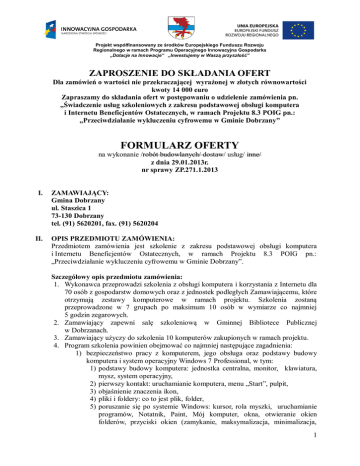 Projekt współfinansowany ze środków Europejskiego Funduszu Rozwoju Regionalnego w ramach Programu Operacyjnego Innowacyjna Gospodarka „Dotacje na Innowacje” „Inwestujemy w Waszą przyszłość” ZAPROSZENIE DO SKŁADANIA OFERT Dla zamówień o wartości nie przekraczającej wyrażonej w złotych równowartości kwoty 14 000 euro Zapraszamy do składania ofert w postępowaniu o udzielenie zamówienia pn. „Świadczenie usług szkoleniowych z zakresu podstawowej obsługi komputera i Internetu Beneficjentów Ostatecznych, w ramach Projektu 8.3 POIG pn.: „Przeciwdziałanie wykluczeniu cyfrowemu w Gminie Dobrzany” FORMULARZ OFERTY na wykonanie /robót budowlanych/ dostaw/ usług/ inne/ z dnia 29.01.2013r. nr sprawy ZP.271.1.2013 I. II. ZAMAWIAJĄCY: Gmina Dobrzany ul. Staszica 1 73-130 Dobrzany tel. (91) 5620201, fax. (91) 5620204 OPIS PRZEDMIOTU ZAMÓWIENIA: Przedmiotem zamówienia jest szkolenie z zakresu podstawowej obsługi komputera i Internetu Beneficjentów Ostatecznych, w ramach Projektu 8.3 POIG pn.: „Przeciwdziałanie wykluczeniu cyfrowemu w Gminie Dobrzany”. Szczegółowy opis przedmiotu zamówienia: 1. Wykonawca przeprowadzi szkolenia z obsługi komputera i korzystania z Internetu dla 70 osób z gospodarstw domowych oraz z jednostek podległych Zamawiającemu, które otrzymają zestawy komputerowe w ramach projektu. Szkolenia zostaną przeprowadzone w 7 grupach po maksimum 10 osób w wymiarze co najmniej 5 godzin zegarowych. 2. Zamawiający zapewni salę szkoleniową w Gminnej Bibliotece Publicznej w Dobrzanach. 3. Zamawiający użyczy do szkolenia 10 komputerów zakupionych w ramach projektu. 4. Program szkolenia powinien obejmować co najmniej następujące zagadnienia: 1) bezpieczeństwo pracy z komputerem, jego obsługa oraz podstawy budowy komputera i system operacyjny Windows 7 Professional, w tym: 1) podstawy budowy komputera: jednostka centralna, monitor, klawiatura, mysz, system operacyjny, 2) pierwszy kontakt: uruchamianie komputera, menu „Start”, pulpit, 3) objaśnienie znaczenia ikon, 4) pliki i foldery: co to jest plik, folder, 5) poruszanie się po systemie Windows: kursor, rola myszki, uruchamianie programów, Notatnik, Paint, Mój komputer, okna, otwieranie okien folderów, przyciski okien (zamykanie, maksymalizacja, minimalizacja, 1 Projekt współfinansowany ze środków Europejskiego Funduszu Rozwoju Regionalnego w ramach Programu Operacyjnego Innowacyjna Gospodarka „Dotacje na Innowacje” „Inwestujemy w Waszą przyszłość” przyciski standardowe), 6) skróty na pulpicie i ich zastosowanie: co to jest skrót, tworzenie skrótu i umieszczenie go na pulpicie, 7) panel sterowania: uruchamianie, funkcje panelu sterowania, instalacja i zarządzanie drukarkami, programy (instalacja, usuwanie), konta użytkowników, uprawnienia użytkowników, zegar, opcje regionalne. 2) Operacje na plikach i folderach, w tym: 1) tworzenie folderu: tworzenie, nadawanie nazw folderom, 2) tworzenie pliku, 3) kopiowanie plików i folderów, 4) przenoszenie plików i folderów, 5) usuwanie plików i folderów. 3) Edytor tekstu, w tym: 1) opis najważniejszych funkcji, 2) podstawowa edycja tekstu, 3) tworzenie tabel, 4) usuwanie tabel, 5) edytowanie tabel, 6) formatowanie komórek tabel, 7) nagłówek i stopka: wstawianie, formatowanie, układ, 8) grafika w edytorze tekstu: wstawianie plików i obiektów clipart, 9) drukowanie dokumentu: planowanie wydruku, podgląd wydruku. 4) Arkusz kalkulacyjny, w tym: 1) czym jest arkusz kalkulacyjny: najważniejsze składniki, dane, formatowanie komórek, obszary danych, wygląd , podstawowe funkcje, 2) wpisywanie podstawowych funkcji: dodawanie, odejmowanie, mnożenie, dzielenie, operatory funkcji, 3) wybieranie prostych funkcji: menu funkcji, kopiowanie, przeciąganie, 4) sortowanie danych, 5) tworzenie prostych wykresów. 5) Program antywirusowy, w tym: 1) co to jest wirus? 2) rodzaje wirusów, 3) rola programów antywirusowych, 4) aktualizacja definicji wirusów, 5) konfiguracja programu antywirusowego. 6) Internet, w tym: 1) co to jest Internet? 2) przeglądarki internetowe, Internet Eksplorer, Mozilla Firefox, Opera, przyciski nawigacji, wpisywanie adresów, wyszukiwanie informacji, przeglądanie stron, 3) poczta elektroniczna: co to jest, zalety poczty elektronicznej, konta e-mail, portale internetowe, zakładanie konta pocztowego, spam. 5. Wykonawca zagwarantuje kadrę szkoleniową dysponującą doświadczeniem, odpowiednią wiedzą i umiejętnościami do realizacji szkoleń. 2 Projekt współfinansowany ze środków Europejskiego Funduszu Rozwoju Regionalnego w ramach Programu Operacyjnego Innowacyjna Gospodarka „Dotacje na Innowacje” „Inwestujemy w Waszą przyszłość” 6. Zamawiający zapewni rzutnik lub inny sprzęt umożliwiający pokaz prezentacji w celu lepszego przedstawienia materiału dydaktycznego uczestnikom szkolenia. 7. Wykonawca zapewni wyposażenie każdego uczestnika zajęć w materiały szkoleniowe i pomoce naukowe niezbędne do zrealizowania odpowiedniego programu szkolenia w wersji papierowej i elektronicznej (płyta CD), które po zakończenym szkoleniu przekaże osobom szkolonym na własność. Dotyczy to także innych materiałów, które Wykonawca uzna za pomocne w celu usystematyzowania wiedzy i przygotuje dla uczestników szkoleń. 8. Na materiałach szkoleniowych Wykonawca umieści nazwę i logo Zamawiającego, tytuł projektu oraz oznaczenia i opisy dotyczące współfinansowania z Europejskiego Funduszu Rozwoju Regionalnego zgodne z Wytycznymi w zakresie oznaczania projektów w ramach Programu Operacyjnego Innowacyjna Gospodarka 2007-2013. 9. Wykonawca zobowiązany jest do wydania każdemu uczestnikowi szkolenia Certyfikatu ukończenia szkolenia współfinansowanego ze środków Europejskiego Funduszu Rozwoju Regionalnego w ramach Programu Operacyjnego Innowacyjna Gospodarka 2007-2013, który będzie zawierał między innymi informację o zrealizowanym zakresie tematycznym ora