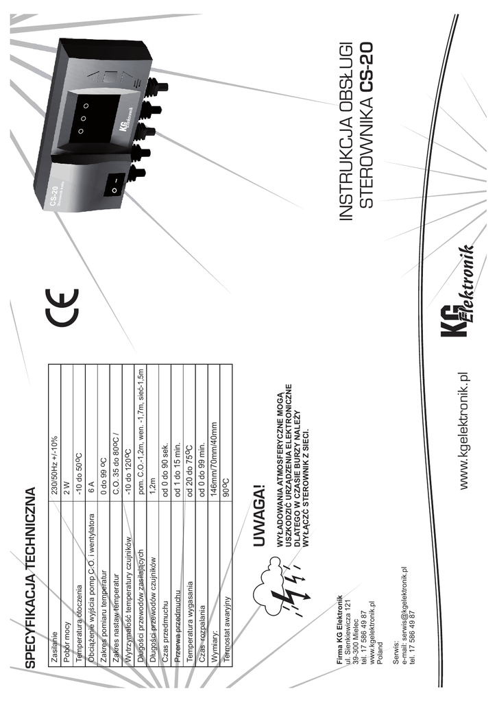 -10 do 50 oC 6A 0 do 99 oC C.O. 35 do 80 oC / -10 do 120 oC pom. C.O.-1,2m, wen. -1,7m, sieæ-1,5m 1,2m od 0 do 90 sek. od 1 do 15 min. od 20 do 75 oC od 0 do 99 min. 146mm/70mm/40mm 90 oC Temperatura otoczenia Obci¹¿enie wyjœcia pomp C.O. i wentylatora Zakres nastaw temperatur Wytrzyma³oœæ temperatury czujników D³ugoœci przewodów zasilaj¹cych D³ugoœci przewodów czujników Czas przedmuchu Serwis: e-mail: [email protected] tel. 17 586 49 87 Firma KG Elektronik ul. Sienkiewicza 121 39-300 Mielec tel. 17 586 49 87 www.kgelektronik.pl Poland Termostat awaryjny Wymiary: Czas rozpalania Temperatura wygasania Przerwa przedmuchu www.kgelektronik.pl WY£ADOWANIA ATMOSFERYCZNE MOG¥ USZKODZIÆ URZ¥DZENIA ELEKTRONICZNE DLATEGO W CZASIE BURZY NALE¯Y WY£¥CZÆ STEROWNIK Z SIECI. UWAGA! 2W Pobór mocy Zakres pomiaru temperatur 230/50Hz +/-10% Zasilanie SPECYFIKACJA TECHNICZNA Elektronik INSTRUKCJA OBS£UGI STEROWNIKA CS-20 k kot³a CS-20 Sterow ni zasilanie pompy C.O. zasilanie wentylatora termik Elektronik czujnik C.O. alarm dŸwiêkowy klawisz minus klawisz menu oraz start/stop klawisz plus wyœwietlacz wskaŸnik pracy wetntylatora wskaŸnik pracy pompy C.O. Wejœcie do menu nastêpuje po przyciœniêciu przycisku ., natomiast wartoœci ustawiamy klawiszami Po ustawieniu ¿¹danych wartoœci sterownik zapamiêta je i po kilku sekundach sam wróci do pracy. Sterownik wyposa¿ony jest w alarm sygnalizuj¹cy zbyt wysoka temperaturê kot³a (90 oC). Funkcja Anty stop zapobiega zastaniu siê pompy poza sezonem grzewczym uruchamiaj¹c j¹ co 14 dni na 15 sekund. Funkcja Anty Zamarzanie za³¹cza pompê C.O. w przypadku gdy temperatura cieczy w obiegu spadnie poni¿ej 5 oC OBS£UGA STEROWNIKA Po w³¹czeniu zasilania sterownik automatycznie przechodzi w tryb rozpalania. Do menu sterownika wchodzimy naciskaj¹c klawisz . Na wyœwietlaczu pojawi siê pulsuj¹ca temperatura zadana kot³a, mamy wówczas mo¿liwoœæ ustawienia ¿¹danej temperatury jak¹ sterownik ma utrzymywaæ - klawiszami Po ustawieniu ¿¹danej temperatury ponownie wciskamy przycisk . . Na wyœwietlaczu pojawi siê F oraz wybrany aktualnie numer funkcji. Nastêpnie wybieramy funkcje, która nas interesuje klawiszami . Po wybraniu ¿¹danej funkcji sterownik sam wróci do pracy .W przypadku funkcji F5 nale¿y wcisn¹æ klawisz aby przejœæ do indywidualnych ustawieñ u¿ytkownika. Pojawi¹ siê nam kolejno funkcje: C-temp za³¹czenia pompy C.O. D-moc wentylatora 1-czas przedmuchu 2-przerwa przedmuchu 3-temperatura wygasania 4-czas rozpalania W funkcjach od F1 do F4 , tj. moc dmuchawy, temperaturê za³¹czenia pompy C.O. oraz temperaturê wygasania pieca, sterownik dostosowuje automatycznie dziêki zastosowaniu algorytmu control smart. Moc dmuchawy jest zmniejszana w funkcji F1, kiedy temperatura kot³a zbli¿a siê do zadanej przez u¿ytkownika temperatury pieca. Wygaszanie kot³a mieœci siê w przedziale od 35 oC do 50oC, Pompa C.O. jest za³¹czana w przedziale od 30 oC do 40oC, w zale¿noœci od zadanej temperatury pieca. Funkcja F5 pozwala indywidualnie wed³ug potrzeb regulowaæ wszystkie parametry pracy sterownika tj. temp. Za³¹czenia pompy C.O., moc wentylatora, przerwy oraz d³ugoœæ przedmuchu, temp. rozpalania oraz czas wygasania kot³a. Funkcja F1 drewno oraz wêgiel (p³ynna moc dmuchawy) Funkcja F2 drewno (moc dmuchawy 20% + przedmuchy) Funkcja F3 wêgiel (moc dmuchawy 50% + przedmuchy) Funkcja F4 mia³ (moc dmuchawy 100% + przedmuchy) Funkcja F5 ustawienia w³asne Zasada dzia³ania Sterownik CS-20 steruje pomp¹ C.O. oraz wentylatorem nadmuchowym. Przeznaczony jest do sterowania kot³ami na paliwo sta³e. drewno, wêgiel, mia³. U¿ytkownik ma do wyboru 5 wersji trybów pracy sterownika uwarunkowanych rodzajem opa³u oraz typem kot³a. Pierwsz¹ czynnoœæ jak¹ musi wykonaæ u¿ytkownik przed rozpoczêciem eksploatacji sterownika jest ustawienie temperatury pieca, jak¹ ma utrzymywaæ sterownik podczas pracy kot³a oraz wybraæ tryb pracy sterownika w menu (F). zasilanie 230 V Sterownik kot³a CS-20 WskaŸnik zasilania OPIS STEROWNIKA .............................................. data sprzeda¿y .............................................. pieczêæ sprzedawcy GWARANCJA Producent zapewnia nabywcy prawid³owe dzia³anie urz¹dzenia przez okres 24 miesiêcy od daty sprzeda¿y. Gwarant zobowi¹zuje siê do naprawy urz¹dzenia, je¿eli wady wyst¹pi³y z winy producenta. Urz¹dzenie nale¿y dostarczyæ do miejsca zakupu, za³¹czaj¹c niniejsz¹ gwarancje z potwierdzon¹ dat¹ zakupu. Wszelkie zwi¹zane z tym koszty ponosi u¿ytkownik. Gwarancja nie obejmuje uszkodzeñ powsta³ych w wyniku niew³aœciwego u¿ytkowania, b¹dŸ z winy u¿ytkownika, uszkodzeñ mechanicznych lub powsta³ych w wyniku wy³adowañ atmosferycznych lub zwarcia. Gwarancja na sprzedany towar konsumpcyjny nie wy³¹cza, nie ogranicza, ani nie zawiesza uprawnieñ kupuj¹cego wynikaj¹cych z niezgodnoœci towaru z umow¹. Informacja o pozbywaniu siê urz¹dzeñ elektrycznych i elektronicznych Przedstawiony symbol umieszczony na produktach lub do³¹czonej do nich dokumentacji informuje, ¿e niesprawnych urz¹dzeñ elektrycznych lub elektronicznych nie mo¿na wyrzucaæ razem z odpadami gospodarczymi. Prawid³owe postêpowanie w razie koniecznoœci utylizacji, powtórnego u¿ycia lub odzysku podzespo³ów polega na przekazaniu urz¹dzenia do wyspecjalizowanego punktu zbiórki, gdzie bêdzie przyjête bezp³atnie. W niektórych krajach produkt mo¿na oddac lokalnemu dystrybutorowi podczas zakupu innego urz¹dzenia. Prawid³owa utylizacja urz¹dzenia umo¿liwia zachowanie cennych zasobów i unikniêcie negatywnego wp³ywu na zdrowie i œrodowisko, które mo¿e byæ zagro¿one przez nieodpowiednie postêpowanie z odpadami. Szczegó³owe informacje o najbli¿szym punkcie zbiórki mo¿na uzyskaæ u w³adz lokalnych. Nieprawid³owa utylizacja odpadów zagro¿ona jest karami przewidzianymi w odpowiednich przepisach lokalnych. Sposób monta¿u