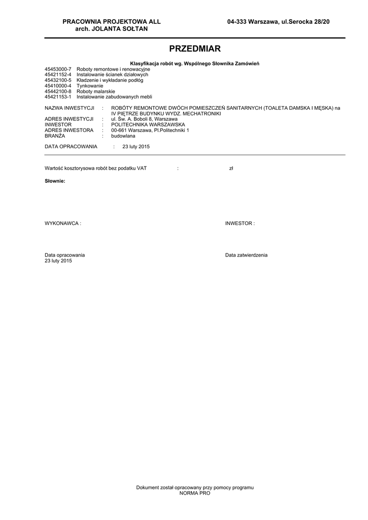 PRACOWNIA PROJEKTOWA ALL arch. JOLANTA SOŁTAN 04-333 Warszawa, ul.Serocka 28/20 PRZEDMIAR 45453000-7 45421152-4 45432100-5 45410000-4 45442100-8 45421153-1 Klasyfikacja robót wg. Wspólnego Słownika Zamówień Roboty remontowe i renowacyjne Instalowanie ścianek działowych Kładzenie i wykładanie podłóg Tynkowanie Roboty malarskie Instalowanie zabudowanych mebli NAZWA INWESTYCJI : ADRES INWESTYCJI INWESTOR ADRES INWESTORA BRANŻA : : : : DATA OPRACOWANIA ROBÓTY REMONTOWE DWÓCH POMIESZCZEŃ SANITARNYCH (TOALETA DAMSKA I MĘSKA) na IV PIĘTRZE BUDYNKU WYDZ. MECHATRONIKI ul. Św. A. Boboli 8, Warszawa POLITECHNIKA WARSZAWSKA 00-661 Warszawa, Pl.Politechniki 1 budowlana : 23 luty 2015 Wartość kosztorysowa robót bez podatku VAT : zł Słownie: WYKONAWCA : INWESTOR : Data opracowania 23 luty 2015 Data zatwierdzenia Dokument został opracowany przy pomocy programu NORMA PRO OGÓLNA CHARAKTERYSTYKA OBIEKTU Przedmiotem opracowania jest remont dwóch pomieszczeń sanitarnych- toalety damskiej i męskiej, na poziomie 4go piętra w budynku Wydziału Mechatroniki Politechniki Warszawskiej przy ul.Św.A.Boboli 8. W ramach remontu elementy istniejącego wyposażenia zostaną zdemontowane, zostają wyburzone ścianki wydzielające kabiny oraz zostaje zdemontowana istniejąca posadzka z lastrico. Remont węzłów ma za zadanie podniesienie standardu. Sanitariaty znajdują się na poziomie 4-go piętra w budynku Wydziału Mechatroniki Politechniki Warszawskiej przy ul.Św.A.Boboli 8. Przedmiotowe sanitariaty nie są przeznaczone dla osób niepełnosprawnych. Powierzchnie TOALETA MĘSKA przedsionek z umywalkami 5,00 m2 pom.z pisuarami i kabinami WC 9,35 m2 TOALETA DAMSKA przedsionek z umywalkami 5,13 m2 pom.z kabinami WC 7,69 m2 Wysokość do stropu - 3,08 m do sufitu podwieszanego nad umywalkami- 2,74m do sufitu podwieszanego nad pisuarami- 2,24m -2- Norma PRO Wersja 4.35 Nr seryjny: 22179 Użytkownik: DevisArt sp. z o.o. SPIS DZIAŁÓW PRZEDMIARU ROBÓT Lp. 1 Nazwa 2 1 Rozbiórki i demontaże 2 Prace odtworzeniowe i wykończeniowe 3 Wyposażenie RAZEM Wartość kosztorysowa robót bez podatku VAT Słownie: -3- Norma PRO Wersja 4.35 Nr seryjny: 22179 Użytkownik: DevisArt sp. z o.o. Pozycje kosztorysowe 3 1 - 12 13 - 42 43 - 53 PRZEDMIAR Lp. Kod pozy- Nr spec. cji przedtechn. miaru 1 1 1.1 SST 01 d.1 2 1.2 d.1 3 1.3 d.1 4 1.4 d.1 5 1.5 d.1 6 1.6 d.1 7 1.7 d.1 8 1.8 d.1 9 1.9 d.1 10 1.10 d.1 11 1.11 d.1 12 1.12 d.1 2 13 2.1 d.2 14 2.2 d.2 15 2.3 d.2 16 2.4 d.2 17 2.5 d.2 SST 02 SST 02 SST 02 SST 04 SST 03 SST 01 SST 05 SST 01 SST 01 SST 01 SST 01 SST 04 SST 04 SST 04 SST 04 SST 03 Opis i wyliczenia j.m. Rozbiórki i demontaże Zabezpieczenie otworów drzwiowych przez przedostawaniem się pyłu kpl poza pomieszczenia modernizowane podczas prac 2 kpl Wykucie z muru ościeżnic stalowych lub krat drzwiowych o powierzchni szt. do 2 m2 10 szt. Wykucie z muru ościeżnic drewnianych okien nad drzwiami o powierz- szt. chni do 1 m2 2 szt. Rozebranie ścianek z cegieł na zaprawie cementowo-wapiennej o gru- m2 bości 1/2 ceg. (1.28*3+0.78*3+0.12*3+1.28*3+0.76*3+0.12*3)*2.2-0.7*2*6 m2 Rozebranie okładziny ściennej m2 1.6*(0.76+2+0.76+0.91+2.78+0.6+0.6+2.78+0.92) m2 Rozebranie posadzek lastrykowych m2 28.47 m2 Wykucie z muru kratek wentylacyjnych,drzwiczek szt. 4 szt. Zeskrobanie i zmycie starej farby w pomieszczeniach o powierzchni podłogi ponad 5 m2 (21.32+19.76)*3.08-2.64*2-19.376+28.47 m2 Wywiezienie materiałów drewnianych z demontażu samochodami samowyładowczymi na odległość 15 km wraz z utylizacją 8*0.04*0.8*2+0.12*0.06*(0.4+0.8+0.4+0.8)*2 m3 Wywiezienie materiałów szklanych z demontażu samochodami samowyładowczymi na odległość 15 km wraz z utylizacją 0.8*0.4*0.004*2 m3 Wywiezienie materiałów metalowych z demontażu samochodami samowyładowczymi na odległość 15 km wraz z utylizacją 8*0.12*0.06*(0.8+0.8+2) m3 m2 m3 m3 m3 Wywiezienie gruzu budowlanego samochodami samowyładowczymi na m3 odległość 15 km wraz z utylizacją 20.244*0.15+19.376*0.02+28.47*0.05 m3 Prace odtworzeniowe i wykończeniowe Dwukrotne odgrzybianie ścian ceglanych o powierzchni ponad 5 m2 metodą smarowania (21.32+19.76)*3.08-2.64*2 m2 m2 Uzupełnienie tynków wewnętrznych zwykłych kat.II z zaprawy cem.wap. na ścianach i słupach prostokątnych na podłożu z cegły, pustaków ceramicznych, gazo- i pianobetonów o powierzchni do 5 m2 w 1 miejscu - miejsca po odkutych płytkach ceramicznych 1.6*(0.76+2+0.76+0.91+2.78+0.6+0.6+2.78+0.92) m2 Uzupełnienie tynków wewnętrznych zwykłych kat.III z zaprawy cem.wap. na ścianach i słupach prostokątnych na podłożu z cegły, pustaków ceramicznych, gazo- i pianobetonów o powierzchni do 2 m2 w 1 miejscu - miejsca po wymianie drzwi wejściowych (2+2+1)*0.3 m2 m2 m2 m2 Izolowanie obiektów elastyczną powłoką cementowo-polimerową - po- m2 wierzchnie poziome 28.47 m2 Norma PRO Wersja 4.35 Nr seryjny: 22179 Użytkownik: DevisArt sp. z o.o. Razem 2.000 RAZEM 2.000 10.000 RAZEM 10.000 2.000 RAZEM 2.000 20.244 RAZEM 20.244 19.376 RAZEM 19.376 28.470 RAZEM 28.470 4.000 RAZEM 4.000 130.340 RAZEM 130.340 0.547 RAZEM 0.547 0.003 RAZEM 0.003 0.207 RAZEM 0.207 4.848 RAZEM 4.848 121.246 RAZEM 121.246 28.470 RAZEM 28.470 19.376 RAZEM 19.376 1.500 RAZEM 1.500 m2 Dwukrotne odgrzybianie stropów o powierzchni ponad 5 m2 metoda smarowania 28.47 -4- Poszcz 28.470 PRZEDMIAR Lp. Kod pozycji przedmiaru Nr spec. techn. Opis i wyliczenia j.m. Poszcz RAZEM 18 2.6 d.2 19 2.7 d.2 20 2.8 d.2 21 2.9 d.2 22 2.10 d.2 23 2.11 d.2 24 2.12 d.2 25 2.13 d.2 26 2.14 d.2 27 2.15 d.2 28 2.16 d.2 29 2.17 d.2 30 2.18 d.2 31 2.19 d.2 32 2.20 d.2 33 2.21 d.2 34 2.22 d.2 SST 04 SST 03 SST 03 SST 02 SST 08 SST 04 SST 04 SST 04 SST 05 SST 05 SST 05 SST 08 SST 08 SST 08 SST 01 SST 01 SST 01 Izolowanie obiektów elastyczną powłoką cementowo-polimerową - po- m2 wierzchnie pionowe (21.32+19.76)*3.08-2.64*2 m2 Warstwy wyrównawcze pod posadzki z zaprawy cementowej grubości m2 20 mm zatarte na ostro 