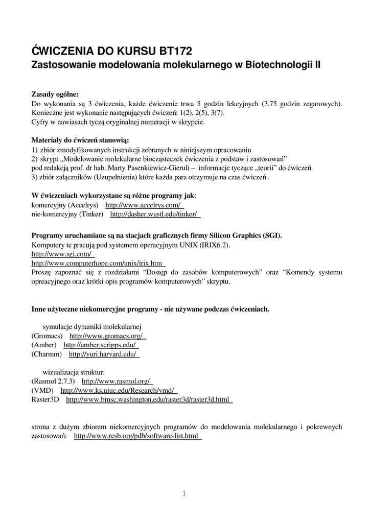 ĆWICZENIA DO KURSU BT172 Zastosowanie modelowania molekularnego w Biotechnologii II Zasady ogólne: Do wykonania są 3 ćwiczenia, każde ćwiczenie trwa 5 godzin lekcyjnych (3.75 godzin zegarowych). Konieczne jest wykonanie następujących ćwiczeń: 1(2), 2(5), 3(7). Cyfry w nawiasach tyczą oryginalnej numeracji w skrypcie. Materiały do ćwiczeń stanowią: 1) zbiór zmodyfikowanych instrukcji zebranych w niniejszym opracowaniu 2) skrypt „Modelowanie molekularne biocząsteczek ćwiczenia z podstaw i zastosowań” pod redakcją prof. dr hab. Marty Pasenkiewicz-Gieruli – informacje tyczące „teorii” do ćwiczeń. 3) zbiór załączników (Uzupełnienia) które każda para otrzymuje na czas ćwiczeń . W ćwiczeniach wykorzystane są róż ne programy jak: komercyjny (Accelrys) http://www.accelrys.com/ nie-komercyjny (Tinker) http://dasher.wustl.edu/tinker/ Programy uruchamiane są na stacjach graficznych firmy Silicon Graphics (SGI). Komputery te pracują pod systemem operacyjnym UNIX (IRIX6.2). http://www.sgi.com/ http://www.computerhope.com/unix/irix.htm Proszę zapoznać się z rozdziałami “Dostęp do zasobów komputerowych” oraz “Komendy systemu opreacyjnego oraz krótki opis programów komputerowych” skryptu. Inne uż yteczne niekomercyjne programy - nie uż ywane podczas ć wiczeniach. symulacje dynamiki molekularnej (Gromacs) http://www.gromacs.org/ (Amber) http://amber.scripps.edu/ (Charmm) http://yuri.harvard.edu/ wizualizacja struktur: (Rasmol 2.7.3) http://www.rasmol.org/ (VMD) http://www.ks.uiuc.edu/Research/vmd/ Raster3D http://www.bmsc.washington.edu/raster3d/raster3d.html strona z dużym zbiorem niekomercyjnych programów do modelowania molekularnego i pokrewnych zastosowań: http://www.rcsb.org/pdb/software-list.html 1 Ciekawe strony: BringingPhysicsto Life http://www.ks.uiuc.edu/Publications/Brochures/BPTL/ NationalScienceFoundation http://www.nsf.gov/ Centerfor BiophysicsandComputationalBiology http://www.life.uiuc.edu/biophysics/courses.html Zasoby internetowe Poniżej zestawiono, wraz ze zwięzłym opisem, wybrane strony internetowe (patrz 1-sze ćwiczenie), umożliwiające dostęp do informacji, które mogą być cenne dla osób zainteresowanych modelowaniem molekularnym, biotechnologią, badaniami strukturalnymi oraz pokrewnymi dziedzinami. Adresy stron internetowych napisane są czcionką pogrubioną. 1.MEDLINE – Baza danych literaturowych o tematyce medycznej i pokrewnych (m.in. biochemia, biofizyka). Literatura, odszukana według odpowiedniego “słowa kluczowego”, może być podana w formie odnoś nika, abstraktu lub niekiedy całego artykułu (w większoś ci wypadków całe artykuły można uzyskać jedynie na podstawie subskrypcji). Opcja Advanced Search umożliwia przeszukiwanie literatury z wykorzystaniem operatorów logicznych oraz “słów kluczowych” różnych typów. http://www.ncbi.nlm.nih.gov/PubMed 2. Biblioteka, zawierająca dane na temat zachowawczych fragmentów łańcuchów białek, należących do rodzin homologicznych pod względem struktury. http://smi-web.stanford.edu/projects/helix/LPFC 3. Strona, na której można znaleźć programy służące do analizy sekwencji aminokwasowej białek (peptydów) i przewidywania na tej podstawie m.in. ich struktury drugorzędowej oraz własnoś ci fizykochemicznych. http://pbil.ibcp.fr/html/pbil_index.html Tytuły ć wiczeń: 1. (skrypt ćw. nr 1(2)) Modelowanie mutacji peptydu i białka metodą zaburzania energii swobodnej oraz bezpośredniej wymiany aminokwasu. (G.Jezierski, M.Pasenkiewicz-Gierula) 2. (skrypt ćw. nr 2(5)) Porównanie fizykochemicznych własnoś ci i struktur biocząsteczek; algorytmy poszukiwania optymalnej struktury biocząsteczki. (K.Murzyn,M.Pasenkiewicz-Gierula) 3. (skrypt ćw. nr 3(7)) Wyznaczanie natywnej struktury biocząsteczki poprzez poszukiwanie minimum globalnego funkcji potencjału. (K.Murzyn,M.Pasenkiewicz-Gierula). 2 Ćwiczenie 1(2). Modelowanie mutacji peptytu i białka metodą zaburzenia energii swobodnej oraz bezpoś redniej wymiany aminokwasu (G. Jezierski, M. Pasenkiewicz-Gierula). Opracowanie ć wiczenia: Ćwiczenie należy opracować według punktów znajdujących się na końcu instrukcji oraz podać wyniki, opisy i wyjaś nienia zgodnie z punktami oznaczonymi w instrukcji dwoma gwiazdkami (**). Cel, teoria i wykonanie: Ćwiczenie 1(2) ma na celu zaznajomienie studentów z metodą zaburzenia energii swobodnej (FEP). Metoda ta będzie zastosowana do wymiany aminokwasu w tripeptydzie oraz obliczenia wielkoś ci termodynamicznych w reakcji wiązania zmutowanego peptydu do receptora. Pozwoli to na wyznaczenie względnej różnicy energii swobodnych (∆∆G) wiązania naturalnego i zmutowanego peptydu do receptora i okreś lenia, który z peptydów silniej wiąże się z receptorem. Metoda zaburzania energii swobodnej – wymiana aminokwasu w tripeptydzie. IA. Teoria: IA1. Założenia metody Metoda zaburzenia energii swobodnej (ang. FEP – Free Energy Perturbation) służy do obliczenia różnicy energii swobodnej (∆F = FA - FB) dwóch stanów A i B pozostających w równowadze termodynamicznej dla układów, w których zmiana energii swobodnej równa jest zmianie entalpii swobodnej (∆F = ∆G). W modelowaniu molekularnym metodę FEP wykorzystuje się najczęś ciej do wyznaczania względnej różnicy energii oddziaływania między makrocząsteczką a ligandem (ligand binding). Jeś li znana jest zmiana entalpii swobodnej (∆G) wiązania jednego liganda z makrocząsteczką, to przy pomocy metody FEP można wyznaczyć ∆G dla wiązania innego liganda z tą samą makrocząsteczką, jednakże cząsteczki obu ligandów muszę mieć podobną liczbę atomów i podobny rozkład ładunku, tj. muszą się niewiele różnić. Dla obliczenia ∆G korzysta się z procedury zwanej całkowaniem termodynamicznym oraz z przedstawionego niżej cyklu termodynamicznego. Obliczone wartoś ci ∆G obarczone są dużymi błędami, dlatego metodą FEP wyz