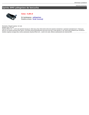 Informacje o produkcie Utworzono 04-03-2017 Spinka BMX półogniwo do łancucha Cena : 5,00 zł Nr katalogowy : półogniwo Średnia ocena : brak recenzji Parametry: Długość ogniwa: 1/2 cala Długość pina: 9,4 mm Złączka Offset Link - 1 pitch jest ogniwem łączącym, które łączy dwa różne końce łańcucha (ogniwo zewnętrzne z ogniwem wewnętrznym). Tradycyjny łańcuch ma zawsze parzystą ilość ogniw i minimalne skrócenie/wydłużenie łańcucha musi być o dwa ogniwa (1 cal). Jeżeli takie działanie jest utrudnione brakiem regulacji naciągu koła, można zastosować złączkę Offset Link - 1 pitch (1/2 cala). Główne zastosowanie do rowerów BMX