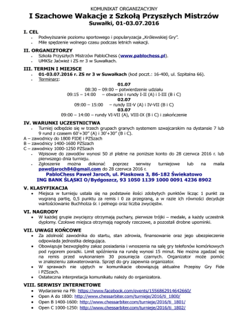 KOMUNIKAT ORGANIZACYJNY I Szachowe Wakacje z Szkołą Przyszłych Mistrzów Suwałki, 01-03.07.2016 I. CEL Podwyższanie poziomu sportowego i popularyzacja „Królewskiej Gry”. Miłe spędzenie wolnego czasu podczas letnich wakacji. II. ORGANIZTORZY Szkoła Przyszłych Mistrzów PabloChess (www.pablochess.pl). UMKSz Jaćwież i ZS nr 3 w Suwałkach. III. TERMIN I MIEJSCE 01-03.07.2016 r. ZS nr 3 w Suwałkach (kod poczt.: 16-400, ul. Szpitalna 66). Terminarz: 01.07 08:30 – 09:00 – potwierdzenie udziału 09:15 – 14:00 – otwarcie i rundy I-II (A) i I-III (B i C) 02.07 09:00 – 15:00 – rundy III-V (A) i IV-VII (B i C) 03.07 09:00 – 14:00 – rundy VI-VII (A), VIII-IX (B i C) i zakończenie IV. WARUNKI UCZESTNICTWA Turniej odbędzie się w trzech grupach granych systemem szwajcarskim na dystansie 7 lub 9 rund z czasem 60’+30” (A) i 30’+30” (B i C). A – zawodnicy do 1800 FIDE i PZSzach B – zawodnicy 1400-1600 PZSzach C – zawodnicy 1000-1250 PZSzach Wpisowe do zawodów wynosi 50 zł płatne na poniższe konto do 28 czerwca 2016 r. lub pierwszego dnia turnieju. Zgłoszenie można dokonać poprzez serwisy turniejowe lub na maila [email protected] do 28 czerwca 2016 r. PabloChess Paweł Jaroch, ul. Piaskowa 3, 86-182 Świekatowo ING BANK ŚLĄSKI O/Bydgoszcz, 93 1050 1139 1000 0091 4236 8902 V. KLASYFIKACJA Miejsca w turnieju ustala się na podstawie ilości zdobytych punktów licząc 1 punkt za wygraną partię, 0,5 punktu za remis i 0 za przegraną, a w razie ich równości decyduje wartościowanie Buchholza śr. i pełnego oraz liczba zwycięstw. VI. NAGRODY W każdej grupie zwycięzcy otrzymają puchary, pierwsze trójki – medale, a każdy uczestnik dyplomy. Czołowe miejsca otrzymają nagrody rzeczowe, a pozostali drobne upominki. VII. UWAGI KOŃCOWE Za zdolność zawodnika do startu, stan zdrowia, finansowanie oraz jego ubezpieczenie odpowiada jednostka delegująca. Obowiązuje bezwzględny zakaz posiadania i wnoszenia na salę gry telefonów komórkowych pod rygorem porażki. Limit spóźnienia na rundę wynosi 15 minut. Nie można zgadzać się na remis przed wykonaniem 30 posunięcia czarnych. Organizator może pomóc w znalezieniu zakwaterowania. Sprzęt do gry zapewnia organizator. W sprawach nie ujętych w komunikacie obowiązują aktualne Przepisy Gry Fide i PZSzach. Ostateczna interpretacja komunikatu należy do organizatora. VIII. SERWISY INTERNETOWE Wydarzenie na FB: https://www.facebook.com/events/1556862914642660/ Open A do 1800: http://www.chessarbiter.com/turnieje/2016/ti_1800/ Open B 1400-1600: http://www.chessarbiter.com/turnieje/2016/ti_1801/ Open C 1000-1250: http://www.chessarbiter.com/turnieje/2016/ti_1802/