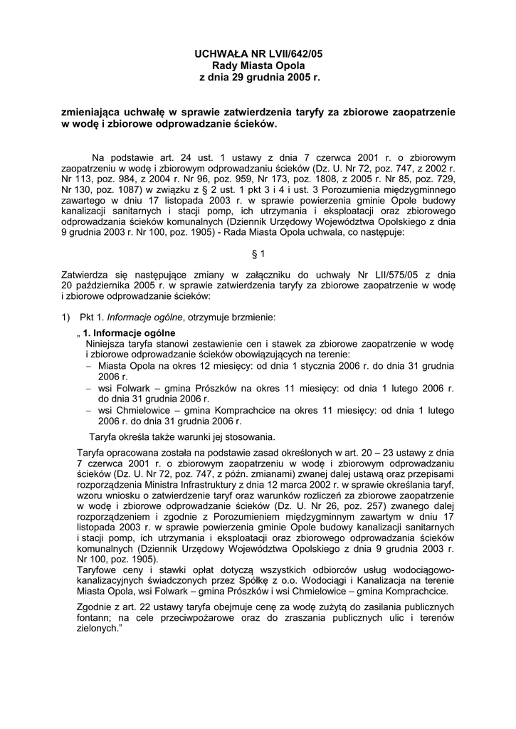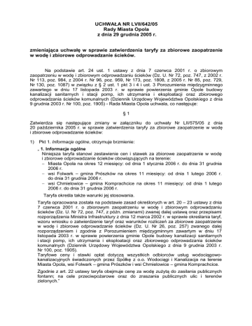 UCHWAŁA NR LVII/642/05 Rady Miasta Opola z dnia 29 grudnia 2005 r. zmieniająca uchwałę w sprawie zatwierdzenia taryfy za zbiorowe zaopatrzenie w wodę i zbiorowe odprowadzanie ścieków. Na podstawie art. 24 ust. 1 ustawy z dnia 7 czerwca 2001 r. o zbiorowym zaopatrzeniu w wodę i zbiorowym odprowadzaniu ścieków (Dz. U. Nr 72, poz. 747, z 2002 r. Nr 113, poz. 984, z 2004 r. Nr 96, poz. 959, Nr 173, poz. 1808, z 2005 r. Nr 85, poz. 729, Nr 130, poz. 1087) w związku z § 2 ust. 1 pkt 3 i 4 i ust. 3 Porozumienia międzygminnego zawartego w dniu 17 listopada 2003 r. w sprawie powierzenia gminie Opole budowy kanalizacji sanitarnych i stacji pomp, ich utrzymania i eksploatacji oraz zbiorowego odprowadzania ścieków komunalnych (Dziennik Urzędowy Województwa Opolskiego z dnia 9 grudnia 2003 r. Nr 100, poz. 1905) - Rada Miasta Opola uchwala, co następuje: §1 Zatwierdza się następujące zmiany w załączniku do uchwały Nr LII/575/05 z dnia 20 października 2005 r. w sprawie zatwierdzenia taryfy za zbiorowe zaopatrzenie w wodę i zbiorowe odprowadzanie ścieków: 1) Pkt 1. Informacje ogólne, otrzymuje brzmienie: „ 1. Informacje ogólne Niniejsza taryfa stanowi zestawienie cen i stawek za zbiorowe zaopatrzenie w wodę i zbiorowe odprowadzanie ścieków obowiązujących na terenie: Miasta Opola na okres 12 miesięcy: od dnia 1 stycznia 2006 r. do dnia 31 grudnia 2006 r. wsi Folwark – gmina Prószków na okres 11 miesięcy: od dnia 1 lutego 2006 r. do dnia 31 grudnia 2006 r. wsi Chmielowice – gmina Komprachcice na okres 11 miesięcy: od dnia 1 lutego 2006 r. do dnia 31 grudnia 2006 r. Taryfa określa także warunki jej stosowania. Taryfa opracowana została na podstawie zasad określonych w art. 20 – 23 ustawy z dnia 7 czerwca 2001 r. o zbiorowym zaopatrzeniu w wodę i zbiorowym odprowadzaniu ścieków (Dz. U. Nr 72, poz. 747, z późn. zmianami) zwanej dalej ustawą oraz przepisami rozporządzenia Ministra Infrastruktury z dnia 12 marca 2002 r. w sprawie określania taryf, wzoru wniosku o zatwierdzenie taryf oraz warunków rozliczeń za zbiorowe zaopatrzenie w wodę i zbiorowe odprowadzanie ścieków (Dz. U. Nr 26, poz. 257) zwanego dalej rozporządzeniem i zgodnie z Porozumieniem międzygminnym zawartym w dniu 17 listopada 2003 r. w sprawie powierzenia gminie Opole budowy kanalizacji sanitarnych i stacji pomp, ich utrzymania i eksploatacji oraz zbiorowego odprowadzania ścieków komunalnych (Dziennik Urzędowy Województwa Opolskiego z dnia 9 grudnia 2003 r. Nr 100, poz. 1905). Taryfowe ceny i stawki opłat dotyczą wszystkich odbiorców usług wodociągowokanalizacyjnych świadczonych przez Spółkę z o.o. Wodociągi i Kanalizacja na terenie Miasta Opola, wsi Folwark – gmina Prószków i wsi Chmielowice – gmina Komprachcice. Zgodnie z art. 22 ustawy taryfa obejmuje cenę za wodę zużytą do zasilania publicznych fontann; na cele przeciwpożarowe oraz do zraszania publicznych ulic i terenów zielonych.” 2) W pkt 2. Rodzaj prowadzonej działalności po wyrazach „5 września 2002 r.” dodaje się: „oraz na obszarze gmin Komprachcice i Prószków na podstawie Porozumienia międzygminnego zawartego w dniu 17 listopada 2003 r. w sprawie powierzenia gminie Opole budowy kanalizacji sanitarnych i stacji pomp, ich utrzymania i eksploatacji oraz zbiorowego odprowadzania ścieków komunalnych.” 3) W pkt 3. Taryfowe grupy odbiorców usług dodaje się punkty 9 i 10 o treści: „9. dostawcy ścieków z terenu wsi Folwark – gmina Prószków odprowadzający ścieki o charakterze bytowym o średnim stężeniu ChZTCr : 650 mg O2 / l lub BZT5 : 280 mg O2 / l” „10. dostawcy ścieków z terenu wsi Chmielowice – gmina Komprachcice odprowadzający ścieki o charakterze bytowym o średnim stężeniu ChZT Cr : 650 mg O2 / l lub BZT5: 280 mg O2 / l” 4) W pkt 4. Rodzaje i wysokość cen i stawek opłat zmienia się tabelę 2 – Wysokość cen i stawek opłat za odprowadzane ścieki oraz dodaje się punkty 9, 10, 11. Zmieniona tabela 2 otrzymuje brzmienie: Tabela 2 Wysokość cen i stawek opłat za odprowadzane ścieki Lp. 1 1. 2. 3. 4. 5. 6. 7. Taryfowa grupa odbiorców Dopuszczalne wartości wskaźników zanieczyszczeń w odprowadzanych ściekach Stawka netto Jednostka miary 3 4 5 2,40 zł/m3 ChZTCr 1000 mgO2 /l BZT5 470 mgO2/l 2,99 zł/m3 ChZTCr 1800 mgO2 /l BZT5 850 mgO2/l 4,28 zł/m3 1800 mgO2/l < ChZTCr 2800 mgO2 /l 850 mgO2/l < BZT5 1320 mgO2/l 6,83 zł/m3 ChZTCr > 2800 mgO2 /l BZT5 > 1320 mgO2/l 7,65 zł/m3 4,50 zł/m3 7,65 zł/m3 0,59 zł/m3 2,90 zł/m3 2 Grupa I. Gospodarstwa domowe i zakłady odprowadzające wyłącznie ścieki o charakterze bytowym Grupa II. Zakłady odprowadzające ścieki komunalne – mieszanina ścieków bytowych 1) 3) i komunalnych Grupa III. Zakłady odprowadzające ścieki mieszane – mieszanina ścieków bytowych 2) i przemysłowych Grupa IV. Zakłady odprowadzające ścieki mieszane – mieszanina ścieków bytowych i przemysłowych Grupa V. Zakłady odprowadzające mieszaninę ścieków bytowych i przemysłowych Grupa VI. Dostawcy nieczystości ciekłych do stacji zlewnych – między innymi gospodarstwa domowe - ścieki bytowe Grupa VII. Od pozostałych dostawców nieczystości ciekłych do stacji zlewnych - ścieki przemysłowe Wartości średnie stężeń: ChZTCr : 650 mgO2/l BZT5 : 280 mgO2/l Wartości średnie stężeń: ChZTCr : 2000 mgO2/l BZT5 : 875 mgO2/l Wartości średnie stężeń: ChZTCr : 2800 mgO2/l BZT5 : 1320 mgO2/l Wartości średnie stężeń: 8. Grupa VIII. Ścieki opadowe 9. ChZTCr : 250 mgO2/l BZT5 : 120 mgO2/l Grupa IX. Dostawcy ścieków Wartości średnie stężeń: z terenu wsi Folwark – gmina Prószków odprowadzający ChZTCr : 650 mgO2/l ścieki o charakterze bytowym BZT : 280 mgO /l 5 2 2 10. 11. 5) Grupa X. Dostawcy ścieków Wartości średnie stężeń: z terenu wsi Chmielowice – gmina Komprachcice ChZTCr : 650 mgO2/l odprowadzający ścieki BZT5 : 280 mgO2/l o charakterze bytowym 3,40 zł/m3 Opłata