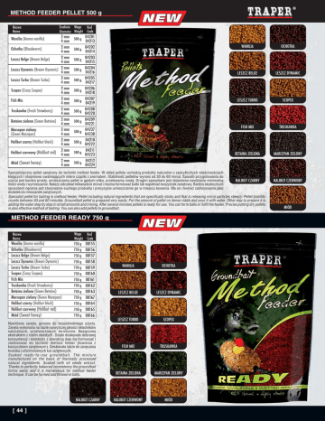 METHOD FEEDER PELLET 500 g Nazwa Name NEW Œrednica Waga Kod Diameter Weight Code 2 mm 4 mm 2 mm Ochotka (Bloodworm) 4 mm 2 mm Leszcz Belge (Bream Belge) 4 mm Leszcz Dynamic (Bream Dynamic) 2 mm 4 mm 2 mm Leszcz Turbo (Bream Turbo) 4 mm 2 mm Scopex (Crazy Scopex) 4 mm 2 mm Fish Mix 4 mm 2 mm Truskawka (Fresh Strawberry) 4 mm 2 Betaina zielona (Green Betaine) mm 4 mm 2 mm Marcepan zielony 4 mm (Green Marzipan) 2 mm Halibut czarny (Halibut black) 4 mm Halibut czerwony (Halibut red) 24 mm mm 2 mm Miód (Sweet honey) 4 mm Wanilia (Aroma vanilla) 500 g 04201 500 g 500 g 500 g 500 g 500 g 500 g 500 g 500 g 500 g 500 g 500 g 500 g 04213 04202 04214 04203 04215 04204 04216 04205 04217 04206 04218 04207 04219 04208 04220 04209 04221 04237 04238 04210 04222 04211 04223 04212 04224 WANILIA OCHOTKA LESZCZ BELGE LESZCZ DYNAMIC LESZCZ TURBO SCOPEX FISH MIX TRUSKAWKA BETAINA ZIELONA MARCEPAN ZIELONY Specjalistyczny pellet zanętowy do techniki method feeder. W skład pelletu wchodzą produkty naturalne o specyficznych właściwościach klejących i stopniowo uwalniających mikro cząstki z aromatem. Stabilność pelletów wynosi od 30 do 60 minut. Sposób przygotowania do użycia jest bardzo prosty, umieszczamy pellet w gęstym sitku, przelewamy wodą. Drugim sposobem jest stopniowe nawilżanie minimalną HALIBUT CZARNY ilości wody i wymieszanie. Należy odczekać kilkanaście minut i można formować kulki lub napełniać koszyczek zanętowy. Bardzo skutecznym sposobem nęcenia jest stosowanie suchego produktu i precyzyjne umieszczenie go w miejscu łowienia. Ma on również zastosowanie jako dodatek do mieszanek zanętowych. Specialist pellet for baiting in method feeder. Pellet including natural ingredients that are specifically sticky and that is releasing micro particles steeply. Pellet stability counts between 30 and 60 minutes. Groundbait pellet is prepared very easily. Put the amount of pellet on dense riddle and pour it with water. Other way to prepare it is adding the water step by step in small amounts and mixing. After several minutes pellets is ready for use. You can form balls or fulfil the feeder. Precise putting dry pellets is also effective method of baiting. You can also add pellets to groundbait. METHOD FEEDER READY 750 g Nazwa Name Wanilia (Aroma vanilla) Ochotka (Bloodworm) Leszcz Belge (Bream Belge) Leszcz Dynamic (Bream Dynamic) Leszcz Turbo (Bream Turbo) Scopex (Crazy Scopex) Fish Mix Truskawka (Fresh Strawberry) Betaina zielona (Green Betaine) Marcepan zielony (Green Marzipan) Halibut czarny (Halibut black) Halibut czerwony (Halibut red) Miód (Sweet honey) Waga Weight 750 g 750 g 750 g 750 g 750 g 750 g 750 g 750 g 750 g 750 g 750 g 750 g 750 g Kod Code 00155 00156 00157 00158 00159 00160 00161 00162 00163 00167 00164 00165 00166 Nawilżona zanęta, gotowa do bezpośredniego użycia. Zanęta wykonana na bazie najwyższej jakości składników naturalnych, przetworzonych termicznie. Nasączona ekstraktem z roślin oleistych. Dzięki doskonale dobranej konsystencji i kleistości z łatwością daje się formować i zastosować do techniki method feeder (łowienia z koszyczkiem zanętowym). Doskonała także do zanęcania łowiska z uformowanych kul zanętowych. Soaked ready-to-use groundbait. The mixture manufactured on the basis of thermally processed natural ingredients. Soaked with oil seeds extract. Thanks to perfectly balanced consistency the groundbait forms easily and it is tremendous for method feeder technique. It can be formed and thrown in balls. HALIBUT CZARNY [ 44 ] NEW WANILIA OCHOTKA LESZCZ BELGE LESZCZ DYNAMIC LESZCZ TURBO SCOPEX FISH MIX TRUSKAWKA BETAINA ZIELONA MARCEPAN ZIELONY HALIBUT CZERWONY MIÓD HALIBUT CZERWONY MIÓD NEW POP-UP METHOD FEEDER 30 g Pływająca przynęta haczykowa, przeznaczona do metody z koszyczkiem zanętowym. Bardzo skuteczna w połączeniu z innymi przynętami, tj. kukurydza , pellety. Pozwala na lepszą prezentację i podwyższa ich skuteczność. Floating hook bait purposed for method feeder. Extremely effective in connection with other baits: corn, pellet. Enables better bait presentation, increasing effectiveness. NEW Kod Code 18347 18348 18349 18350 18351 18352 18353 18354 18355 18356 18357 18358 18359 MINI BOILIES METHOD FEEDER 50 g Przynęta o bardzo szybkim działaniu. Doskonała do metody włosowej. Przeznaczona do łowienia wszystkich ryb karpiowatych. Kulki posiadają nawiercony otwór. Excellent floating fishing hook bait of various colours and smells for all carp family fish. Pre-drilled boilies. NEW Œrednica Waga Diameter Weight 10 mm 30 g Wanilia (Aroma vanilla) 10 mm 30 g Ochotka (Bloodworm) Leszcz Belge (Bream Belge) 10 mm 30 g Leszcz Dynamic (Bream Dynamic) 10 mm 30 g 10 mm 30 g Leszcz Turbo (Bream Turbo) 10 mm 30 g Scopex (Crazy Scopex) 10 mm 30 g Fish Mix 10 mm 30 g Truskawka (Fresh Strawberry) Betaina zielona (Green Betaine) 10 mm 30 g Marcepan zielony (Green Marzipan) 10 mm 30 g 10 mm 30 g Halibut czarny (Halibut black) Halibut czerwony (Halibut red) 10 mm 30 g 10 mm 30 g Miód (Sweet honey) Nazwa Name Œrednica Waga Diameter Weight 9 mm 50 g Wanilia (Aroma vanilla) 9 mm 50 g Ochotka (Bloodworm) Leszcz Belge (Bream Belge) 9 mm 50 g Leszcz Dynamic (Bream Dynamic) 9 mm 50 g 9 mm 50 g Leszcz Turbo (Bream Turbo) 9 mm 50 g Scopex (Crazy Scopex) 9 mm 50 g Fish Mix 9 mm 50 g Truskawka (Fresh Strawberry) 9 mm 50 g Betaina zielona (Green Betaine) Marcepan zielony (Green Marzipan) 9 mm 50 g 9 mm 50 g Halibut czarny (Halibut black) 9 mm 50 g Halibut czerwony (Halibut red) 9 mm 50 g Miód (Sweet honey) Nazwa Name Kod Code 18334 18335 18336 18337 18338 18339 18340 18341 18342 18346 18343 18344 18345 SOFT PELLETS METHOD FEEDER 50 g Przynęta o bardzo szybkim działaniu. Miękka, łatwa do założenia na haczyk. Doskonała do metody włosowej. Przeznaczona do łowienia wszystkich ryb karpiowatych. Fast action bait. Soft and easy to hook bait. Perfect for hair method fishing. purposed for all carp family fish. Œrednica Waga Di