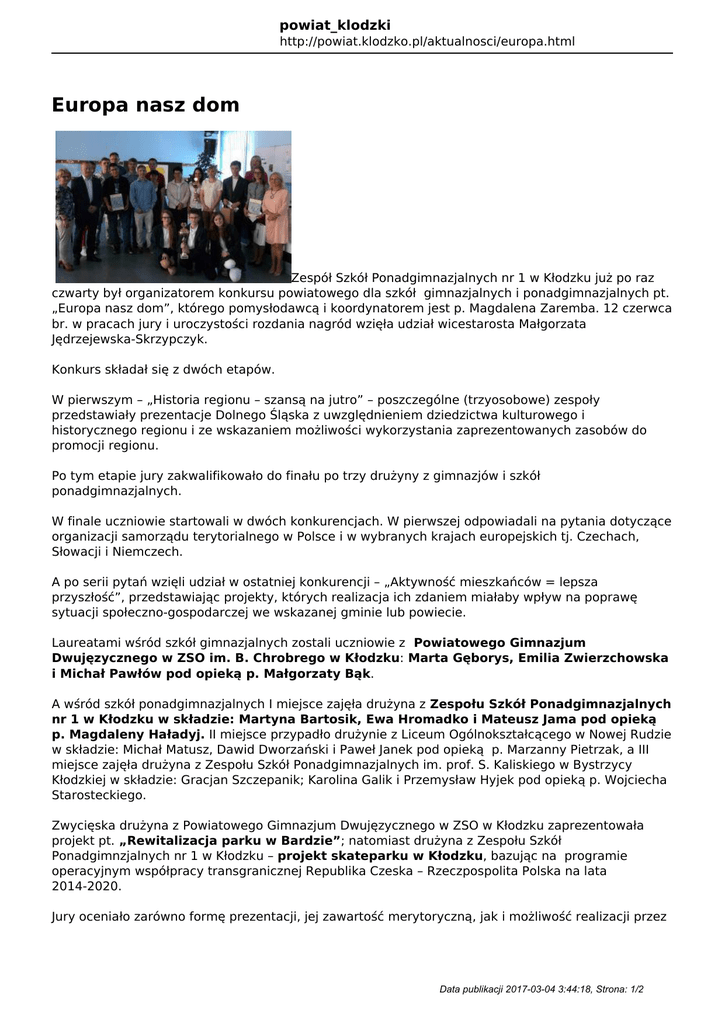 powiat_klodzki http://powiat.klodzko.pl/aktualnosci/europa.html Europa nasz dom Zespół Szkół Ponadgimnazjalnych nr 1 w Kłodzku już po raz czwarty był organizatorem konkursu powiatowego dla szkół gimnazjalnych i ponadgimnazjalnych pt. „Europa nasz dom”, którego pomysłodawcą i koordynatorem jest p. Magdalena Zaremba. 12 czerwca br. w pracach jury i uroczystości rozdania nagród wzięła udział wicestarosta Małgorzata Jędrzejewska-Skrzypczyk. Konkurs składał się z dwóch etapów. W pierwszym – „Historia regionu – szansą na jutro” – poszczególne (trzyosobowe) zespoły przedstawiały prezentacje Dolnego Śląska z uwzględnieniem dziedzictwa kulturowego i historycznego regionu i ze wskazaniem możliwości wykorzystania zaprezentowanych zasobów do promocji regionu. Po tym etapie jury zakwalifikowało do finału po trzy drużyny z gimnazjów i szkół ponadgimnazjalnych. W finale uczniowie startowali w dwóch konkurencjach. W pierwszej odpowiadali na pytania dotyczące organizacji samorządu terytorialnego w Polsce i w wybranych krajach europejskich tj. Czechach, Słowacji i Niemczech. A po serii pytań wzięli udział w ostatniej konkurencji – „Aktywność mieszkańców = lepsza przyszłość”, przedstawiając projekty, których realizacja ich zdaniem miałaby wpływ na poprawę sytuacji społeczno-gospodarczej we wskazanej gminie lub powiecie. Laureatami wśród szkół gimnazjalnych zostali uczniowie z Powiatowego Gimnazjum Dwujęzycznego w ZSO im. B. Chrobrego w Kłodzku: Marta Gęborys, Emilia Zwierzchowska i Michał Pawłów pod opieką p. Małgorzaty Bąk. A wśród szkół ponadgimnazjalnych I miejsce zajęła drużyna z Zespołu Szkół Ponadgimnazjalnych nr 1 w Kłodzku w składzie: Martyna Bartosik, Ewa Hromadko i Mateusz Jama pod opieką p. Magdaleny Haładyj. II miejsce przypadło drużynie z Liceum Ogólnokształcącego w Nowej Rudzie w składzie: Michał Matusz, Dawid Dworzański i Paweł Janek pod opieką p. Marzanny Pietrzak, a III miejsce zajęła drużyna z Zespołu Szkół Ponadgimnazjalnych im. prof. S. Kaliskiego w Bystrzycy Kłodzkiej w składzie: Gracjan Szczepanik; Karolina Galik i Przemysław Hyjek pod opieką p. Wojciecha Starosteckiego. Zwycięska drużyna z Powiatowego Gimnazjum Dwujęzycznego w ZSO w Kłodzku zaprezentowała projekt pt. „Rewitalizacja parku w Bardzie”; natomiast drużyna z Zespołu Szkół Ponadgimnzjalnych nr 1 w Kłodzku – projekt skateparku w Kłodzku, bazując na programie operacyjnym współpracy transgranicznej Republika Czeska – Rzeczpospolita Polska na lata 2014-2020. Jury oceniało zarówno formę prezentacji, jej zawartość merytoryczną, jak i możliwość realizacji przez Data publikacji 2017-03-04 3:44:18, Strona: 1/2 powiat_klodzki http://powiat.klodzko.pl/aktualnosci/europa.html samorząd terytorialny oraz plan finansowy. Na finalistów czekały atrakcyjne nagrody rzeczowe, a laureatom w kategorii szkół ponadgimnazjalnych europoseł Lidia Geringer de Oedenberg ufundowała dodatkowo wyjazd do Parlamentu Europejskiego. Patronat nad konkursem objęli i nagrody ufundowali: senator RP Stanisław Jurcewicz, poseł na Sejm RP Monika Wielichowska, europoseł Lidia Geringer de Oedenbrg, Maciej Awiżeń starosta kłodzki, Bank Zachodni WBK i ZSP nr 1 w Kłodzku. Gratulujemy młodzieży osiągniętych wyników i kreatywności. Data publikacji 2017-03-04 3:44:18, Strona: 2/2