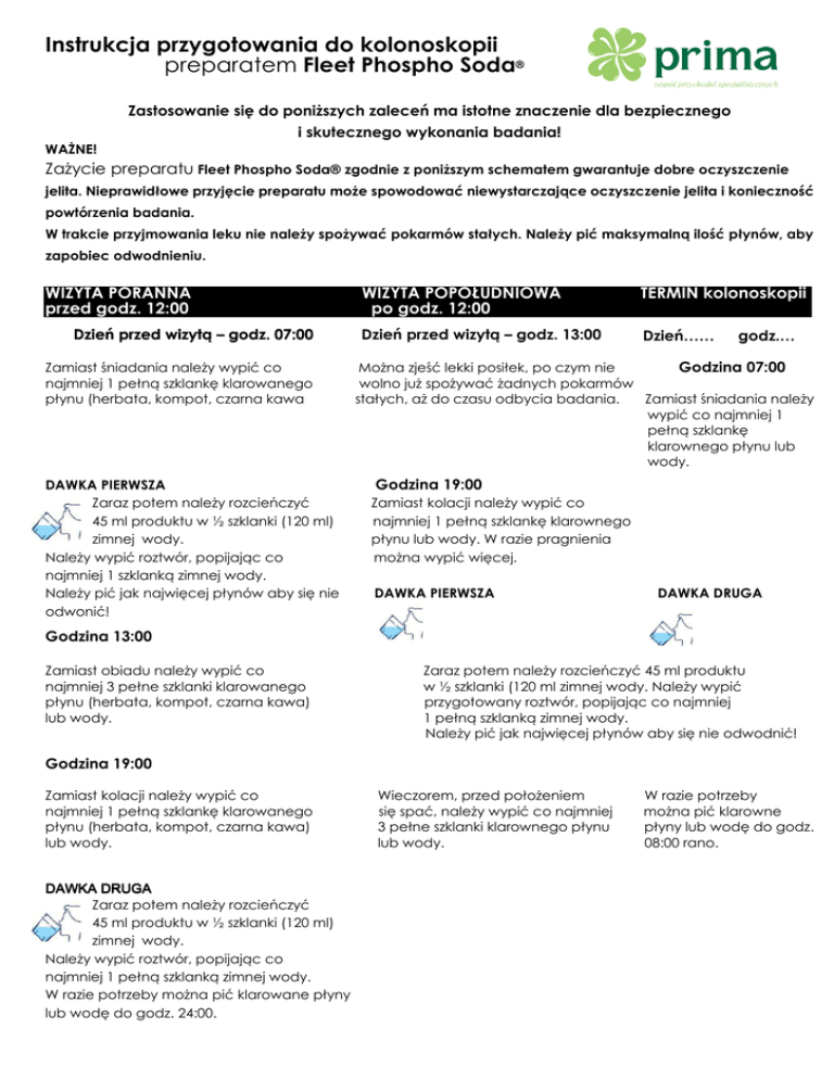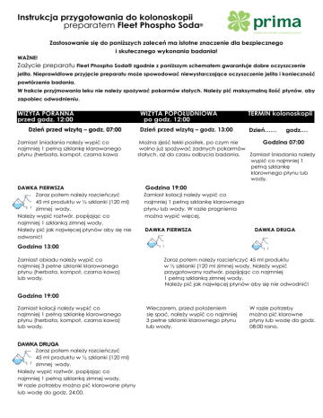 Instrukcja przygotowania do kolonoskopii preparatem Fleet Phospho Soda® Zastosowanie się do poniższych zaleceń ma istotne znaczenie dla bezpiecznego i skutecznego wykonania badania! WAŻNE! Zażycie preparatu Fleet Phospho Soda® zgodnie z poniższym schematem gwarantuje dobre oczyszczenie jelita. Nieprawidłowe przyjęcie preparatu może spowodować niewystarczające oczyszczenie jelita i konieczność powtórzenia badania. W trakcie przyjmowania leku nie należy spożywać pokarmów stałych. Należy pić maksymalną ilość płynów, aby zapobiec odwodnieniu. WIZYTA PORANNA przed godz. 12:00 Dzień przed wizytą – godz. 07:00 Zamiast śniadania należy wypić co najmniej 1 pełną szklankę klarowanego płynu (herbata, kompot, czarna kawa DAWKA PIERWSZA Zaraz potem należy rozcieńczyć 45 ml produktu w ½ szklanki (120 ml) zimnej wody. Należy wypić roztwór, popijając co najmniej 1 szklanką zimnej wody. Należy pić jak najwięcej płynów aby się nie odwonić! WIZYTA POPOŁUDNIOWA po godz. 12:00 TERMIN kolonoskopii Dzień przed wizytą – godz. 13:00 Dzień…… godz.… Można zjeść lekki posiłek, po czym nie Godzina 07:00 wolno już spożywać żadnych pokarmów stałych, aż do czasu odbycia badania. Zamiast śniadania należy wypić co najmniej 1 pełną szklankę klarownego płynu lub wody. Godzina 19:00 Zamiast kolacji należy wypić co najmniej 1 pełną szklankę klarownego płynu lub wody. W razie pragnienia można wypić więcej. DAWKA PIERWSZA DAWKA DRUGA Godzina 13:00 Zamiast obiadu należy wypić co najmniej 3 pełne szklanki klarowanego płynu (herbata, kompot, czarna kawa) lub wody. Zaraz potem należy rozcieńczyć 45 ml produktu w ½ szklanki (120 ml zimnej wody. Należy wypić przygotowany roztwór, popijając co najmniej 1 pełną szklanką zimnej wody. Należy pić jak najwięcej płynów aby się nie odwodnić! Godzina 19:00 Zamiast kolacji należy wypić co najmniej 1 pełną szklankę klarowanego płynu (herbata, kompot, czarna kawa) lub wody. DAWKA DRUGA Zaraz potem należy rozcieńczyć 45 ml produktu w ½ szklanki (120 ml) zimnej wody. Należy wypić roztwór, popijając co najmniej 1 pełną szklanką zimnej wody. W razie potrzeby można pić klarowane płyny lub wodę do godz. 24:00. Wieczorem, przed położeniem się spać, należy wypić co najmniej 3 pełne szklanki klarownego płynu lub wody. W razie potrzeby można pić klarowne płyny lub wodę do godz. 08:00 rano. UWAGA! Osoby regularnie zażywające leki przyjmują je zgodnie z zaleceniem lekarza, najlepiej 2 godziny przed lub po spożyciu preparatu przeczyszczającego. Osoby chorujące na cukrzycę konsultują schemat przygotowania z diabetologiem. Osoby na stałe zażywające leki obniżające krzepliwość należy min. tydzień przed planowanym badaniem skonsultować się ze swoim lekarzem rodzinnym w celu zmiany leków. UWAGA! Na badanie należy zgłosić się z osobą towarzyszącą. Po badaniu Pacjent nie może prowadzić pojazdów mechanicznych przez 12 godz. Jeśli Pacjent był szczepiony należy przynieść dowód szczepień WZW i wynik badania HBs. Wyniki badania kolonoskopii Pacjent otrzymuje po wykonaniu badania. Wynik histopatologiczny można odebrać po ok. 14 dniach roboczych. Dieta przed kolonoskopią: Na 3 dni przed planowaną kolonoskopią: • nie jedz pieczywa z ziarnami, owoców pestkowych (np. winogron, pomidorów, kiwi, truskawek) oraz nasion siemienia lnianego, maku i sezamu (pestki i nasiona zalegające w jelicie utrudniają badanie) • poza tym zwykła dieta W przeddzień badania: • lekkostrawne ubogoresztkowe śniadanie: ■ możesz pić w dowolnej ilości: herbatę, kawę bez fusów - czarną lub z mlekiem, klarowny sok, kompot, wodę ■ możesz zjeść: bułeczkę lub kromkę chleba z masłem, z serem, jajkiem na twardo, plastrem wędliny • około godz. 13:00-15:00 możesz zjeść zupę typu krem albo przecedzony bulion • od godziny 15:00 nie możesz jeść żadnych posiłków • możesz ssać landrynki • możesz dodatkowo pić klarowne płyny (wodę, herbatę, sok, kompot) W dniu planowanej kolonoskopii: • na śniadanie: herbata, kawa bez fusów, kompot, woda (do 2 godz. przed badaniem, jeżeli kolonoskopia jest planowana przed południem) • nie możesz jeść żadnych posiłków • możesz ssać landrynki • możesz dodatkowo pić klarowne płyny (wodę, herbatę, kompot) do 2 godz. przed badaniem UWAGA! Po kolonoskopii wracasz do codziennej diety UWAGA!!! Powyższe zalecenia mają charakter ramowy i ogólny. Należy w każdym przypadku kierować się zaleceniami producenta leku umieszczonymi na ulotce dołączonej do opakowania leku.