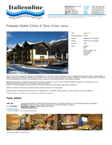 Italieonline Sp. z o.o. Bryksova 757 198 00 Praga 9 Republika Czeska REGON: 27614140 NIP: CZ 27614140 Tel CZ: Tel SK: Tel PL: Fax: Email: Web: +420 284 811 218 +421 233 006 523 +48 223 987 493 +420 284 811 210 [email protected] www.italieonline.eu Biuro podróży Italieonline sp. z o.o. jest zapisane w Miejskim Sądzie w Pradze oddział C, wkład 118991 i ubezpieczone na wypadek upadku w ČPP a.s. Freeski Hotel Cime d´Oro (IT302-1841) Typ: Hotel Trasa zjazdowa: 700 m Region: Madonna di Campiglio Miasto: Madonna di Campiglio Pokoje: 2 Opis*: parking Wi-Fi TV przechowalnia nart ogrzewanie śniadanie sauna Hotel Cima d´Oro znajduje się w Madonna di Campiglio, ok. 700 m od centrum i wyciągów. Goście mają do dyspozycji recepcję, windę, jadalnię, w której są podawane śniadania, świetlicę z kominkiem, salę z TV, kącik zabaw dla dzieci, werandę z widokiem na okolicę, darmowe Wi-Fi, hotelowy minibus dowożący do centrum i do wyciągów, jacuzzi, saunę, przechowalnię sprzętu narciarskiego i parking. Wyżywienie niepełne: śniadania w formie bufetu i kolacje z wyborem z menu. Można dokupić niepełne wyżywienie w restauracji (ok. 20 EUR/os./dzień, dzieci do 12 lat 15 EUR/dzień, płatne na miejscu) Zniżki na 3. łóżko dostępne na życzenie przy rezerwacji (konieczne jest podanie daty urodzin dziecka) Oferta z 6-dniowym karnetem narciarskim Superskirama wliczonym w cenę pobytu. W miejscowości obowiązuje opłata miejscowa w wysokości ok. 1,3 EUR/os./dzień, płatne na miejscu (dzieci do 13 lat za darmo). * Niektóre usługi nie są wliczone w cenę i mogą być świadczone za dopłatą. Typy pokoi DBL+BB 2 (double) Zarezerwować dwuosobowy pokój z możliwością dostawki, łazienka, suszarka do włosów, TV, sejf, niektóre pokoje mają balkon W cenie: karnet narciarski, parking, poszewki, ręczniki (za tydzień), śniadanie Wymagane opłaty: opłata miejscowa 9.10€/P Opłaty fakultatywne: P - cena na osobę, A - cena za apartament/pokój Prezentowane zdjęcia są przykładowe. DBL+BB 2 Sezon (double) Terminy Cena za noc / P Początek pobytu Koniec pobytu Min. ilość nocy A 10.12. - 16.12.2016 262 zł Sob Sob 7 B 17.12. - 06.01.2017 297 zł Sob Sob 7 C 07.01. - 13.01.2017 337 zł Sob Sob 7 D 14.01. - 17.03.2017 347 zł Sob Sob 7 E 18.03. - 24.03.2017 307 zł Sob Sob 7 F 25.03. - 09.04.2017 272 zł Sob Sob 7 https://www.italieonline.eu/pl/madonna-di-campiglio-121/freeski-hotel-cime-d-oro-1841.html www.ITALIEONLINE.eu TOUR OPERATOR FOR ITALY