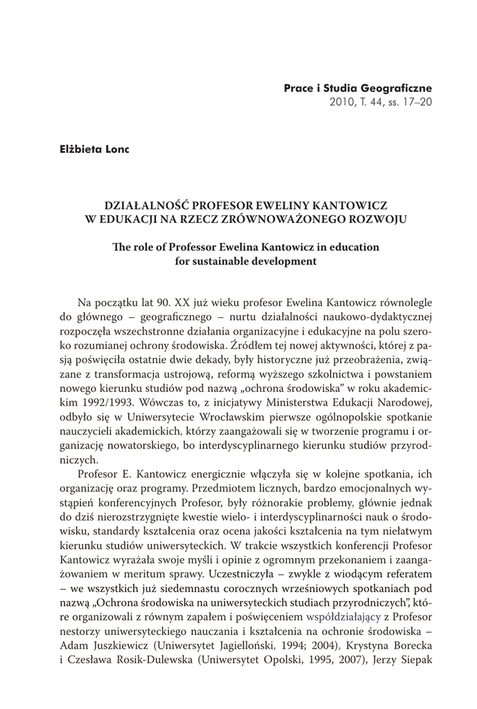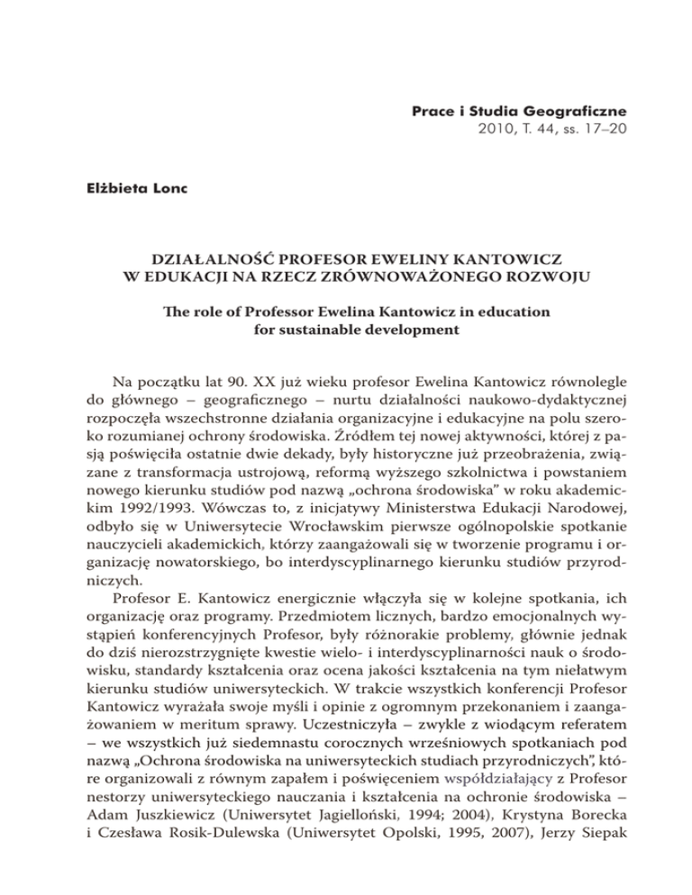 Prace i Studia Geograficzne 2010, T. 44, ss. 17–20 Elżbieta Lonc Działalność Profesor Eweliny Kantowicz w edukacji na rzecz zrównoważonego rozwoju The role of Professor Ewelina Kantowicz in education for sustainable development Na początku lat 90. XX już wieku profesor Ewelina Kantowicz równolegle do głównego – geograficznego – nurtu działalności naukowo-dydaktycznej rozpoczęła wszechstronne działania organizacyjne i edukacyjne na polu szeroko rozumianej ochrony środowiska. Źródłem tej nowej aktywności, której z pasją poświęciła ostatnie dwie dekady, były historyczne już przeobrażenia, związane z transformacja ustrojową, reformą wyższego szkolnictwa i powstaniem nowego kierunku studiów pod nazwą „ochrona środowiska” w roku akademickim 1992/1993. Wówczas to, z inicjatywy Ministerstwa Edukacji Narodowej, odbyło się w Uniwersytecie Wrocławskim pierwsze ogólnopolskie spotkanie nauczycieli akademickich, którzy zaangażowali się w tworzenie programu i organizację nowatorskiego, bo interdyscyplinarnego kierunku studiów przyrodniczych. Profesor E. Kantowicz energicznie włączyła się w kolejne spotkania, ich organizację oraz programy. Przedmiotem licznych, bardzo emocjonalnych wystąpień konferencyjnych Profesor, były różnorakie problemy, głównie jednak do dziś nierozstrzygnięte kwestie wielo- i interdyscyplinarności nauk o środowisku, standardy kształcenia oraz ocena jakości kształcenia na tym niełatwym kierunku studiów uniwersyteckich. W trakcie wszystkich konferencji Profesor Kantowicz wyrażała swoje myśli i opinie z ogromnym przekonaniem i zaangażowaniem w meritum sprawy. Uczestniczyła – zwykle z wiodącym referatem – we wszystkich już siedemnastu corocznych wrześniowych spotkaniach pod nazwą „Ochrona środowiska na uniwersyteckich studiach przyrodniczych”, które organizowali z równym zapałem i poświęceniem współdziałający z Profesor nestorzy uniwersyteckiego nauczania i kształcenia na ochronie środowiska – Adam Juszkiewicz (Uniwersytet Jagielloński, 1994; 2004), Krystyna Borecka i Czesława Rosik-Dulewska (Uniwersytet Opolski, 1995, 2007), Jerzy Siepak 18 Elżbieta Lonc (Uniwersytet Adama Mickiewicza w Poznaniu, 1997 i Słubice 2004), Jerzy Bola łek i Irena Bojanowska (Uniwersytet Gdański, 1998), Adam Rayss, doktorzy Jerzy Niećko oraz Bogusław i Maria Chmielowie (Uniwersytet Marii CurieSkłodowskiej w Lublinie, 1999), Bogusław Buszewski i Adam Czarnecki (Uniwersytet M. Kopernika w Toruniu, 2000), Romuald Olaczek (Uniwersytet Łódzki, 2001), Wojciech Budzyński (Uniwersytet Warmińsko-Mazurski w Olsztynie, 2002), Elżbieta Lonc (Uniwersytet Wrocławski; 1993, 2003), Andrzej Górniak (Uniwersytet Białostocki, 2008), Grzegorz Gabryś (Uniwersytet Zielonogórski, 2009). Wymienieni organizatorzy to już krajowe stabilne gremium. Dzięki integracyjnej roli prof. Kantowicz zgodne w działaniach na rzecz efektywnego interdyscyplinarnego kształcenia kadry ochrony środowiska na poziomie studiów wyższych – I i II stopnia. Są to przedstawiciele różnych dziedzin nauki, jak biologia, chemia, geologia, geografia, hydrologia, oceanografia, inżynieria. Profesor E. Kantowicz jest nie tylko autorką, współautorką, ale także recenzentem wielu dokumentów naszych corocznych integracyjnych spotkań. Pełniła funkcję redaktora dwóch obszernych tomów Materiałów Konferencyjnych zawierających doniesienia z niezapomnianych środowiskowych spotkań, które organizowała w Uniwersyteckie Warszawskim z wyjazdowymi sesjami w Jachrance (1996) oraz w Mądralinie (2006). Publikacje te stanowią wartościowy wzorzec ciekawych rozwiązań i propozycji dydaktycznych, są zatem niezwykle cennym źródłem dla wszystkich wykładowców i kadry zarządzającej kierunkiem studiów i studentami. Treści licznych prac i cenne uwagi wykorzystywano na bieżąco w żmudnym procesie ustalania tzw. minimów programowych, a następnie w tworzeniu standardów kształcenia, na których opiera się obecna procedura akredytacyjna Uczelnianej Komisji Akredytacyjnej (UKA) oraz Państwowej Komisji Akredytacyjnej (PKA). W tym momencie nie sposób nie wspomnieć o mediacyjnej roli Profesor Kartowicz w interdyscyplinarnych zespołach, które w trakcie wieloetapowych i zwykle wielogodzinnych narad w Poznaniu (UKA), Warszawie (PKA) oraz niełatwych środowiskowych dyskusjach odpowiadały za opracowanie wymienionych już standardów kształcenia, określenia sposobów organizacji, budowy infrastruktury dla ochrony środowiska. Zarządzane przez prof. Kantowicz od samego początku (1994) Międzywydziałowe Studia Ochrony Środowiska w UW są wciąż niedoścignionym wzorem organizacyjnym dla tego interdyscyplinarnego kierunku przyrodniczego. Efektem Jej żmudnej i trudnej na co dzień koordynacyjnej pracy Kierownika MSOŚ-iu jest sprawna dydaktyka na wielu wydziałach i tysiące uniwersyteckich absolwentów ochrony środowiska. Wielu z nich dzięki promocyjnej działalności to laureaci znakomitych nagród krajowych oraz międzynarodowych wyróżnień i konkursów. Swoje wszechstronne doświadczenia zawodowe Profesor Kartowicz starała się przekazać innym ośrodkom pełniąc funkcję eksperta w licznych akredyta- Działalność Profesor Eweliny Kantowicz w edukacji na rzecz... 19 cjach kierunku „ochrona środowiska”, w których uczestniczyła i uczestniczy z ramienia zarówno UKA jak i PKA. Tę trudną kontrolną rolę pełniła w sposób ujmujący, niezwykle taktowny, ale zarazem konsekwentny. Zawsze zdecydowanie broni swoich poglądów, a w sprawach ekologicznej edukacji na rzecz zrównoważonego rozwoju jest bezkompromisowa. Wyrazem głębokiego przekonania o mocy słowa pisanego jest nasz wspólny podręcznik Ekologia i ochrona środowiska. Wydana – przez Państwową Wyższą Szkołę Zawodową w Wałbrzychu w 2001 r. – książka przygotowuje studentów do realizacji przyszłych obowiązków i zadań zawodowych