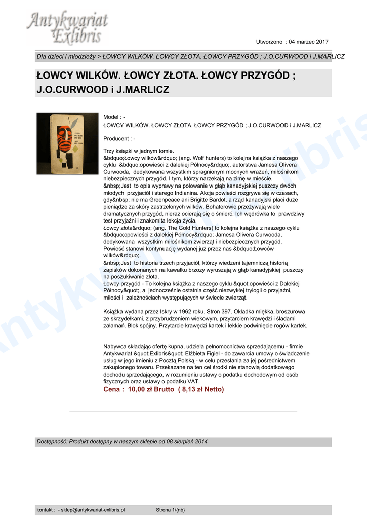 Utworzono : 04 marzec 2017 Dla dzieci i młodzieży > ŁOWCY WILKÓW. ŁOWCY ZŁOTA. ŁOWCY PRZYGÓD ; J.O.CURWOOD i J.MARLICZ ŁOWCY WILKÓW. ŁOWCY ZŁOTA. ŁOWCY PRZYGÓD ; J.O.CURWOOD i J.MARLICZ s i r b Model : - ŁOWCY WILKÓW. ŁOWCY ZŁOTA. ŁOWCY PRZYGÓD ; J.O.CURWOOD i J.MARLICZ Producent : - i l x Trzy ksiązki w jednym tomie. „Łowcy wilków” (ang. Wolf hunters) to kolejna książka z naszego cyklu „opowieści z dalekiej Północy”, autorstwa Jamesa Olivera Curwooda, dedykowana wszystkim spragnionym mocnych wrażeń, miłośnikom niebezpiecznych przygód. I tym, którzy narzekają na zimę w mieście. Jest to opis wyprawy na polowanie w głąb kanadyjskiej puszczy dwóch młodych przyjaciół i starego Indianina. Akcja powieści rozgrywa się w czasach, gdy nie ma Greenpeace ani Brigitte Bardot, a rząd kanadyjski płaci duże pieniądze za skóry zastrzelonych wilków. Bohaterowie przeżywają wiele dramatycznych przygód, nieraz ocierają się o śmierć. Ich wędrówka to prawdziwy test przyjaźni i znakomita lekcja życia. Łowcy złota” (ang. The Gold Hunters) to kolejna książka z naszego cyklu „opowieści z dalekiej Północy” Jamesa Olivera Curwooda, dedykowana wszystkim miłośnikom zwierząt i niebezpiecznych przygód. Powieść stanowi kontynuację wydanej już przez nas „Łowców wilków”. Jest to historia trzech przyjaciół, którzy wiedzeni tajemniczą historią zapisków dokonanych na kawałku brzozy wyruszają w głąb kanadyjskiej puszczy na poszukiwanie złota. Łowcy przygód - To kolejna książka z naszego cyklu "opowieści z Dalekiej Północy", a jednocześnie ostatnia część niezwykłej trylogii o przyjaźni, miłości i zależnościach występujących w świecie zwierząt. E t a i r a w k y t n A Książka wydana przez Iskry w 1962 roku. Stron 397. Okładka miękka, broszurowa ze skrzydełkami, z przybrudzeniem wiekowym, przytarciem krawędzi i śladami załamań. Blok spójny. Przytarcie krawędzi kartek i lekkie podwinięcie rogów kartek. Nabywca składając ofertę kupna, udziela pełnomocnictwa sprzedającemu - firmie Antykwariat "Exlibris" Elżbieta Figiel - do zawarcia umowy o świadczenie usług w jego imieniu z Pocztą Polską - w celu przesłania za jej pośrednictwem zakupionego towaru. Przekazane na ten cel środki nie stanowią dodatkowego dochodu sprzedającego, w rozumieniu ustawy o podatku dochodowym od osób fizycznych oraz ustawy o podatku VAT. Cena : 10,00 zł Brutto ( 8,13 zł Netto) Dostępność: Produkt dostępny w naszym sklepie od 08 sierpień 2014 kontakt : - [email protected] Strona 1/{nb}