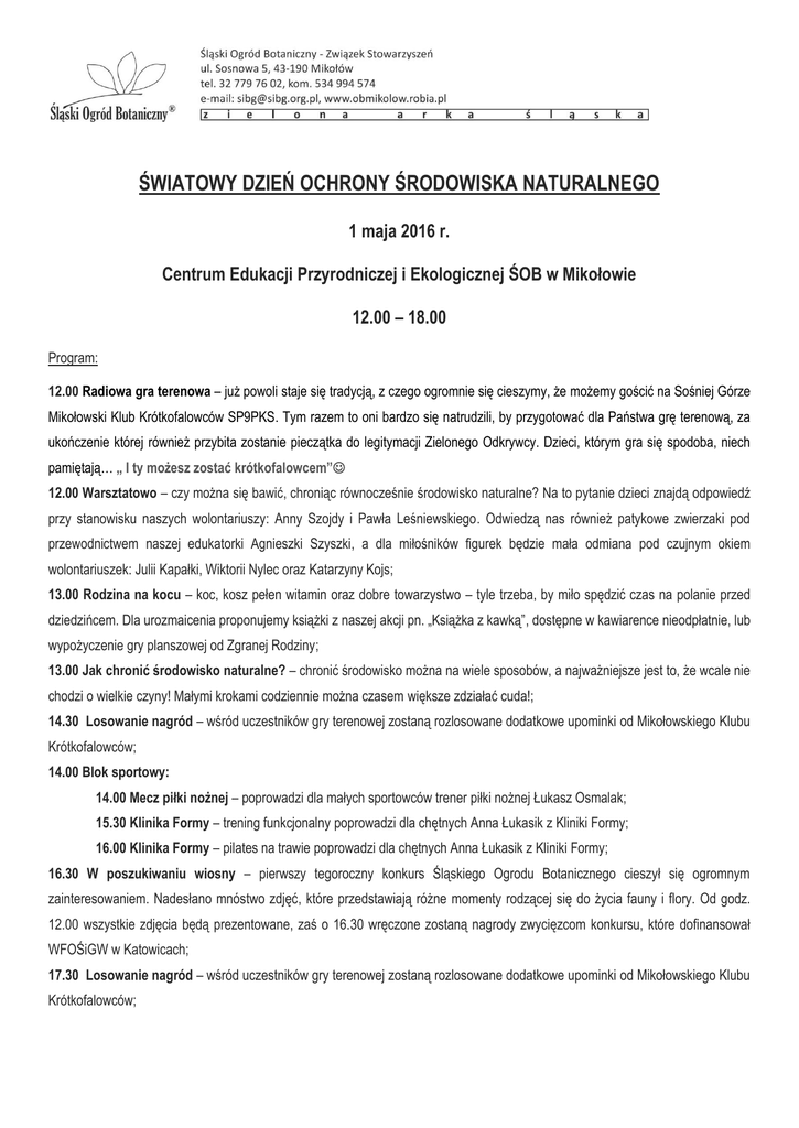 ŚWIATOWY DZIEŃ OCHRONY ŚRODOWISKA NATURALNEGO 1 maja 2016 r. Centrum Edukacji Przyrodniczej i Ekologicznej ŚOB w Mikołowie 12.00 – 18.00 Program: 12.00 Radiowa gra terenowa – już powoli staje się tradycją, z czego ogromnie się cieszymy, że możemy gościć na Sośniej Górze Mikołowski Klub Krótkofalowców SP9PKS. Tym razem to oni bardzo się natrudzili, by przygotować dla Państwa grę terenową, za ukończenie której również przybita zostanie pieczątka do legitymacji Zielonego Odkrywcy. Dzieci, którym gra się spodoba, niech pamiętają… „ I ty możesz zostać krótkofalowcem” 12.00 Warsztatowo – czy można się bawić, chroniąc równocześnie środowisko naturalne? Na to pytanie dzieci znajdą odpowiedź przy stanowisku naszych wolontariuszy: Anny Szojdy i Pawła Leśniewskiego. Odwiedzą nas również patykowe zwierzaki pod przewodnictwem naszej edukatorki Agnieszki Szyszki, a dla miłośników figurek będzie mała odmiana pod czujnym okiem wolontariuszek: Julii Kapałki, Wiktorii Nylec oraz Katarzyny Kojs; 13.00 Rodzina na kocu – koc, kosz pełen witamin oraz dobre towarzystwo – tyle trzeba, by miło spędzić czas na polanie przed dziedzińcem. Dla urozmaicenia proponujemy książki z naszej akcji pn. „Książka z kawką”, dostępne w kawiarence nieodpłatnie, lub wypożyczenie gry planszowej od Zgranej Rodziny; 13.00 Jak chronić środowisko naturalne? – chronić środowisko można na wiele sposobów, a najważniejsze jest to, że wcale nie chodzi o wielkie czyny! Małymi krokami codziennie można czasem większe zdziałać cuda!; 14.30 Losowanie nagród – wśród uczestników gry terenowej zostaną rozlosowane dodatkowe upominki od Mikołowskiego Klubu Krótkofalowców; 14.00 Blok sportowy: 14.00 Mecz piłki nożnej – poprowadzi dla małych sportowców trener piłki nożnej Łukasz Osmalak; 15.30 Klinika Formy – trening funkcjonalny poprowadzi dla chętnych Anna Łukasik z Kliniki Formy; 16.00 Klinika Formy – pilates na trawie poprowadzi dla chętnych Anna Łukasik z Kliniki Formy; 16.30 W poszukiwaniu wiosny – pierwszy tegoroczny konkurs Śląskiego Ogrodu Botanicznego cieszył się ogromnym zainteresowaniem. Nadesłano mnóstwo zdjęć, które przedstawiają różne momenty rodzącej się do życia fauny i flory. Od godz. 12.00 wszystkie zdjęcia będą prezentowane, zaś o 16.30 wręczone zostaną nagrody zwycięzcom konkursu, które dofinansował WFOŚiGW w Katowicach; 17.30 Losowanie nagród – wśród uczestników gry terenowej zostaną rozlosowane dodatkowe upominki od Mikołowskiego Klubu Krótkofalowców; Ponadto: Pszczelarium – od dwóch tygodni gościmy w Ogrodzie niezwykłych gości – pszczoły. Na razie stanęły dwa ule, ale być może ich liczba zwiększy się. Pszczółki pojawiły się u nas nie tylko ze względu na kwitnący rzepak, ale również po to, byście mogli Państwo choć trochę uczestniczyć w tym niezwykłym procesie tworzenia miodu; Rodzinna Strefa Ekologicznych Zabaw – w zdrowym ciele zdrowy duch, czyli rodzinny bieg przez płotki, przeciąganie liny i inne rodzinne atrakcje. Będzie również głośno i kolorowo z chustą Klanza; Kącik Zabaw – z myślą o najmłodszych uczestnikach świąt ekologicznych; Zgrana Rodzina – dobrze większości znana Rodzina zaoferuje nam jak zwykle wiele plansz do wyboru i koloru; Program SOTA – jedna z aktywności krótkofalarskich polegająca na połączeniu radia z turystyką górską. SOTA – Summit on the Air – czyli szczyty w eterze. Krótkofalowcy, odwiedzając szczyty górskie, aktywują je, przeprowadzając z nich łączności. Prowadzona jest rywalizacja i statystyka tzw. aktywatorów i łowców szczytów. Więcej informacji na www.sota-sp.iq24.pl Lego Mindstorms EV3 – pokazowe roboty i ich programowanie, czyli moc wrażeń i nowych umiejętności; Kawiarenka przy placu zabaw – zaoferuje świeżą i aromatyczną kawę, herbatę oraz inne kawiarniane przysmaki. Będzie również małe co nieco dla większych łasuchów; Kiermasz – na głównym dziedzińcu odbywał się będzie kiermasz ekologicznych produktów spożywczych oraz rękodzieła, będzie również możliwość zakupienia różnych „cudeniek”; EkoBazar – cotygodniowy targ z ekologiczną i certyfikowaną żywnością oraz otwarci, chętni do rozmów i wymiany kulinarnych doświadczeń sprzedawcy zaoferują nabiał, pieczywo, wędliny, przyprawy, oleje, miody i in.; Wystawa plenerowa – zachwycająca wystawa mikołowskich fotografów i poetów „Barwy mikołowskie i… rytmy” już tylko do czerwca, kiedy to nastąpi otwarcie kolejnej, równie pięknej. A każdego, kto nie będzie mógł pojawić się u nas 1 maja, zapraszamy w kolejnych dniach, tj. 2 i 3 maja. Będą gry, zabawy i warsztaty. Zachęcamy do zabrania ze sobą kocy i koszyków piknikowych i spędzenia majówki na trawie w Śląskim Ogrodzie Botanicznym. CZEKAMY NA GOŚCI RÓWNIEŻ W RAZIE NIEPOGODY! Zapraszam, Marzena Osmalak Kierownik Pracowni Śląskiego Kalendarza Ekologicznego e-mail: [email protected], tel. 534 994 578