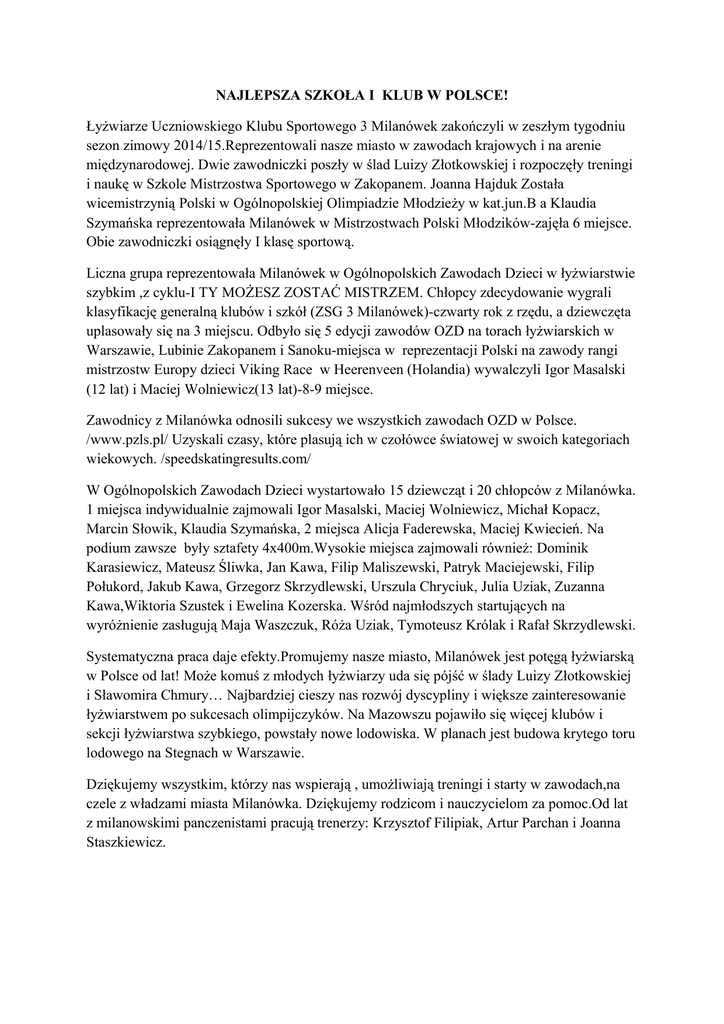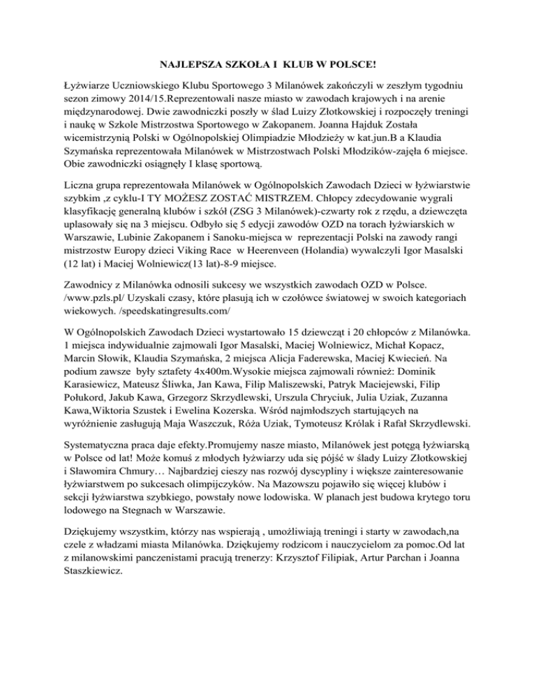 NAJLEPSZA SZKOŁA I KLUB W POLSCE! Łyżwiarze Uczniowskiego Klubu Sportowego 3 Milanówek zakończyli w zeszłym tygodniu sezon zimowy 2014/15.Reprezentowali nasze miasto w zawodach krajowych i na arenie międzynarodowej. Dwie zawodniczki poszły w ślad Luizy Złotkowskiej i rozpoczęły treningi i naukę w Szkole Mistrzostwa Sportowego w Zakopanem. Joanna Hajduk Została wicemistrzynią Polski w Ogólnopolskiej Olimpiadzie Młodzieży w kat.jun.B a Klaudia Szymańska reprezentowała Milanówek w Mistrzostwach Polski Młodzików-zajęła 6 miejsce. Obie zawodniczki osiągnęły I klasę sportową. Liczna grupa reprezentowała Milanówek w Ogólnopolskich Zawodach Dzieci w łyżwiarstwie szybkim ,z cyklu-I TY MOŻESZ ZOSTAĆ MISTRZEM. Chłopcy zdecydowanie wygrali klasyfikację generalną klubów i szkół (ZSG 3 Milanówek)-czwarty rok z rzędu, a dziewczęta uplasowały się na 3 miejscu. Odbyło się 5 edycji zawodów OZD na torach łyżwiarskich w Warszawie, Lubinie Zakopanem i Sanoku-miejsca w reprezentacji Polski na zawody rangi mistrzostw Europy dzieci Viking Race w Heerenveen (Holandia) wywalczyli Igor Masalski (12 lat) i Maciej Wolniewicz(13 lat)-8-9 miejsce. Zawodnicy z Milanówka odnosili sukcesy we wszystkich zawodach OZD w Polsce. /www.pzls.pl/ Uzyskali czasy, które plasują ich w czołówce światowej w swoich kategoriach wiekowych. /speedskatingresults.com/ W Ogólnopolskich Zawodach Dzieci wystartowało 15 dziewcząt i 20 chłopców z Milanówka. 1 miejsca indywidualnie zajmowali Igor Masalski, Maciej Wolniewicz, Michał Kopacz, Marcin Słowik, Klaudia Szymańska, 2 miejsca Alicja Faderewska, Maciej Kwiecień. Na podium zawsze były sztafety 4x400m.Wysokie miejsca zajmowali również: Dominik Karasiewicz, Mateusz Śliwka, Jan Kawa, Filip Maliszewski, Patryk Maciejewski, Filip Połukord, Jakub Kawa, Grzegorz Skrzydlewski, Urszula Chryciuk, Julia Uziak, Zuzanna Kawa,Wiktoria Szustek i Ewelina Kozerska. Wśród najmłodszych startujących na wyróżnienie zasługują Maja Waszczuk, Róża Uziak, Tymoteusz Królak i Rafał Skrzydlewski. Systematyczna praca daje efekty.Promujemy nasze miasto, Milanówek jest potęgą łyżwiarską w Polsce od lat! Może komuś z młodych łyżwiarzy uda się pójść w ślady Luizy Złotkowskiej i Sławomira Chmury… Najbardziej cieszy nas rozwój dyscypliny i większe zainteresowanie łyżwiarstwem po sukcesach olimpijczyków. Na Mazowszu pojawiło się więcej klubów i sekcji łyżwiarstwa szybkiego, powstały nowe lodowiska. W planach jest budowa krytego toru lodowego na Stegnach w Warszawie. Dziękujemy wszystkim, którzy nas wspierają , umożliwiają treningi i starty w zawodach,na czele z władzami miasta Milanówka. Dziękujemy rodzicom i nauczycielom za pomoc.Od lat z milanowskimi panczenistami pracują trenerzy: Krzysztof Filipiak, Artur Parchan i Joanna Staszkiewicz.