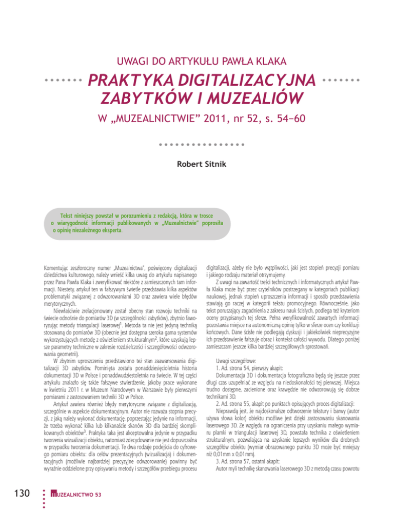 UWAGI DO ARTYKUŁU PAWŁA KLAKA PRAKTYKA DIGITALIZACYJNA ZABYTKÓW I MUZEALIÓW W „MUZEALNICTWIE” 2011, nr 52, s. 54−60 Robert Sitnik Tekst niniejszy powstał w porozumieniu z redakcją, która w trosce o wiarygodność informacji publikowanych w „Muzealnictwie” poprosiła o opinię niezależnego eksperta. Komentując zeszłoroczny numer „Muzealnictwa”, poświęcony digitalizacji dziedzictwa kulturowego, należy wnieść kilka uwag do artykułu napisanego przez Pana Pawła Klaka i zweryfikować niektóre z zamieszczonych tam informacji. Niestety, artykuł ten w fałszywym świetle przedstawia kilka aspektów problematyki związanej z odwzorowaniami 3D oraz zawiera wiele błędów merytorycznych. Niewłaściwie zrelacjonowany został obecny stan rozwoju techniki na świecie odnośnie do pomiarów 3D (w szczególności zabytków), zbytnio faworyzując metody triangulacji laserowej1. Metoda ta nie jest jedyną techniką stosowaną do pomiarów 3D (obecnie jest dostępna szeroka gama systemów wykorzystujących metodę z oświetleniem strukturalnym2, które uzyskują lepsze parametry techniczne w zakresie rozdzielczości i szczegółowości odwzorowania geometrii). W zbytnim uproszczeniu przedstawiono też stan zaawansowania digitalizacji 3D zabytków. Pominięta została ponaddziesięcioletnia historia dokumentacji 3D w Polsce i ponaddwudziestoletnia na świecie. W tej części artykułu znalazło się także fałszywe stwierdzenie, jakoby prace wykonane w kwietniu 2011 r. w Muzeum Narodowym w Warszawie były pierwszymi pomiarami z zastosowaniem techniki 3D w Polsce. Artykuł zawiera również błędy merytoryczne związane z digitalizacją, szczególnie w aspekcie dokumentacyjnym. Autor nie rozważa stopnia precyzji, z jaką należy wykonać dokumentację, poprzestając jedynie na informacji, że trzeba wykonać kilka lub kilkanaście skanów 3D dla bardziej skomplikowanych obiektów3. Praktyka taka jest akceptowalna jedynie w przypadku tworzenia wizualizacji obiektu, natomiast zdecydowanie nie jest dopuszczalna w przypadku tworzenia dokumentacji. Te dwa rodzaje podejścia do cyfrowego pomiaru obiektu: dla celów prezentacyjnych (wizualizacja) i dokumentacyjnych (możliwie najbardziej precyzyjne odwzorowanie) powinny być wyraźnie oddzielone przy opisywaniu metody i szczegółów przebiegu procesu 130 UZEALNICTWO 53 digitalizacji, ażeby nie było wątpliwości, jaki jest stopień precyzji pomiaru i jakiego rodzaju materiał otrzymujemy. Z uwagi na zawartość treści technicznych i informatycznych artykuł Pawła Klaka może być przez czytelników postrzegany w kategoriach publikacji naukowej, jednak stopień uproszczenia informacji i sposób przedstawienia stawiają go raczej w kategorii tekstu promocyjnego. Równocześnie, jako tekst poruszający zagadnienia z zakresu nauk ścisłych, podlega też kryteriom oceny przypisanych tej sferze. Pełna weryfikowalność zawartych informacji pozostawia miejsce na autonomiczną opinię tylko w sferze ocen czy konkluzji końcowych. Dane ścisłe nie podlegają dyskusji i jakiekolwiek nieprecyzyjne ich przedstawienie fałszuje obraz i kontekst całości wywodu. Dlatego poniżej zamieszczam jeszcze kilka bardziej szczegółowych sprostowań. Uwagi szczegółowe: 1. Ad. strona 54, pierwszy akapit: Dokumentacja 3D i dokumentacja fotograficzna będą się jeszcze przez długi czas uzupełniać ze względu na niedoskonałości tej pierwszej. Miejsca trudno dostępne, zacienione oraz krawędzie nie odwzorowują się dobrze technikami 3D. 2. Ad. strona 55, akapit po punktach opisujących proces digitalizacji: Nieprawdą jest, że najdoskonalsze odtworzenie tekstury i barwy (autor używa słowa kolor) obiektu możliwe jest dzięki zastosowaniu skanowania laserowego 3D. Ze względu na ograniczenia przy uzyskaniu małego wymiaru plamki w triangulacji laserowej 3D, powstała technika z oświetleniem strukturalnym, pozwalająca na uzyskanie lepszych wyników dla drobnych szczegółów obiektu (wymiar obrazowanego punktu 3D może być mniejszy niż 0,01mm x 0,01mm). 3. Ad. strona 57, ostatni akapit: Autor myli technikę skanowania laserowego 3D z metodą czasu powrotu digitalizacja w muzeach wiązki (ang. Time of Flight – ToF). Do obu tych technik używane jest źródło promieniowania laserowego. Metody te działają na innej zasadzie fizycznej. Skanowanie laserowe 3D wykorzystuje mechanizm triangulacji, a metoda ToF pomiar czasu powrotu impulsu świetlnego rozproszonego na powierzchni obiektu. 4. Ad. strona 58, piąty akapit: Autor twierdzi, że w kwietniu 2011 r. odbyła się pierwsza próba (realizowana przez niego) digitalizacji zabytków 3D. Osobiście nie wiem, kiedy była pierwsza próba, ale mój zespół (http://ogx.mchtr.pw.edu.pl) w latach 2001–2012 zeskanował ponad 500 obiektów muzealnych w 3D. Przykładowo, w 2003 r. w Muzeum Zamku w Kórniku w ramach dwutygodniowego wyjazdu zostało zeskanowanych ponad 60 obiektów, w tym kompletna zbro- ja huzarska, składająca się z ponad 16 elementów. Jest ona prezentowana w internecie do dziś. Dodatkowo jest mi znana grupa (http://labscan3d.pwr. wroc.pl/) pana dr. inż. arch. Jacka Kościuka, który w obszarze technik ToF jest autorytetem w Polsce oraz realizuje dużo projektów dokumentacyjnych. Na tym polu działa też wiele zespołów w muzeach, na uczelniach wyższych oraz firm komercyjnych. 5. Ad. strona 59, przedostatni akapit: Autor stwierdza, że błąd rejestracji wspólnego układu współrzędnych dla całego obiektu nie przekroczył 2 mm. Ta wartość może wprowadzać w błąd ze względu na luźny związek z dokładnością pomiaru całego obiektu. Wynik pomiaru metodami optycznymi znacząco zależy od parametrów obiektu mierzonego i końcowy błąd pomiaru jest składową wielu parametrów. Przypisy 1 G. Sansoni, M. Trebeschi, F. Docchio, State-of-The-Art and Applications of 3D Imaging Sensors in Industry, Cultural Heritage, Medicine, and Criminal Investigation, „Se