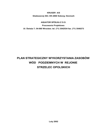 KRUGER A/S Gladsaxevej 363; DK-2860 Soborg; Denmark AQUATOR SPÓŁKA Z O.O. Pracowania Projektowa Ul. Świeża 7; 54-060 Wrocław; tel. (71) 3542534 fax. (71) 3540273 PLAN STRATEGICZNY WYKORZYSTANIA ZASOBÓW WÓD PODZIEMNYCH W REJONIE STRZELEC OPOLSKICH Luty 2002 Wrzesień 2001 Plan strategiczny wykorzystania zasobów wód podziemnych strona: 2/40 w rejonie Strzelec Opolskich _________________________________________________________________________________________ SPIS TREŚCI 1. ZAKRES PLANU STRATEGICZNEGO ....................................................................4 2. STATUS ZASOBÓW WODNYCH REJONU STRZELEC OPOLSKICH 2.1. Jakość wód podziemnych ........... 6 ................................................................................. 6 2.2. Wodociągi i ujęcia wody ................................................................................. 8 3. ZAPOTRZEBOWANIE NA WODĘ W GMINIE STRZELCE OPOLSKIE ..................... 11 3.1. Zapotrzebowanie perspektywiczne ..................................................................... 12 4. OPCJE ZARZĄDZANIA ZASOBAMI WODNYMI ............................................. 13 4.1. Alternatywne obszary dla budowy ujęć wody w gminie Strzelce Opolskie 4.2. Kopalnia „Strzelce Opolskie” .......... 13 ................................................................................. 24 4.3. Reinfiltracja wód ogólnospławnych ..................................................................... 27 4.4. Odwodnienie obszaru Mokre Łany ..................................................................... 28 4.5. Reinfiltracja oczyszczonych ścieków ..................................................................... 29 4.6. Składowisko „Szymiszów” ................................................................................. 30 4.7. Działania zmierzające do poprawy jakości wód podziemnych ..................................32 4.8. Zanieczyszczenie wód pitnych związkami azotowymi .............................................. 33 5. WNIOSKI I ZALECENIA ................................................................................. ............35 5.1. Zalecenia krótkookresowe ................................................................................. ______________________________________________________________________________________ _ KRUGER INTERNATIONAL CONSULT A/S; AQUATOR SPÓŁKA Z O.O. Wrzesień 2001 Plan strategiczny wykorzystania zasobów wód podziemnych strona: 3/40 w rejonie Strzelec Opolskich _________________________________________________________________________________________ 37 5.2. Zalecenia długookresowe ................................................................................. 38 Aneks Spis tabel: 1. Stan formalno-prawny ujęć wód podziemnych w gminie Strzelce Opolskie 2. Produkcja i zużycie wody w jednostkach osiedleńczych gminy Strzelce Opolskie w latach 1996-1999 3. Kwalifikacja perspektywicznych rejonów dla lokalizacji obszarów wodociągowych dla nowego ujęcia wód podziemnych miasta Strzelce Op 4. Wybrane elementy jakości wody w rejonach potencjalnej lokalizacji nowych ujęć wodnych (najwyższe obserwowane wartości w mg/l). 5. Szacowane koszty budowy nowych ujęć wodnych dla potencjalnych rejonów 5.1. Spodziewane koszty rozbudowy ujęcia Kosice-Rozmierz. 5.2. Spodziewane koszty odwiercenia jednej studni w Jędryniu-Osiek. 6. Szacunkowe koszty reinfiltracji wód kopalnianych. 7. Szacunkowe koszty monitoringu oczyszczalni ścieków. 8. Szacunkowe koszty monitoringu wysypiska „Szymiszów” Spis rysunków: 1. Wskaźniki zanieczyszczenia wód – wartości ponadnormatywne (1999 r) 2. Powierzchnia piezometryczna wokół strefy reinfiltracji wód kopalnianych. 3. Mapa zasobów wód podziemnych o parametrach wody pitnej z propozycją alternatywnych lokalizacji nowych ujęć 4 a – d. Przekroje hydrogeologiczne przez obszary potencjalnych ujęć. 5. Powierzchnia piezometryczna projektowanego ujęcia Jędrynie-Osiek – wyniki ______________________________________________________________________________________ _ KRUGER INTERNATIONAL CONSULT A/S; AQUATOR SPÓŁKA Z O.O. Wrzesień 2001 Plan strategiczny wykorzystania zasobów wód podziemnych strona: 4/40 w rejonie Strzelec Opolskich _________________________________________________________________________________________ modelowania 6. Zasięg 25-letniej strefy ochronnej projektowanego ujęcia Jędrynie – Osiek – wynik modelowania 7. Reinfiltracja wód ogólnospławnych, oczyszczonych ścieków i kierunki spływu wód spod składowiska odpadów – wynik modelowania 8. Propozycje odwodnienia obszaru Mokre Łany 1. ZAKRES PLANU STRATEGICZNEGO Celem planu strategicznego jest dostarczenie administracji gminy Strzelce Op. materiałów do podjęcia decyzji o uporządkowaniu i modernizacji gospodarki wodnej. Na podstawie badań monitoringowych jakości wód podziemnych oraz badań symulacji modelowych zbiornika triasowego rozpatrzono różne scenariusze poszukując optymalnych rozwiązań możliwości przyszłego zarządzania zasobami wodnymi. Plan strategiczny obejmuje zagadnienia związane z eksploatacją zasobów wodnych, odwodnieniem kopalni surowców cementowych, drenażem terenów miejskich oraz ochroną i regeneracją jakości zasobów wodnych. Problemy te mogą być jedynie rozwiązane poprzez stworzenie integralnego planu zarządzania zasobami wodnymi. Plan strategiczny ocenia, na podstawie badań modelowych, zagadnienia dotyczące wpływu odwodnienia podczas eksploatacji wyrobiska Cementowni „Strzelce Op.” na jakość i ilość wód podziemnych. Określa wzajemną zależność pomiędzy intensywnością odwodnienia, rozmieszczeniem i zasięgiem obszarów spływu wody do ujęć oraz wskazanych stref reinfiltracji wód kopalnianych, wód spławnych miasta a także zrzutu oczyszczonych ścieków. Wskazano również jak rozpatrywać istotne problemy związane z jakością wody, zwracając szczególną u