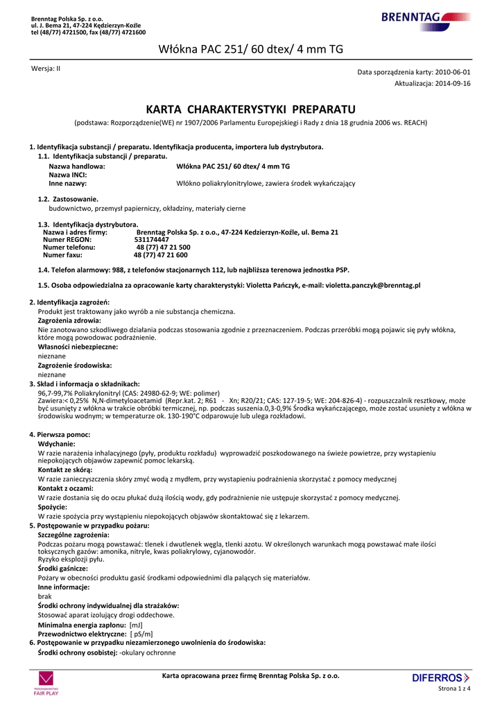 Brenntag Polska Sp. z o.o. ul. J. Bema 21, 47-224 Kędzierzyn-Koźle tel (48/77) 4721500, fax (48/77) 4721600 Włókna PAC 251/ 60 dtex/ 4 mm TG Wersja: II Data sporządzenia karty: 2010-06-01 Aktualizacja: 2014-09-16 KARTA CHARAKTERYSTYKI PREPARATU (podstawa: Rozporządzenie(WE) nr 1907/2006 Parlamentu Europejskiegi i Rady z dnia 18 grudnia 2006 ws. REACH) 1. Identyfikacja substancji / preparatu. Identyfikacja producenta, importera lub dystrybutora. 1.1. Identyfikacja substancji / preparatu. Nazwa handlowa: Włókna PAC 251/ 60 dtex/ 4 mm TG Nazwa INCI: Inne nazwy: Włókno poliakrylonitrylowe, zawiera środek wykańczający 1.2. Zastosowanie. budownictwo, przemysł papierniczy, okładziny, materiały cierne 1.3. Identyfikacja dystrybutora. Nazwa i adres firmy: Brenntag Polska Sp. z o.o., 47-224 Kedzierzyn-Koźle, ul. Bema 21 Numer REGON: 531174447 Numer telefonu: 48 (77) 47 21 500 Numer faxu: 48 (77) 47 21 600 1.4. Telefon alarmowy: 988, z telefonów stacjonarnych 112, lub najbliższa terenowa jednostka PSP. 1.5. Osoba odpowiedzialna za opracowanie karty charakterystyki: Violetta Pańczyk, e-mail: [email protected] 2. Identyfikacja zagrożeń: Produkt jest traktowany jako wyrób a nie substancja chemiczna. Zagrożenia zdrowia: Nie zanotowano szkodliwego działania podczas stosowania zgodnie z przeznaczeniem. Podczas przeróbki mogą pojawic się pyły włókna, które mogą powodowac podrażnienie. Własności niebezpieczne: nieznane Zagrożenie środowiska: nieznane 3. Skład i informacja o składnikach: 96,7-99,7% Poliakrylonitryl (CAS: 24980-62-9; WE: polimer) Zawiera:< 0,25% N,N-dimetyloacetamid (Repr.kat. 2; R61 - Xn; R20/21; CAS: 127-19-5; WE: 204-826-4) - rozpuszczalnik resztkowy, może być usunięty z włókna w trakcie obróbki termicznej, np. podczas suszenia.0,3-0,9% Środka wykańczającego, może zostać usuniety z włókna w środowisku wodnym; w temperaturze ok. 130-190°C odparowuje lub ulega rozkładowi. 4. Pierwsza pomoc: Wdychanie: W razie narażenia inhalacyjnego (pyły, produktu rozkładu) wyprowadzić poszkodowanego na świeże powietrze, przy wystapieniu niepokojących objawów zapewnić pomoc lekarską. Kontakt ze skórą: W razie zanieczyszczenia skóry zmyć wodą z mydłem, przy wystapieniu podrażnienia skorzystać z pomocy medycznej Kontakt z oczami: W razie dostania się do oczu płukać dużą ilością wody, gdy podrażnienie nie ustępuje skorzystać z pomocy medycznej. Spożycie: W razie spożycia przy wystąpieniu niepokojących objawów skontaktować się z lekarzem. 5. Postępowanie w przypadku pożaru: Szczególne zagrożenia: Podczas pożaru mogą powstawać: tlenek i dwutlenek węgla, tlenki azotu. W określonych warunkach mogą powstawać małe ilości toksycznych gazów: amonika, nitryle, kwas poliakrylowy, cyjanowodór. Ryzyko eksplozji pyłu. Środki gaśnicze: Pożary w obecności produktu gasić środkami odpowiednimi dla palących się materiałów. Inne informacje: brak Środki ochrony indywidualnej dla strażaków: Stosować aparat izolujący drogi oddechowe. Minimalna energia zapłonu: [mJ] Przewodnictwo elektryczne: [ pS/m] 6. Postępowanie w przypadku niezamierzonego uwolnienia do środowiska: Środki ochrony osobistej: -okulary ochronne Karta opracowana przez firmę Brenntag Polska Sp. z o.o. Strona 1 z 4 Brenntag Polska Sp. z o.o. ul. J. Bema 21, 47-224 Kędzierzyn-Koźle tel (48/77) 4721500, fax (48/77) 4721600 Włókna PAC 251/ 60 dtex/ 4 mm TG -rękawice ochronne Postępowanie przy wycieku lub wysypie substancji: Zapobiec przedostaniu się do kanalizacji; zabezpieczyć uszkodzone opakowania; unikać wzniecania pyłu; rozsypany produkt zebrać do zamykanego pojemnika i przekazać do zniszczenia. 7. Postępowanie z substancją / preparatem i magazynowanie: Magazynowanie: Przechowywać w zamknietych opakowaniach, w suchym pomieszczeniu z dala od źródeł ciepła i zapłonu. Postępowanie z substancją lub preparatem: Nie wdychać pyłu. Zapobiegać powstawaniu elektryczności statycznej. Unikać wzniecania pyłu. Zapewnić odpowiednią wentylację. 8. Kontrola narażenia i środki ochrony indywidualnej: Stosowane środki ochrony osobistej powinny spełniać wymogi Rozporządzenia Ministra Gospodarki z dnia 21 grudnia 2005 r. w sprawie zasadniczych wymagań dla środków ochrony indywidualnej (Dz.U. Nr 259, poz. 2173). Ochrona dróg oddechowych: przy zapyleniu - maska przeciwpyłowa Ochrona oczu: szczelne okulary ochronne Ochrona rąk: rękawice ochronne Techniczne środki ochronne: wentylacja pomieszczeń Inne wyposażenie ochronne: ubranie robocze Kontrola zagrożenia: Najwyższe dopuszczalne stężenia: -N,N-Dimetyloacetamid: NDS=35 mg/m3; NDSCh - 70 mg/m3 (wg Rozporządzenia MIPS z dn. 6 czerwca 2014, Dz.U. 2014, poz.817) Zalecenia dotyczące procedury monitoringu zawartości składników niebezpiecznych w powietrzu – metodyka pomiarów: -Rozporządzenie Ministra Zdrowia z dnia 20 kwietnia 2005 r. w sprawie badań i pomiarów czynników szkodliwych dla zdrowia w środowisku pracy (Dz.U. Nr 73, poz.645) -PN-89/Z-01001/06. Ochrona czystości powietrza. Nazwy, określenia i jednostki. Terminologia dotycząca badań jakości powietrza na stanowiskach pracy. -PN Z-04008-7:2002. Ochrona czystości powietrza. Pobieranie próbek. Zasady pobierania próbek powietrza w środowisku pracy i interpretacja wyników. -PN-EN-689: 2002. Powietrze na stanowiskach pracy – wytyczne oceny narażenia inhalacyjnego na czynniki chemiczne przez porównanie z wartościami dopuszczalnymi i strategia pomiarowa. Uwaga: Gdy stężenie substancji jest ustalone i znane, doboru środków ochrony indywidualnej należy dokonywać z uwzględnieniem stężenia substancji występującego na danym stanowisku pracy, czasu ekspozycji oraz czynności wykonywanych przez pracownika. W sytuacji awaryjnej, jeżeli stężenie substancji na stanowisku pracy nie jest znane, stosować środki ochrony indywidualnej o najwyższej zalecanej klasie ochrony. Pracodawca jest obo