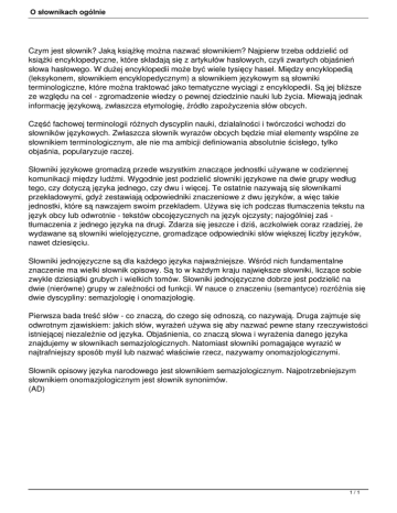 O słownikach ogólnie Czym jest słownik? Jaką książkę można nazwać słownikiem? Najpierw trzeba oddzielić od książki encyklopedyczne, które składają się z artykułów hasłowych, czyli zwartych objaśnień słowa hasłowego. W dużej encyklopedii może być wiele tysięcy haseł. Między encyklopedią (leksykonem, słownikiem encyklopedycznym) a słownikiem językowym są słowniki terminologiczne, które można traktować jako tematyczne wyciągi z encyklopedii. Są jej bliższe ze względu na cel - zgromadzenie wiedzy o pewnej dziedzinie nauki lub życia. Miewają jednak informację językową, zwłaszcza etymologię, źródło zapożyczenia słów obcych. Część fachowej terminologii różnych dyscyplin nauki, działalności i twórczości wchodzi do słowników językowych. Zwłaszcza słownik wyrazów obcych będzie miał elementy wspólne ze słownikiem terminologicznym, ale nie ma ambicji definiowania absolutnie ścisłego, tylko objaśnia, popularyzuje raczej. Słowniki językowe gromadzą przede wszystkim znaczące jednostki używane w codziennej komunikacji między ludźmi. Wygodnie jest podzielić słowniki językowe na dwie grupy według tego, czy dotyczą języka jednego, czy dwu i więcej. Te ostatnie nazywają się słownikami przekładowymi, gdyż zestawiają odpowiedniki znaczeniowe z dwu języków, a więc takie jednostki, które są nawzajem swoim przekładem. Używa się ich podczas tłumaczenia tekstu na język obcy lub odwrotnie - tekstów obcojęzycznych na język ojczysty; najogólniej zaś tłumaczenia z jednego języka na drugi. Zdarza się jeszcze i dziś, aczkolwiek coraz rzadziej, że wydawane są słowniki wielojęzyczne, gromadzące odpowiedniki słów większej liczby języków, nawet dziesięciu. Słowniki jednojęzyczne są dla każdego języka najważniejsze. Wśród nich fundamentalne znaczenie ma wielki słownik opisowy. Są to w każdym kraju największe słowniki, liczące sobie zwykle dziesiątki grubych i wielkich tomów. Słowniki jednojęzyczne dobrze jest podzielić na dwie (nierówne) grupy w zależności od funkcji. W nauce o znaczeniu (semantyce) rozróżnia się dwie dyscypliny: semazjologię i onomazjologię. Pierwsza bada treść słów - co znaczą, do czego się odnoszą, co nazywają. Druga zajmuje się odwrotnym zjawiskiem: jakich słów, wyrażeń używa się aby nazwać pewne stany rzeczywistości istniejącej niezależnie od języka. Objaśnienia, co znaczą słowa i wyrażenia danego języka znajdujemy w słownikach semazjologicznych. Natomiast słowniki pomagające wyrazić w najtrafniejszy sposób myśl lub nazwać właściwie rzecz, nazywamy onomazjologicznymi. Słownik opisowy języka narodowego jest słownikiem semazjologicznym. Najpotrzebniejszym słownikiem onomazjologicznym jest słownik synonimów. (AD) 1/1