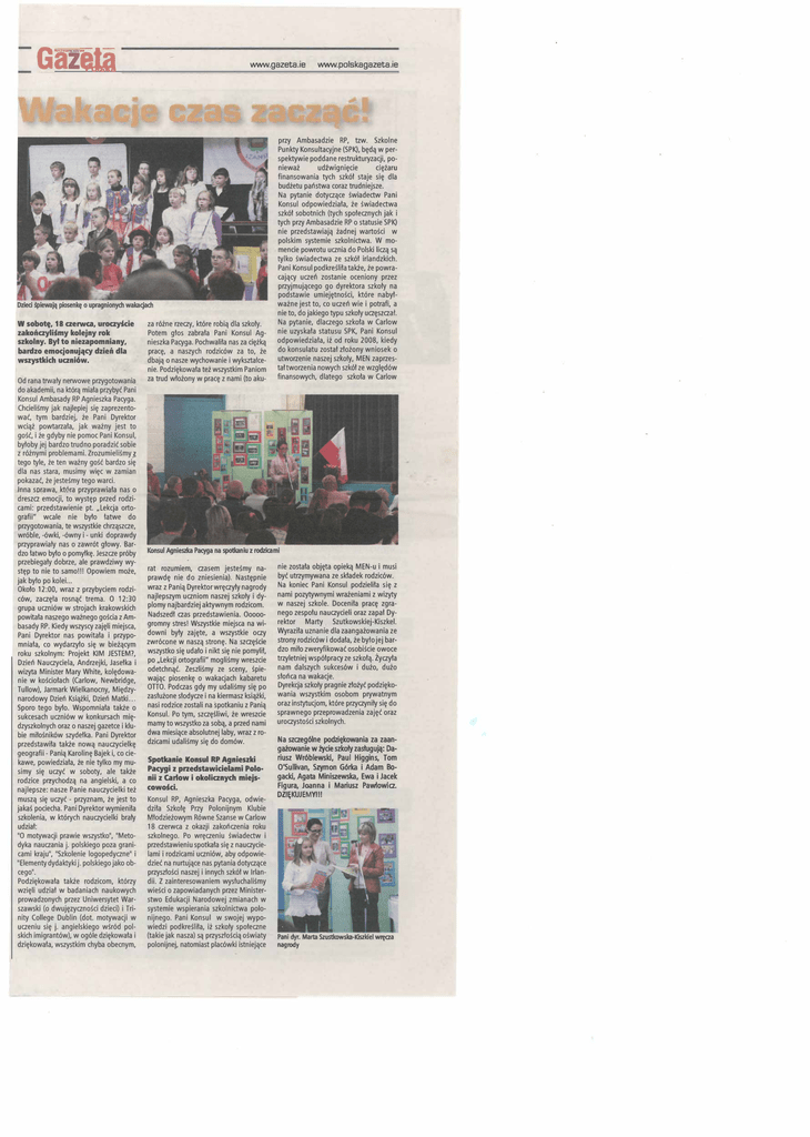 - G lzłila W sobott, 18 aerwca, uroayście zakońayliśmy kolejny rok szkolny. Byt to niezapomniany, bardzo emocjonujący dzień dla wszystkich uani6w. Od rana trwały nerwowe przygotowania do akademii, na którą miała przybyć Pani Konsul Ambasady RP Agnieszka Pacyga. Chcieliśmy jak najlepiej się zaprezento wać, tym bardziej, że Pani Dyrektor wciąż powtarzała, jak ważny jest to gość, i że gdyby nie pomoc Pani Konsul. byłoby jej bardzo trudno poradzić sobie z różnymi problemami. Zrozumieliśmy J,_ tego tyle, że ten ważny gość bardzo się dla nas stara, musimy więc w zamian pokazać, że jesteśmy tego warci. Inna sorawa, która przyprawiała nas o dresza emocji, to występ przed rodzi cami: przedstawienie pt. .. Lekcja orto grafii" wcale nie było łatwe do przygotowania, te wszystkie chrząszae, wróble, -ówki, -ówny i - unki doprawdy przyprawiały nas o zawrót głowy. Bar dzo łatwo było o pomyłkę. Jeszae próby przebiegały dobrze, ale prawdziwy wy stęp to nie to samo!!! Opowiem może, jak byto po kolei... Około 12 :OO, wraz z przybyciem rodzi ców, zaaęla rosnąć trema. O 12:30 grupa uaniów w strojach krakowskich powitała naszego ważnego gościa z Am basady RP. Kiedy wszyscy zajęli miejsca, Pani Dyrektor nas powitała i przypo mniała, co wydarzyło się w bieżącym roku szkolnym: Projekt KIM JESTEM?, Dzień Nauayciela, Andrzejki, Jasełka i wizyta Minister Mary White, kolędowa nie w kościołach (Carlow, Newbridge, Tullow), Jarmark Wielkanocny, Między narodowy Dzień Książki, Dzień Matki ... Sporo tego było. Wspomniała także o sukcesach uaniów w konkursach mię dzyszkolnych oraz o naszej gazetce i klu bie miłośników szydełka. Pani Dyrektor przedstawiła także nową nauaycielkę geografii - Panią Karolinę Bajek i, co cie kawe, powiedziała, że nie tylko my mu simy się uayć w soboty, ale także rodzice prlychodzą na angielski, a co najlepsze: nasze Panie nauaycielki też muszą się uayć - przyznam, że jest to jakaś pociecha. Pani Dyrektor wymieniła szkolenia, w których nauaycielki brały udział: "O motywacji prawie wszystko", "Meto dyka nauaania j. polskiego poza grani cami kraju", "Szkolenie logopedyane" i "Elementy dydaktyki j. polskiego jako ob cego". Podziękowała także rodzicom, którzy wzięli udział w badaniach naukowych prowadzonych przez Uniwersytet War szawski (o dwujęzyaności dzieci) i Tri nity College Dublin (dot. motywacji w uaeniu się j. angielskiego wśród pol skich imigrantów), w ogóle dziękowała i dziękowała, wszystkim chyba obecnym, www.gazeta.ie za różne rzeczy, które robią dla szkoły. Potem głos zabrała Pani Konsul Ag nieszka Pacyga. Pochwaliła nas za ciężką pracę, a naszych rodziców za to, że dbają o nasze wychowanie i wyksztalce nie. Podziękowała też wszystkim Paniom za trud włożony w pracę z nami (to aku- rat rozumiem, aasem jesteśmy na prawdę nie do zniesienia). Następnie wraz z Panią Dyrektor wręayły nagrody najlepszym uaniom naszej szkoły i dy plomy najbardziej aktywnym rodzicom. Nadszedł aas przedstawienia. Ooooo gromny stres! Wszystkie miejsca na wi downi byty zajęte, a wszystkie oay zwrócone w naszą stronę. Na szaęście wszystko się udało i nikt się nie pomylił, po „Lekcji ortografii" mogliśmy wreszcie odetchnąć. Zeszliśmy ze sceny, śpie wając piosenkę o wakacjach kabaretu OTTO. Podaas gdy my udaliśmy się po zasłużone słodyae i na kiermasz książki, nasi rodzice zostali na spotkaniu z Panią Konsul. Po tym, szaęśliwi, że wreszcie mamy to wszystko za sobą, a przed nami dwa miesiące absolutnej laby, wraz z ro dzicami udaliśmy się do domów. www.polskagazeta.ie przy Ambasadzie RP, tzw. Szkolne Punkty Konsultacyjne (SPK), będą w per spektywie poddane restrukturyzacji, po nieważ udźwignięcie C1ęzaru finansowania tych szkół staje się dla budżetu państwa coraz trudniejsze. Na pytanie dotyaące świadectw Pani Konsul odpowiedziała, że świadectwa szkół sobotnich (tych społeanych jak i tych przy Ambasadzie RP o statusie SPK) nie przedstawiają żadnej wartości w polskim systemie szkolnictwa. W mo mencie powrotu uania do Polski liaą są tylko świadectwa ze szkół irlandzkich. Pani Konsul podkreśliła także, że powra cający uaeń zostanie oceniony przez przyjmującego go dyrektora szkoły na podstawie umiejętności, które nabył ważne jest to, co uaeń wie i potrafi, a nie to, do jakiego typu szkoły uaęszaał. Na pytanie, dlaaego szkoła w Carlow nie uzyskała statusu SPK, Pani Konsul odpowiedziała, iż od roku 2008, kiedy do konsulatu został złożony wniosek o utworzenie naszej szkoły, MEN zaprzes tał tworzenia nowych szkół ze względów finansowych, dlatego szkoła w Carlow nie została objęta opieką MEN-u i musi być utrzymywana ze składek rodziców. Na koniec Pani Konsul podzieliła się z nami pozytywnymi wrażeniami z wizyty w naszej szkole. Doceniła pracę zgra nego zespołu nauczycieli oraz zapal Dy rektor Marty Szutkowskiej-Kiszkel. Wyraziła uznanie dla zaangażowania ze strony rodziców i dodała, że było jej bar dzo miło zweryfikować osobiście owoce trzyletniej współpracy ze szkołą. Żyayła nam dalszych sukcesów i dużo, dużo słońca na wakacje. Dyrekcja szkoły pragnie złożyć podzięko wania wszystkim osobom prywatnym oraz instytucjom, które przyczyniły się do sprawnego przeprowadzenia zajęć oraz uroczystości szkolnych. Spotkanie Konsul RP Agnieszki Pacygi z przedstawicielami Polo· nii z Carlow i okolianych miejs cowości. Na szczególne podziękowania za zaan gażowanie w życie szkoły zasługują: Da riusz Wróblewski, Paul Higgins, Tom O'Sullivan, Szymon Górka i Adam Bo gacki, Agata Miniszewska, Ewa i Jacek Figura, Joanna i Mariusz Pawłowicz. Konsul RP, Agnieszka Pacyga, odwie dziła Szkołę Przy Polonijnym Klubie Młodzieżowym Równe Szanse w Carlow 18 aerwca z okazji zakońaenia roku szkolnego. Po wręaeniu świadectw i przedstawieniu spotkała si