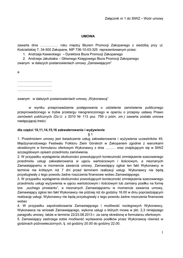 Załącznik nr 1 do SIWZ – Wzór umowy UMOWA zawarta dnia ……………. roku między Biurem Promocji Zakopanego z siedzibą przy ul. Kościeliskiej 7, 34-500 Zakopane, NIP 736-10-03-325 reprezentowanym przez: 1. Andrzeja Kaweckiego – Dyrektora Biura Promocji Zakopanego 2. Andrzeja Jakubiaka – Głównego Księgowego Biura Promocji Zakopanego zwanym w dalszych postanowieniach umowy „Zamawiającym” a …………………………. …………………………. …………………………. zwanym w dalszych postanowieniach umowy „Wykonawcą” w wyniku przeprowadzenia postępowania o udzielenie zamówienia publicznego przeprowadzonego w trybie przetargu nieograniczonego w oparciu o przepisy ustawy Prawo zamówień publicznych (Dz.U. z 2010 Nr 113 poz. 759 z późn. zm.) zawarta została umowa następującej treści: dla części 10,11,14,15,16 zakwaterowanie i wyżywienie §1 1. Przedmiotem umowy jest świadczenie usług zakwaterowania i wyżywienia uczestników 45. Międzynarodowego Festiwalu Folkloru Ziem Górskich w Zakopanem zgodnie z warunkami określonymi w formularzu ofertowym Wykonawcy z dnia ……… oraz znajdującym się w SIWZ szczegółowym opisem przedmiotu zamówienia. 2. W przypadku wystąpienia okoliczności powodujących konieczność zmniejszenia szacowanego przedmiotu usługi zakwaterowania w ujęciu wartościowym i ilościowym, a nieznanych Zamawiającemu w momencie zawarcia umowy, Zamawiający zgłosi ten fakt Wykonawcy w terminie nie krótszym niż 7 dni przed terminem realizacji usługi. Wykonawcy nie będą przysługiwały z tego powodu żadne roszczenia finansowe wobec Zamawiającego. 3. W przypadku wystąpienia okoliczności powodujących konieczność zmniejszenia szacowanego przedmiotu usługi wyżywienia w ujęciu wartościowym i ilościowym lub zamiany posiłku na formę tzw. „suchego prowiantu”, a nieznanych Zamawiającemu w momencie zawarcia umowy, Zamawiający zgłosi ten fakt Wykonawcy nie później niż do godziny 16.00 w dniu poprzedzającym realizację usługi. Wykonawcy nie będą przysługiwały z tego powodu żadne roszczenia finansowe wobec 4. W przypadku zapotrzebowania Zamawiającego i możliwość noclegowych Wykonawcy, Wykonawca na wniosek Zamawiającego, wykona usługi o których mowa w pkt. 2,3 niniejszego paragrafu umowy, także w terminie 22/23.08.2013 r. za cenę określoną w formularzu ofertowym. 5. Zamawiający zastrzega sobie możliwość wydawania posiłków przez Wykonawcę również w godzinach późnowieczornych, tj. od godziny 20.00 do godziny 22.00. 1 6. W przypadku równoczesnego zakwaterowania w obiekcie innych gości Wykonawca bierze na siebie pełną odpowiedzialność za ewentualne nieporozumienia wynikłe z późnych powrotów uczestników MFFZG z koncertów, czy przeprowadzania prób. 7. Wszelkie roszczenia w związku z ewentualnymi zniszczeniami lub uszkodzeniami spowodowanymi przez uczestników MFFZG, Wykonawca będzie kierował bezpośrednio do nich, a Zamawiający nie ponosi żadnej odpowiedzialności za powyższe straty. §2 1.Całkowita kwota za świadczenie usług określonych w § 1 nie przekroczy ……………….zł brutto (słownie: ………………………………………………………zł brutto) z zastrzeżeniem § 1 ust. 4. 2.Kwota wymieniona w w/w punkcie zawiera także koszt udostępnienia sali do prób oraz parkingu dla autokaru 3.Należność za wykonanie usługi będzie płatna przelewem po jej wykonaniu w terminie 21 dni od daty otrzymania faktury wraz ze szczegółową kalkulacją kosztów oraz potwierdzeniem przez Wykonawcę listy osób zakwaterowanych §3 Ustala się odpowiedzialność za niewykonanie lub nienależyte wykonanie przedmiotu umowy: 1. W przypadku odstąpienia od umowy lub braku możliwości udostępnienia ustalonej liczby miejsc noclegowych przez Wykonawcę, zapłaci on Zamawiającemu karę umowną w wysokości 30% ustalonej stawki osobodnia dla jednej osoby brutto za każde zarezerwowane i nie udostępnione miejsce. 2. W przypadku całkowitej rezygnacji z rezerwacji miejsc po terminie podanym w § 1 pkt. 2 Zamawiający zobowiązuje się do zapłacenia Wykonawcy karę umowną w wysokości 30% ustalonej stawki osobodnia dla jednej osoby brutto za każde zarezerwowane i niewykorzystane miejsce. 3. W przypadku rażącego naruszenia postanowień niniejszej umowy, Zamawiający może rozwiązać umowę ze skutkiem natychmiastowym w drodze pisemnego powiadomienia Wykonawcy. dla części 17 zakwaterowanie i wyżywienie §1 1. Przedmiotem umowy jest świadczenie usług zakwaterowania i wyżywienia uczestników 45. Międzynarodowego Festiwalu Folkloru Ziem Górskich w Zakopanem zgodnie z warunkami określonymi w formularzu ofertowym Wykonawcy z dnia ……… oraz znajdującym się w SIWZ szczegółowym opisem przedmiotu zamówienia. 2. W przypadku wystąpienia okoliczności powodujących konieczność zmniejszenia szacowanego przedmiotu usługi zakwaterowania w ujęciu wartościowym i ilościowym, a nieznanych Zamawiającemu w momencie zawarcia umowy, Zamawiający zgłosi ten fakt Wykonawcy w terminie nie krótszym niż 7 dni przed terminem realizacji usługi. Wykonawcy nie będą przysługiwały z tego powodu żadne roszczenia finansowe wobec Zamawiającego. 3. W przypadku wystąpienia okoliczności powodujących konieczność zmniejszenia szacowanego przedmiotu usługi wyżywienia w ujęciu wartościowym i ilościowym, a nieznanych Zamawiającemu w momencie zawarcia umowy, Zamawiający zgłosi ten fakt Wykonawcy nie później niż do godziny 16.00 w dniu poprzedzającym realizację usługi. Wykonawcy nie będą przysługiwały z tego powodu żadne roszczenia finansowe wobec Zamawiającego. 4. W przypadku zapotrzebowania Zamawiającego i możliwość noclegowych Wykonawcy, Wykonawca na wniosek Zamawiającego, wykona usługi o których mowa w pkt. 2,3 niniejszego paragrafu umowy, także w terminie 22/23.08.2013 r. za cenę określoną w formularzu ofertowym. 5.