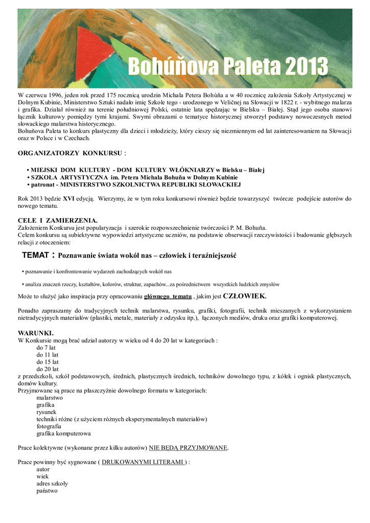 Bohúňova Paleta 2013 W czerwcu 1996, jeden rok przed 175 rocznicą urodzin Michala Petera Bohúňa a w 40 rocznicę założenia Szkoły Artystycznej w Dolnym Kubinie, Ministerstwo Sztuki nadało imię Szkole tego - urodzonego w Veličnej na Słowacji w 1822 r. - wybitnego malarza i grafika. Działał również na terenie południowej Polski, ostatnie lata spędzając w Bielsku – Białej. Stąd jego osoba stanowi łącznik kulturowy pomiędzy tymi krajami. Swymi obrazami o tematyce historycznej stworzył podstawy nowoczesnych metod słowackiego malarstwa historycznego. Bohuňova Paleta to konkurs plastyczny dla dzieci i młodzieży, który cieszy się niezmiennym od lat zainteresowaniem na Słowacji oraz w Polsce i w Czechach. ORGANIZATORZY KONKURSU : • MIEJSKI DOM KULTURY - DOM KULTURY WŁÓKNIARZY w Bielsku – Białej • SZKOŁA ARTYSTYCZNA im. Petera Michala Bohuňa w Dolnym Kubinie • patronat - MINISTERSTWO SZKOLNICTWA REPUBLIKI SŁOWACKIEJ Rok 2013 będzie XVI edycją. Wierzymy, że w tym roku konkursowi również będzie towarzyszyć twórcze podejście autorów do nowego tematu. CELE I ZAMIERZENIA. Założeniem Konkursu jest popularyzacja i szerokie rozpowszechnienie twórczości P. M. Bohuňa. Celem konkursu są subiektywne wypowiedzi artystyczne uczniów, na podstawie obserwacji rzeczywistości i budowanie głębszych relacji z otoczeniem: TEMAT : Poznawanie świata wokół nas – człowiek i teraźniejszość ● poznawanie i konfrontowanie wydarzeń zachodzących wokół nas ● analiza znaczeń rzeczy, kształtów, kolorów, struktur, zapachów...za pośrednictwem wszystkich ludzkich zmysłów Może to służyć jako inspiracja przy opracowaniu głównego tematu , jakim jest CZŁOWIEK. Ponadto zapraszamy do tradycyjnych technik malarstwa, rysunku, grafiki, fotografii, technik mieszanych z wykorzystaniem nietradycyjnych materiałów (plastiki, metale, materiały z odzysku itp.), łączonych mediów, druku oraz grafiki komputerowej. WARUNKI. W Konkursie mogą brać udział autorzy w wieku od 4 do 20 lat w kategoriach : do 7 lat do 11 lat do 15 lat do 20 lat z przedszkoli, szkół podstawowych, średnich, plastycznych średnich, techników dowolnego typu, z kółek i ognisk plastycznych, domów kultury. Przyjmowane są prace na płaszczyźnie dowolnego formatu w kategoriach: malarstwo grafika rysunek techniki różne (z użyciem różnych eksperymentalnych materiałów) fotografia grafika komputerowa Prace kolektywne (wykonane przez kilku autorów) NIE BĘDĄ PRZYJMOWANE. Prace powinny być sygnowane ( DRUKOWANYMI LITERAMI ) : autor wiek adres szkoły państwo Każdy autor może przesłać tylko JEDNĄ pracę. Prac nie należy oprawiać w passepartout. Prosimy opiekunów o dołączenie do zestawu prac spisu zawierającego nazwiska autorów wraz z tytułami prac. Prace przyjmowane będą do 24.06.2013 r. (decyduje data stempla pocztowego) na adres : Miejski Dom Kultury – Dom Kultury Włókniarzy ul. 1 Maja 12 43-300 Bielsko-Biała Prace będą oceniane przez komisję międzynarodową, a jej skład umieszczony zostanie w katalogu. W każdej kategorii wiekowej przyznane zostaną złote, srebrne i brązowe pasma oraz wyróżnienia. Nagroda Główna – Grand Prix, zostanie wykorzystana przy tworzeniu katalogu i dyplomów. Wyniki konkursu zostaną ustalone we wrześniu 2013 r. Laureaci otrzymują dyplomy oraz katalog w formie elektronicznej. Otwarcie wystawy połączone z podsumowaniem konkursu i wręczeniem nagród będzie miało miejsce we wrześniu 2013 r. w Dolnym Kubinie na Słowacji a następnie w listopadzie 2013 r. w Bielsku-Białej. Ekspozycje nagrodzonych prac : Bielsko-Biała – Miejski Dom Kultury – Galeria Domu Kultury Włókniarzy Dolny Kubin - Oravská Galéria Prace przysłane na konkurs nie będą zwracane autorom, pozostają w archiwum. Autorzy tym samym wyrażają zgodę na ewentualne publikacje ich prac w materiałach związanych z konkursem. Wyniki konkursu będą zamieszczone na oficjalnej stronie szkoły www.zuspmb.sk
